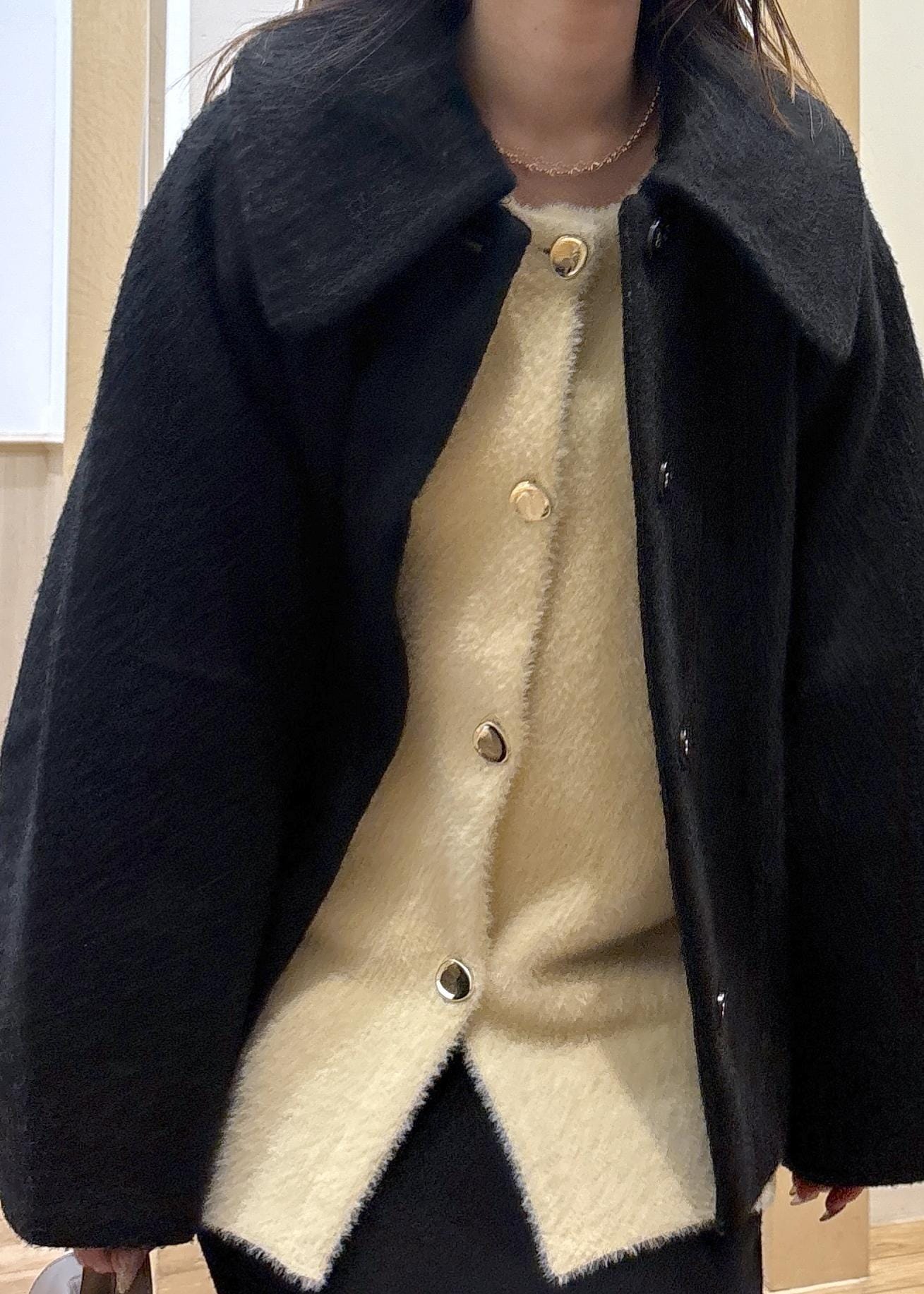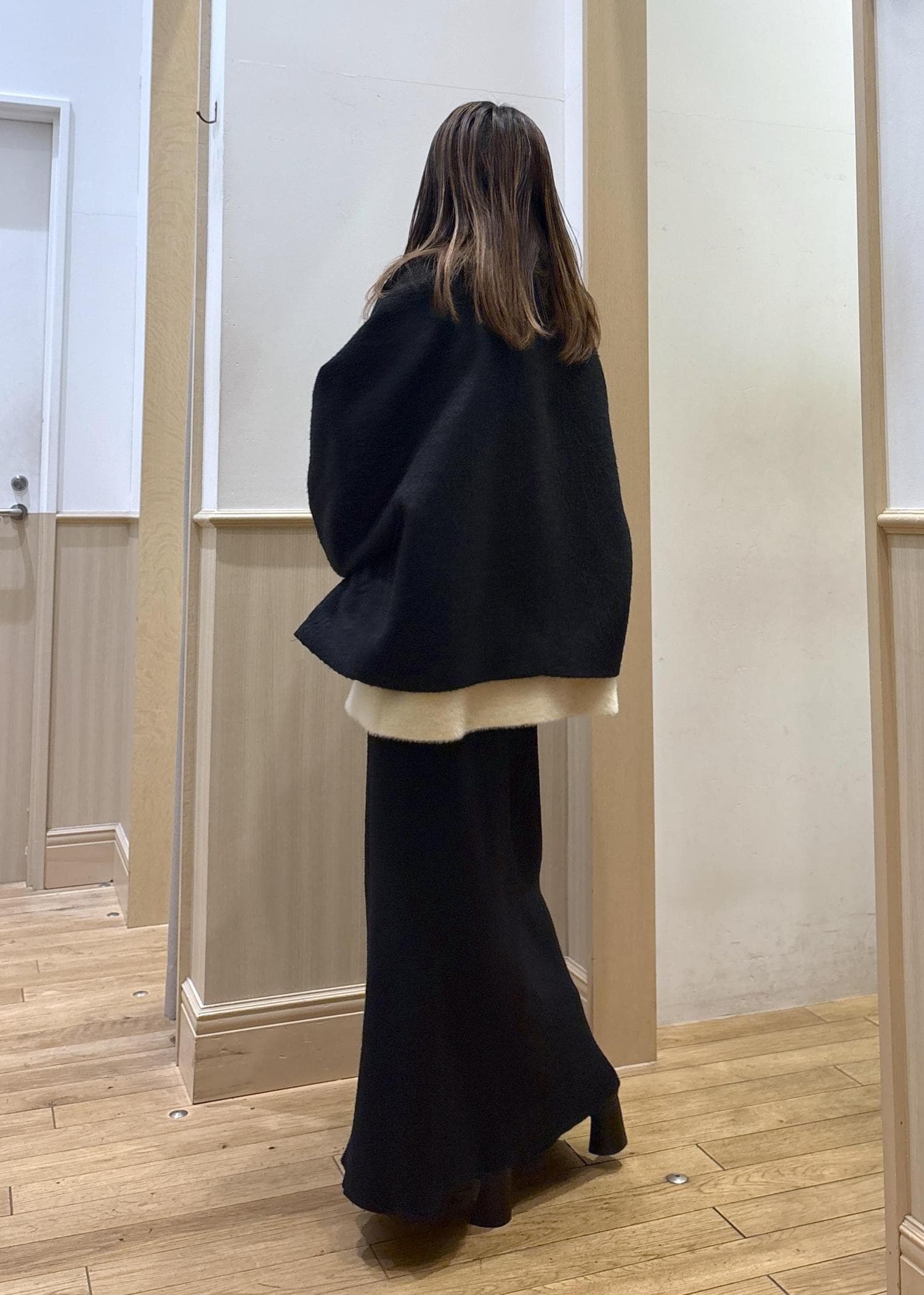 Mサイズだと、しっかり大きめなサイズ感ですが、ニットなど厚手のインナーアイテムの形を一切拾わず、見たままのアウターの綺麗な形で着用できます。 -