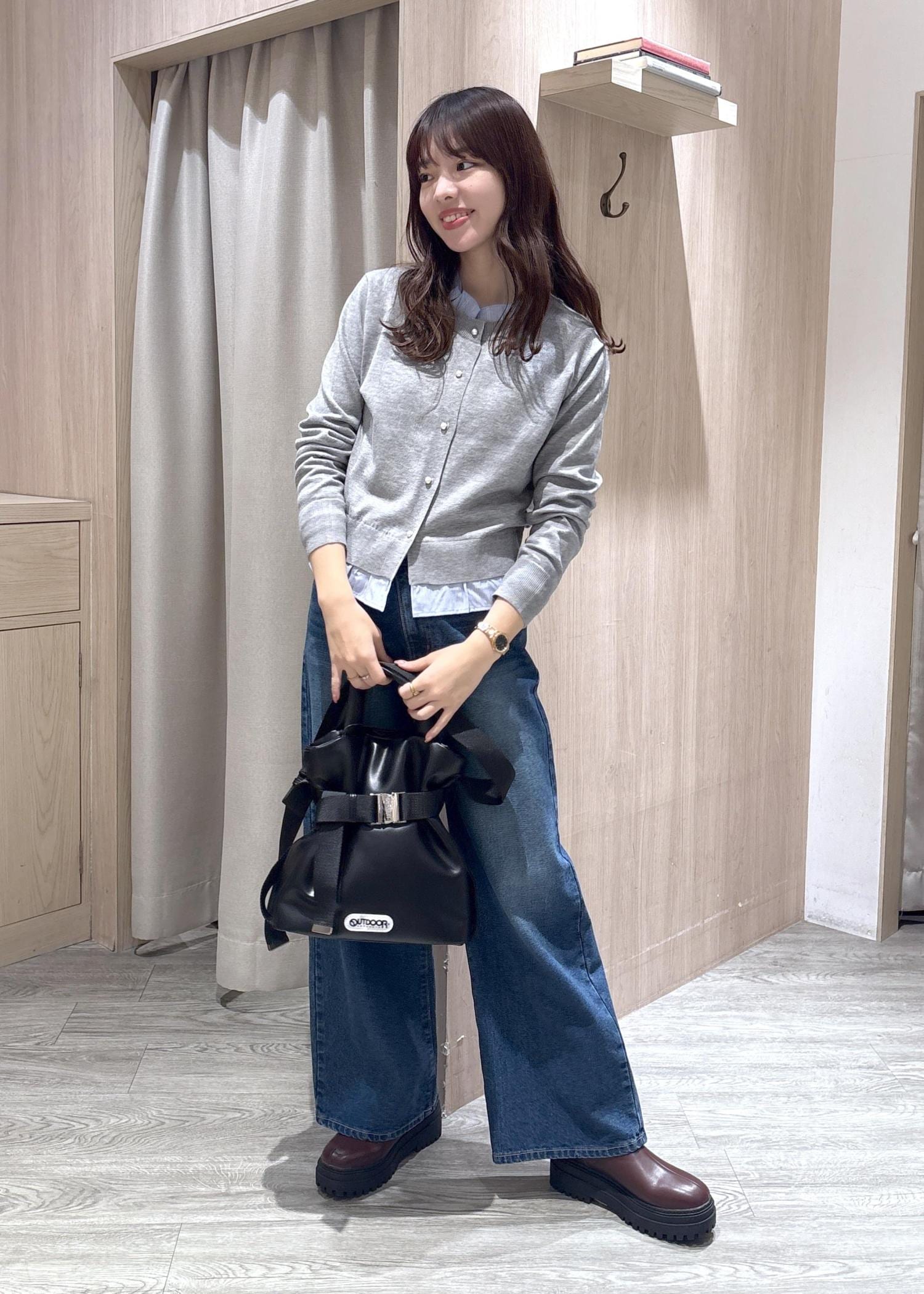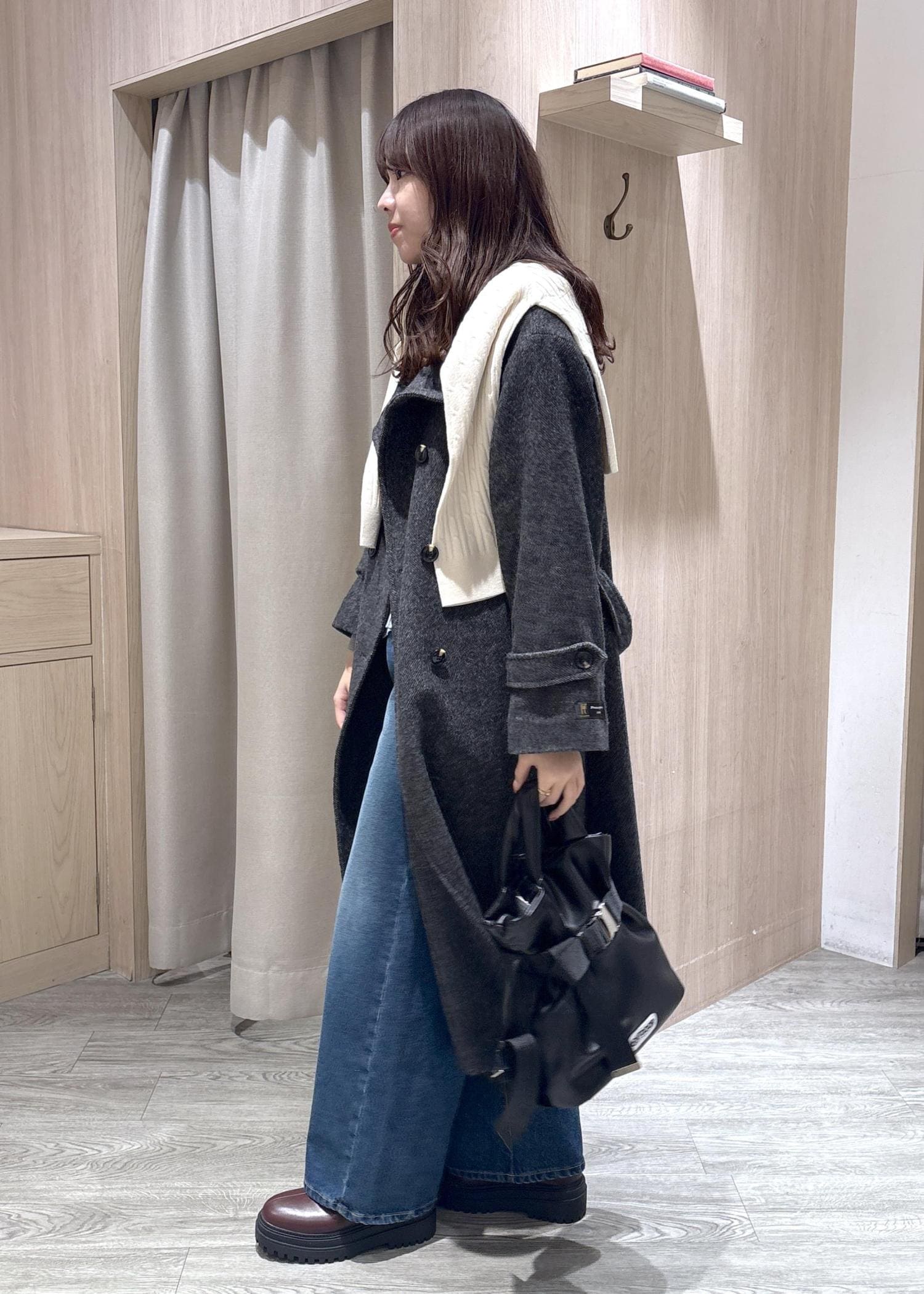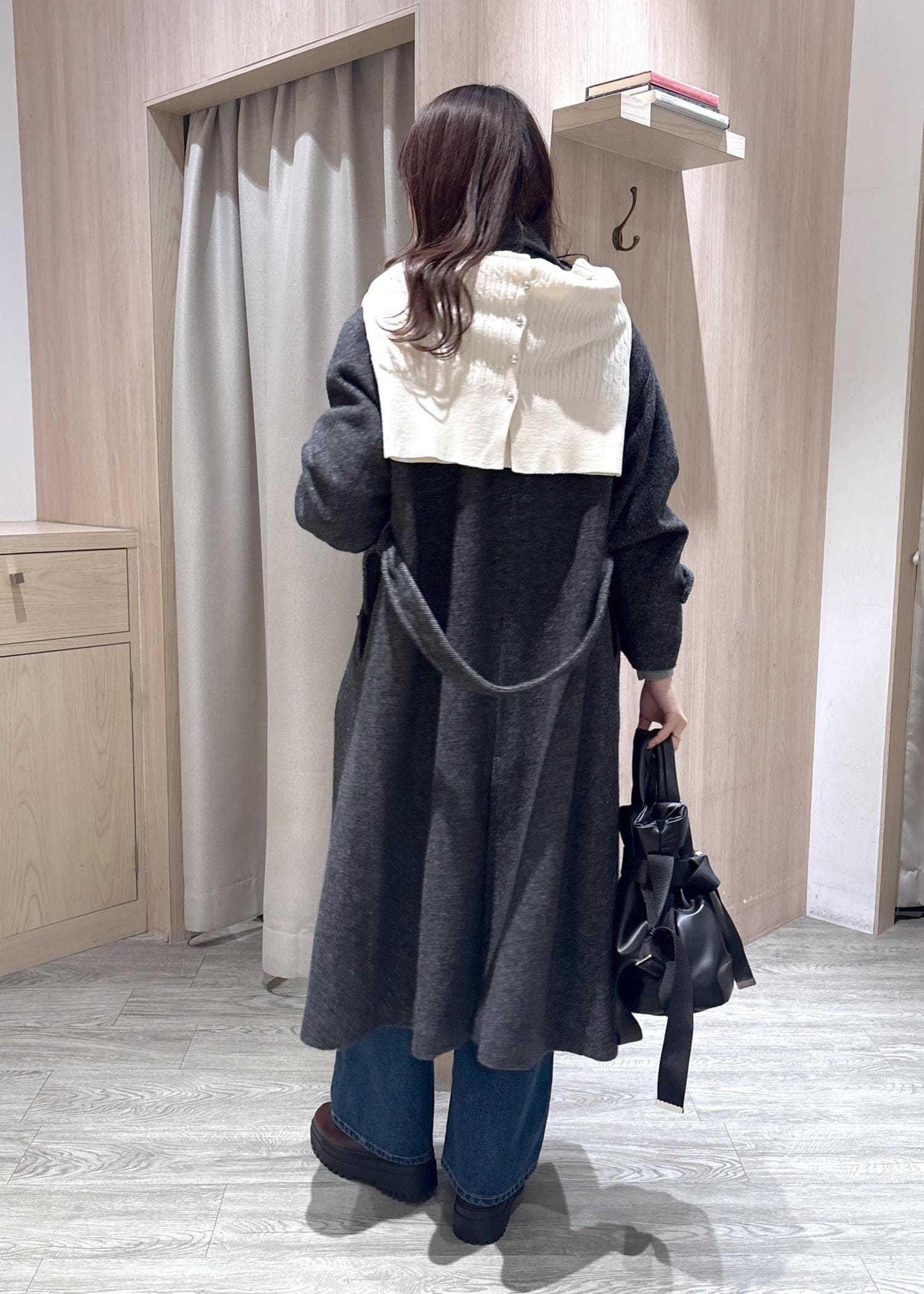 暗くなりすぎないようにコートの上からカーディガンをレイヤードしました。ベーシックなカラーでもワンポイントになるのでオススメです♪