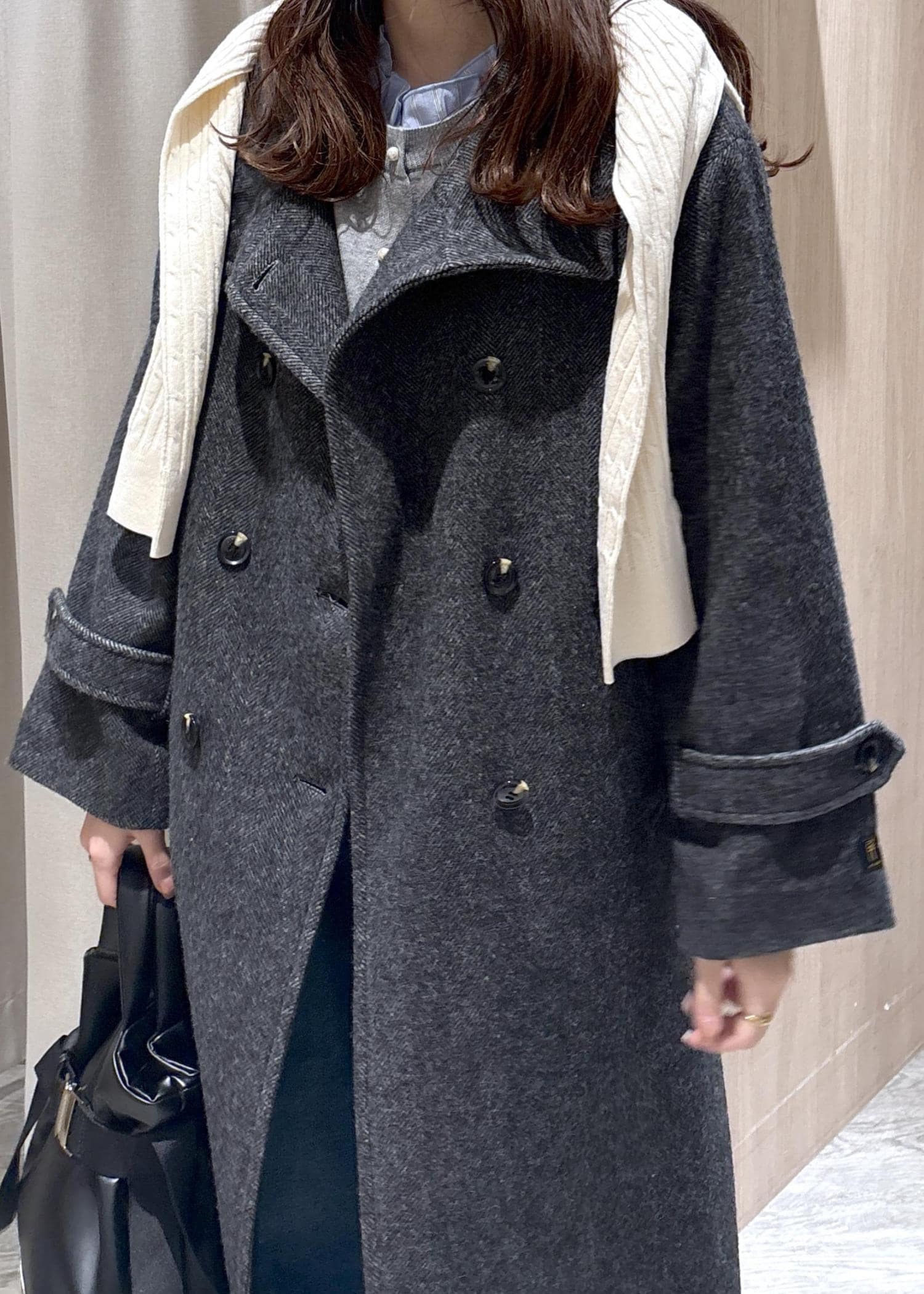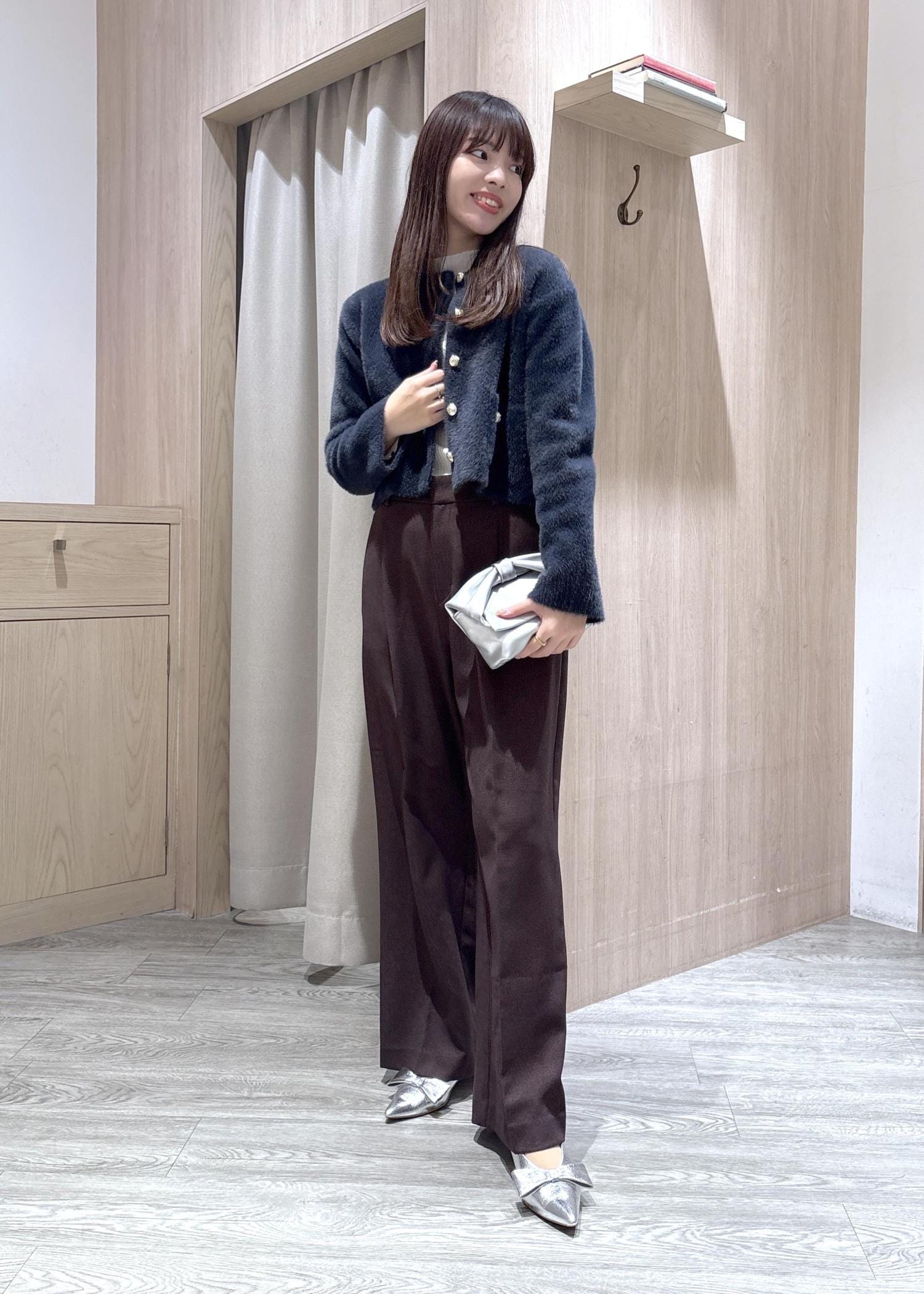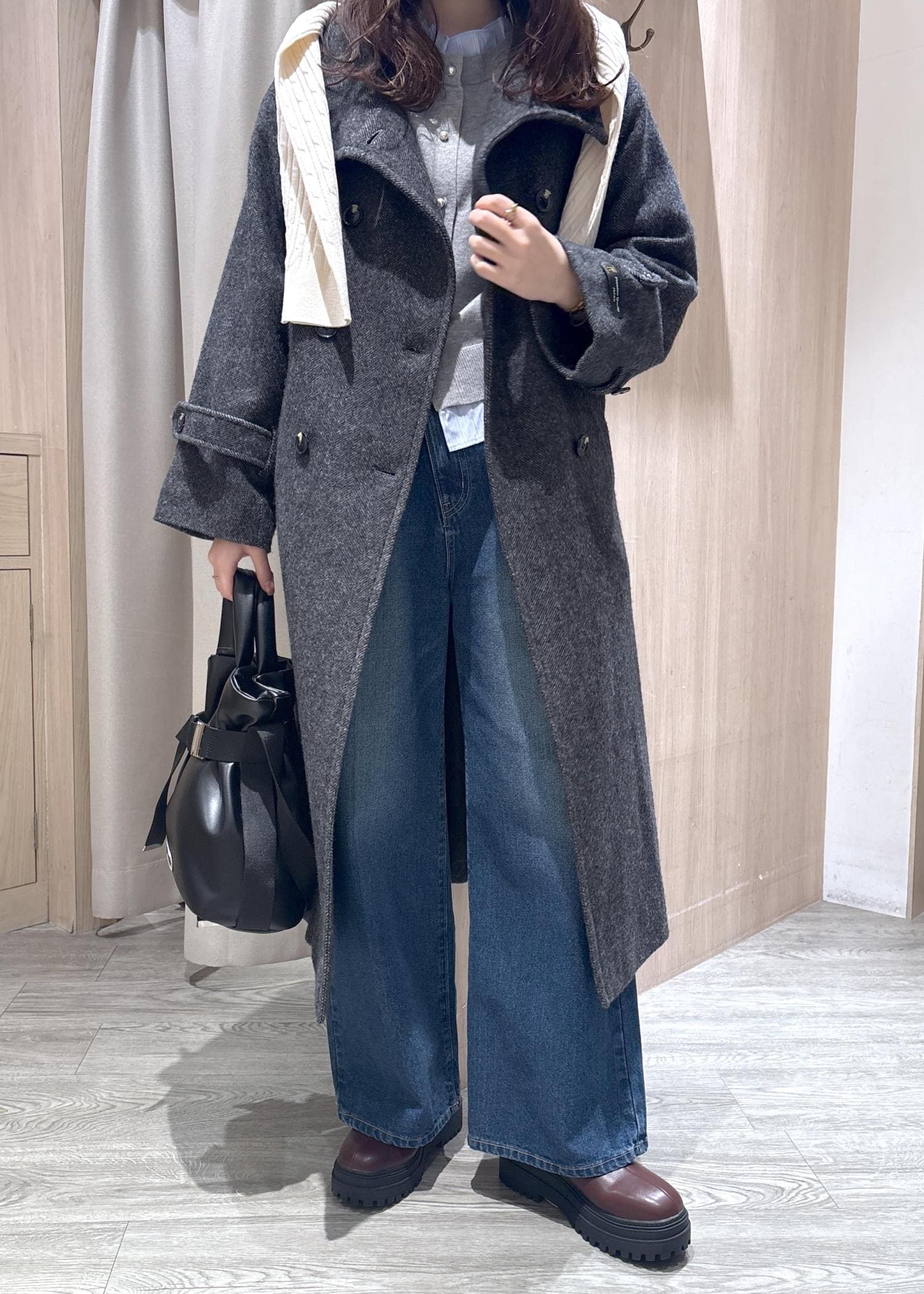 暗くなりすぎないようにコートの上からカーディガンをレイヤードしました。ベーシックなカラーでもワンポイントになるのでオススメです♪