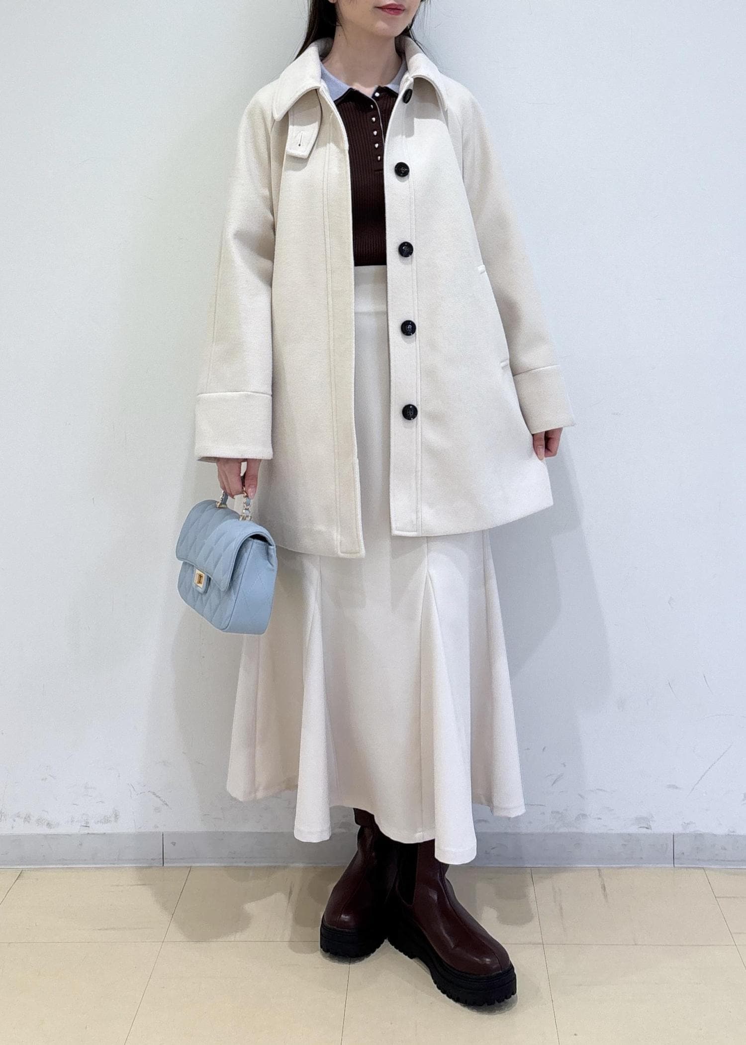フレアシルエットが女性らしい印象です。少しゆとりがあるので厚手のトップスを着ていても羽織りやすく、軽いのでストレスフリーで着用できます。