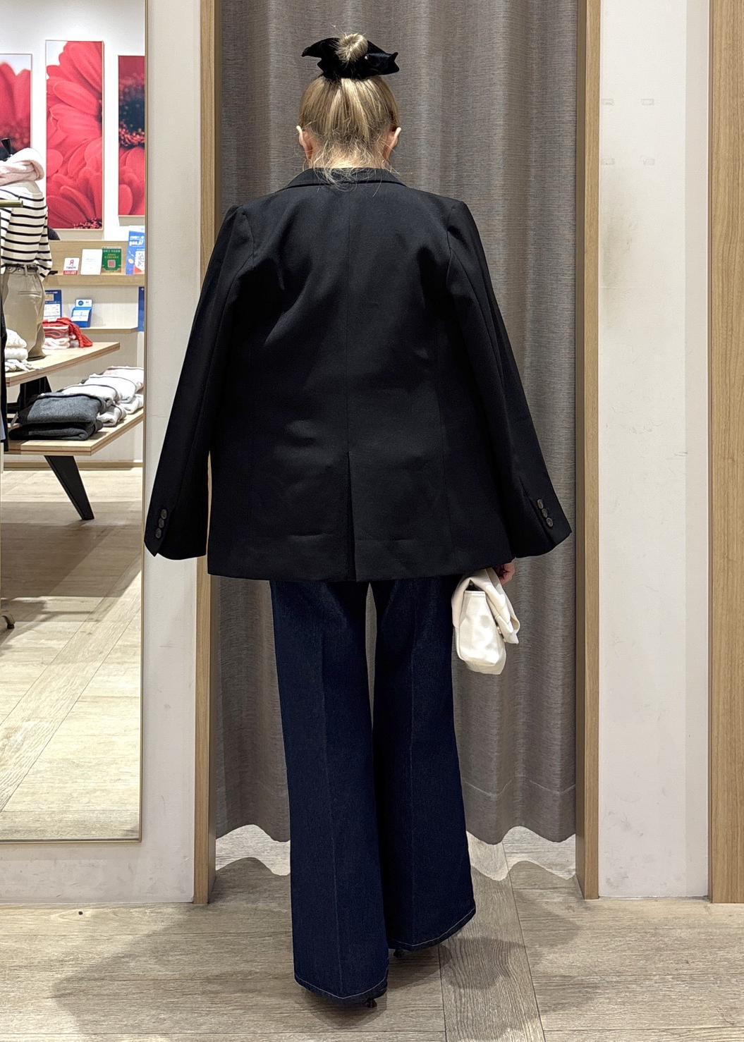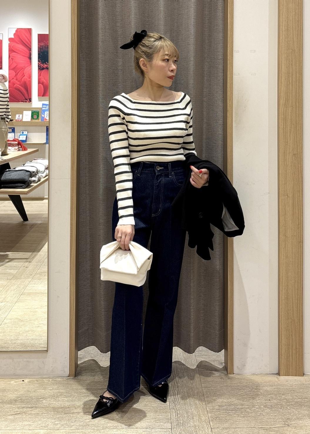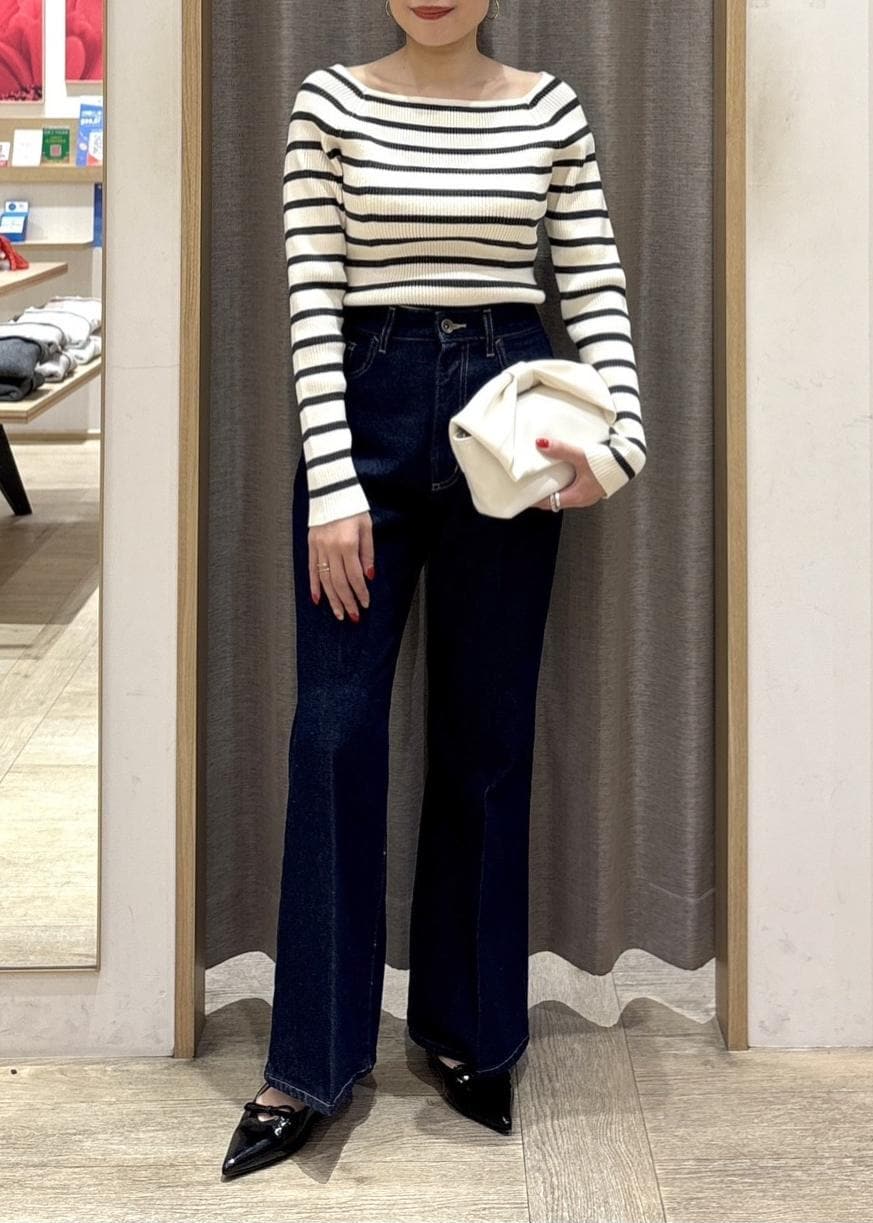 コンパクトなトップスとフレアデニムの組み合わせが、自然とスタイルアップを叶えてくれます。