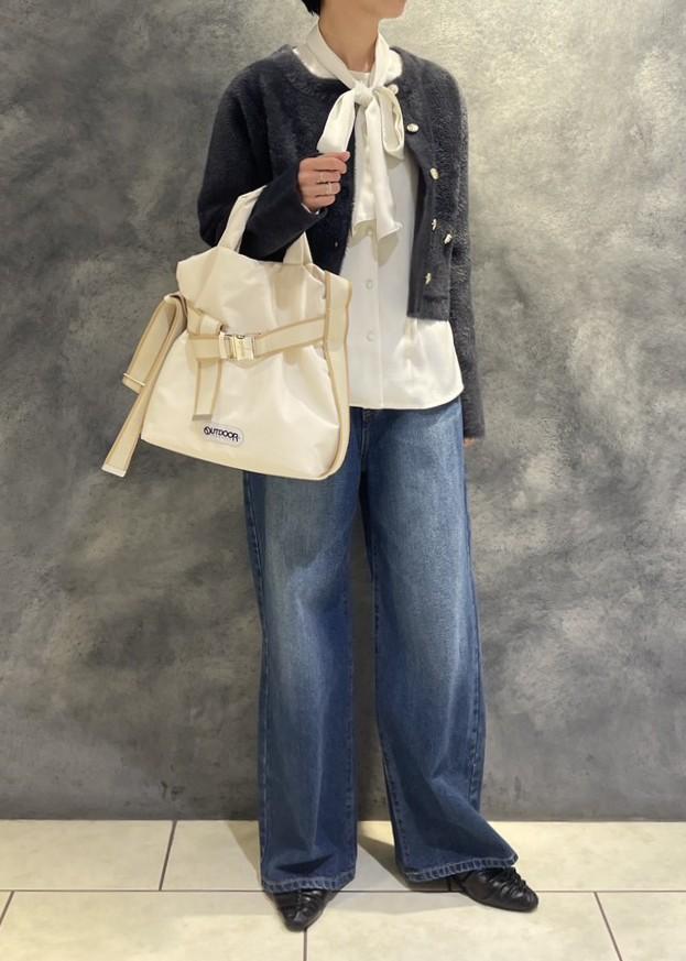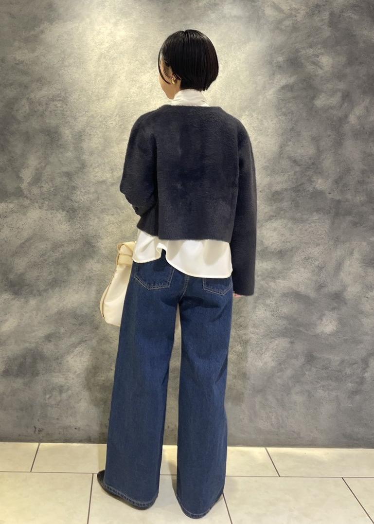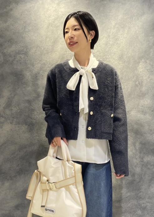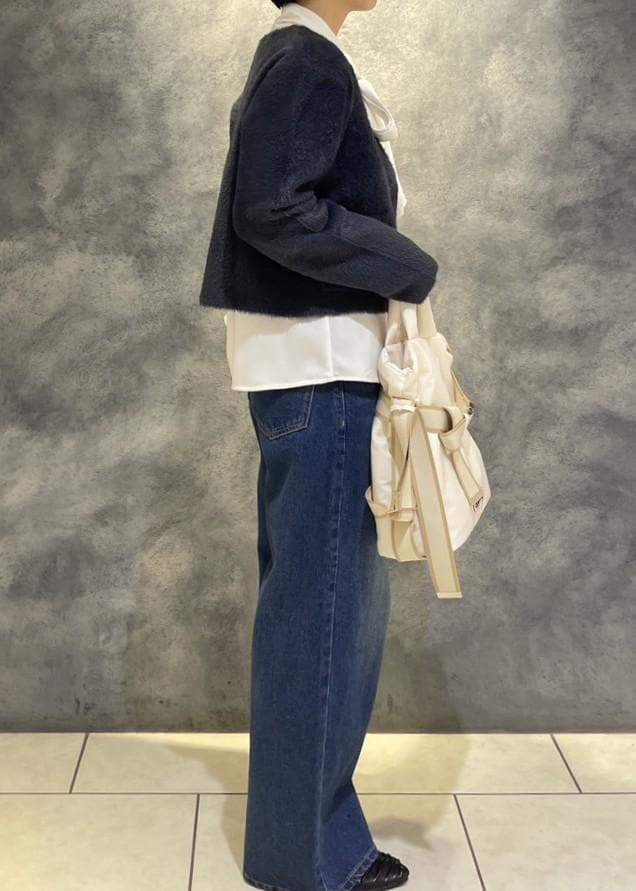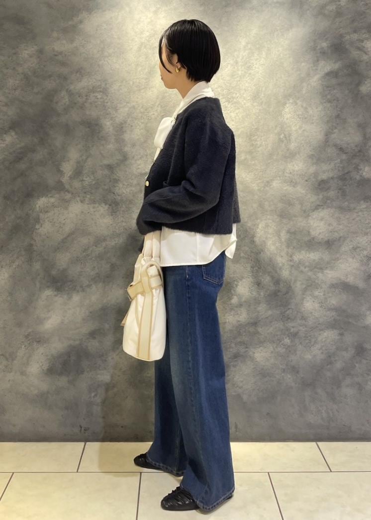 フェザーカーディガン✕デニムを、ボウタイブラウスやコンパクトな丈のカーディガンを合わせる事で今っぽいシルエットになります。