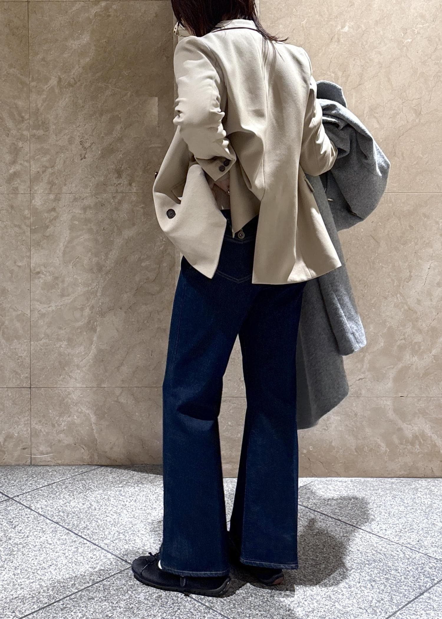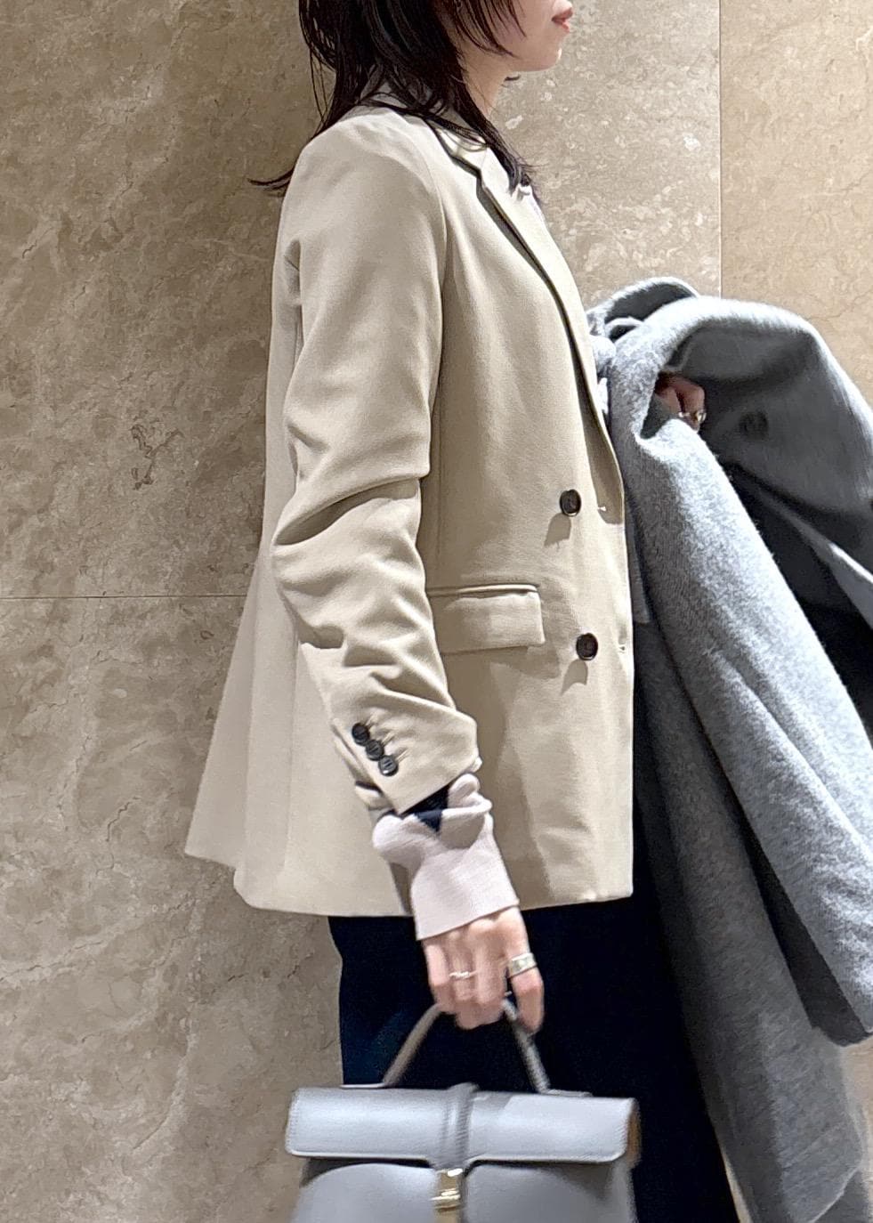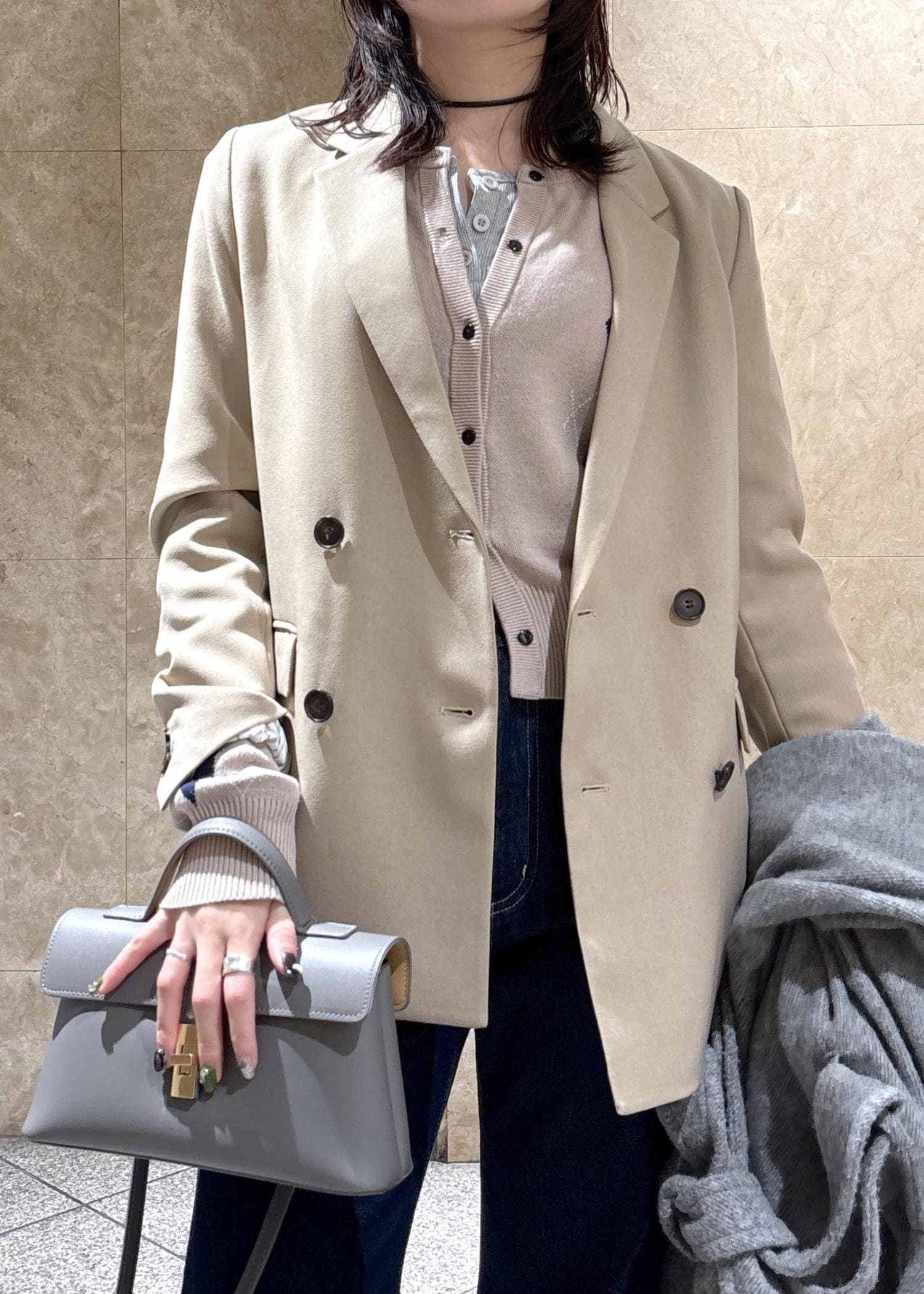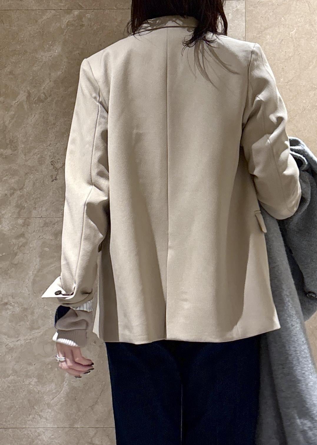程よくゆとりのあるサイズ感ですが肩周りは落としたデザインではなくスッキリしているので、お仕事など少しフォーマルな場面でも使えるキレイめ見えジャケットです。 -