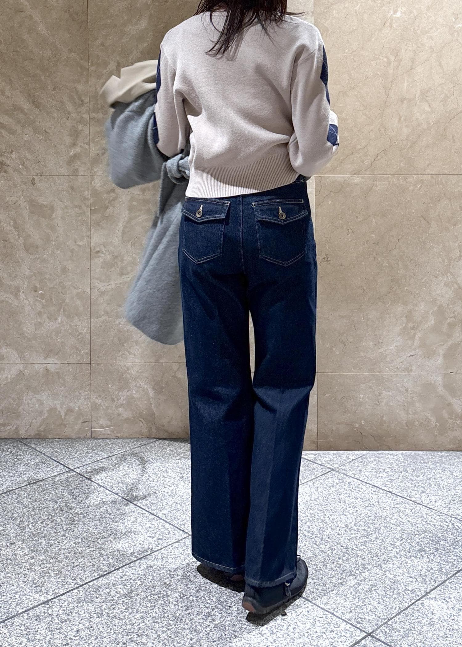 しっかりハイウエストで、お尻周りのフラップポケットのデザインも合間ってスタイルアップして見えます。 -