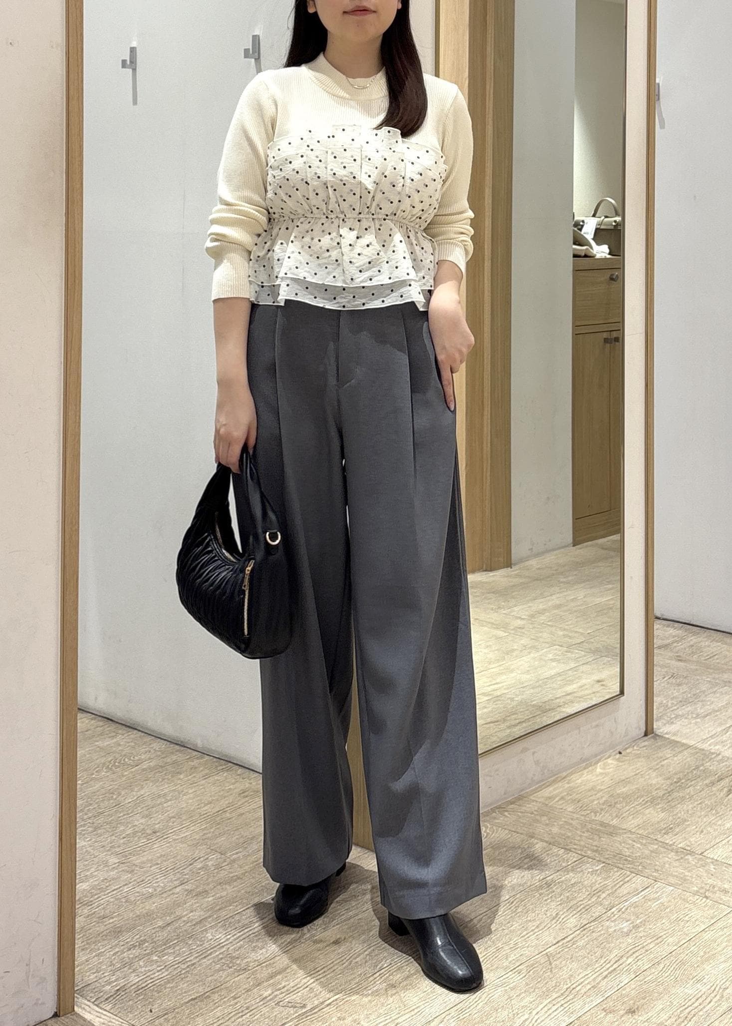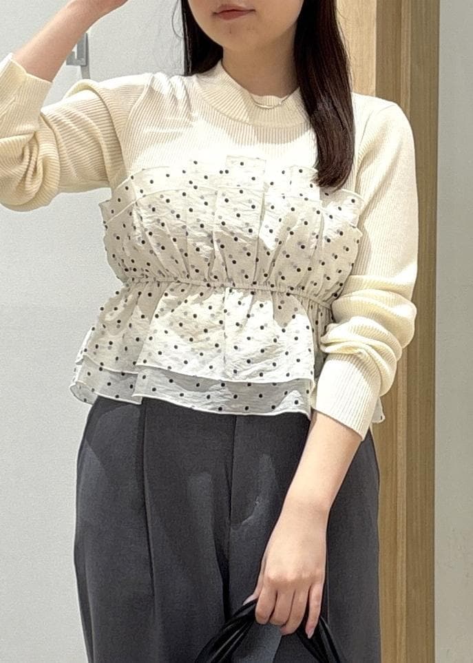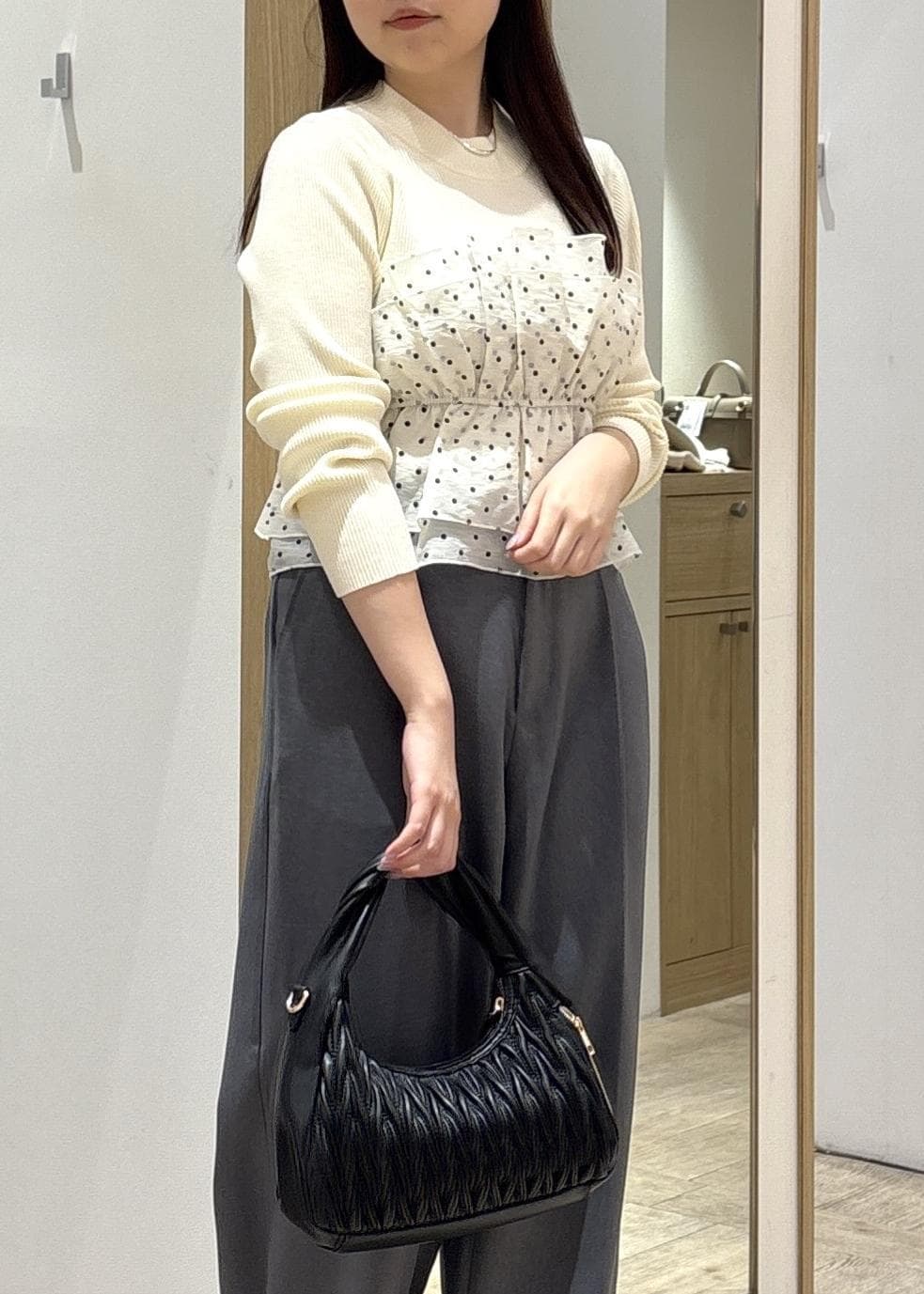 甘さのあるトップスも、パンツ合わせにすることで大人っぽく仕上がり、通勤からお出かけまで幅広く活躍するバランスの良いコーディネートです!