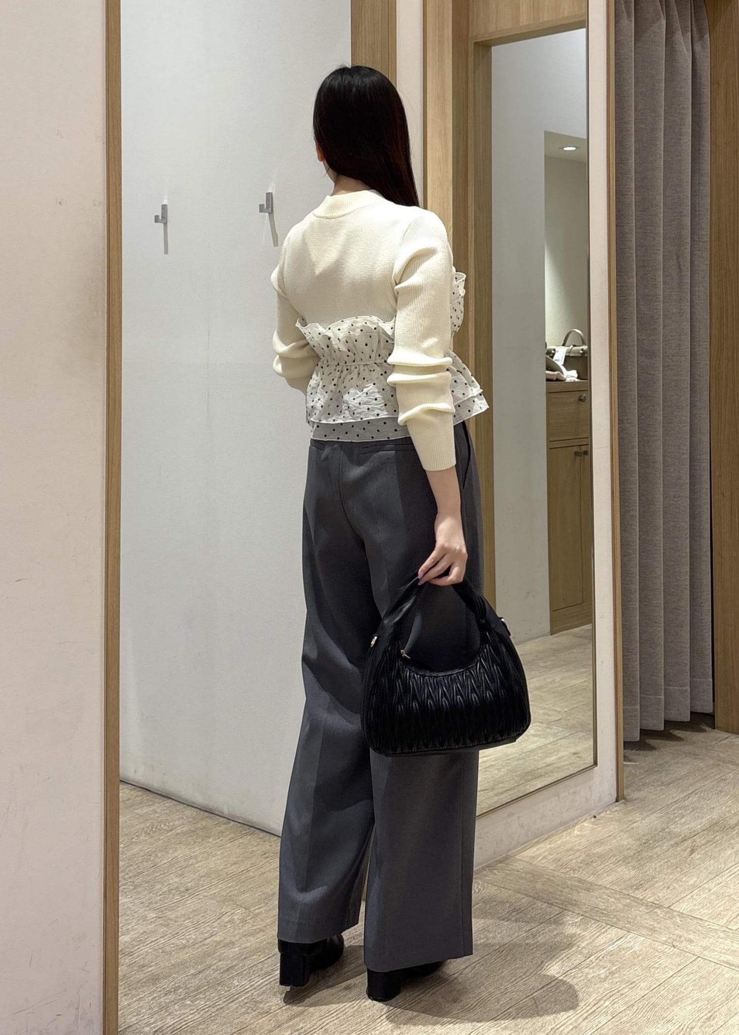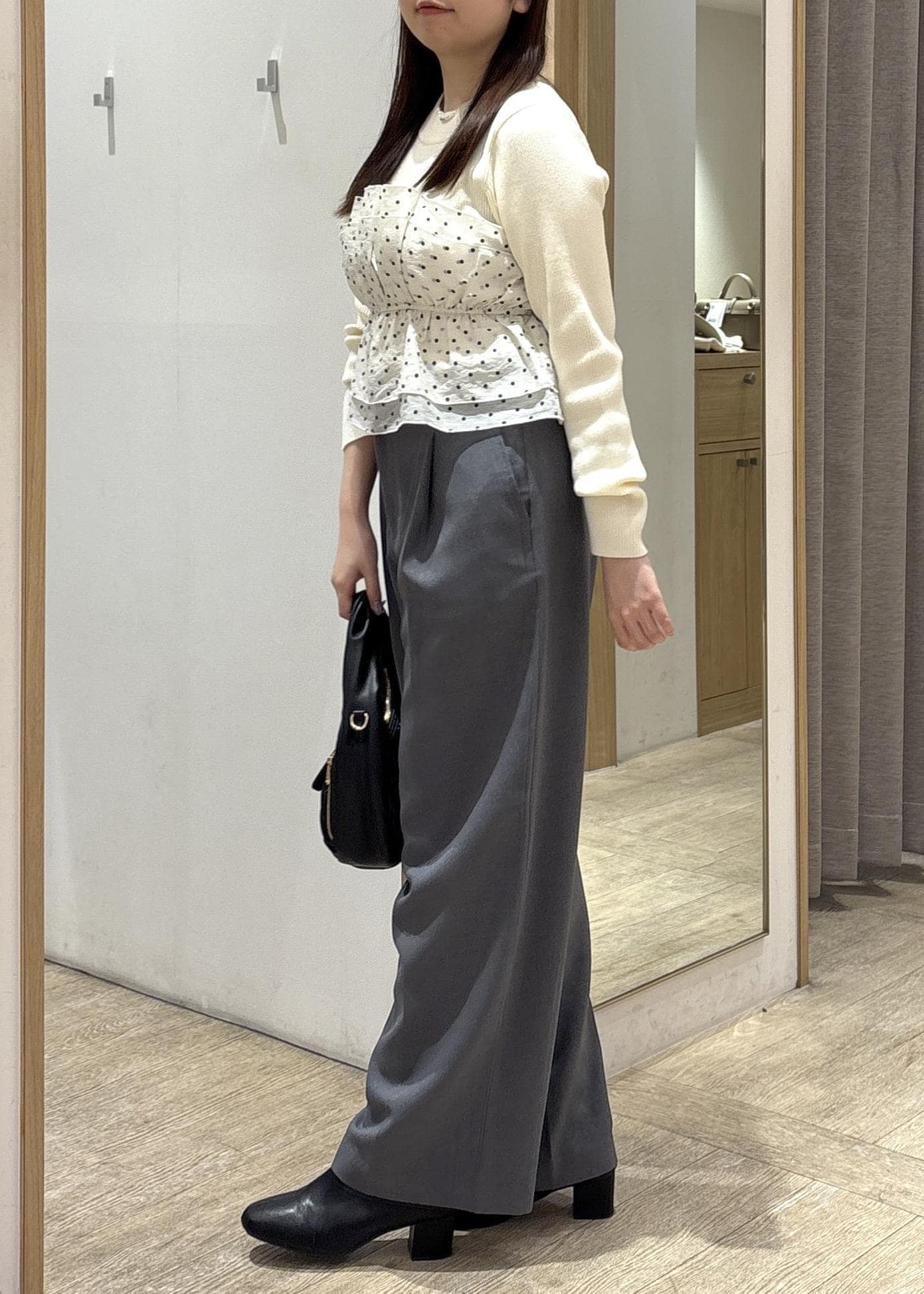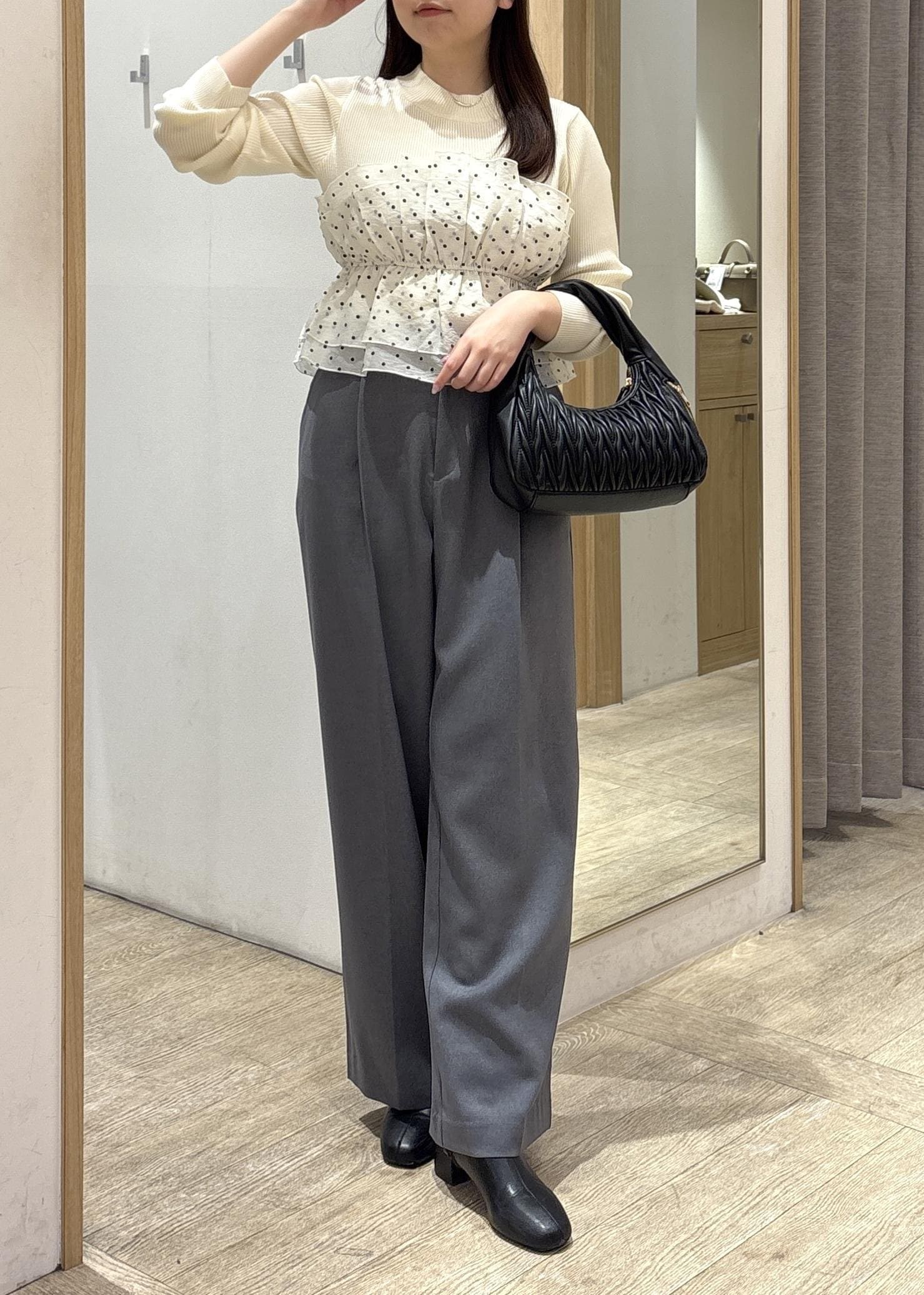 甘さのあるトップスも、パンツ合わせにすることで大人っぽく仕上がり、通勤からお出かけまで幅広く活躍するバランスの良いコーディネートです!
