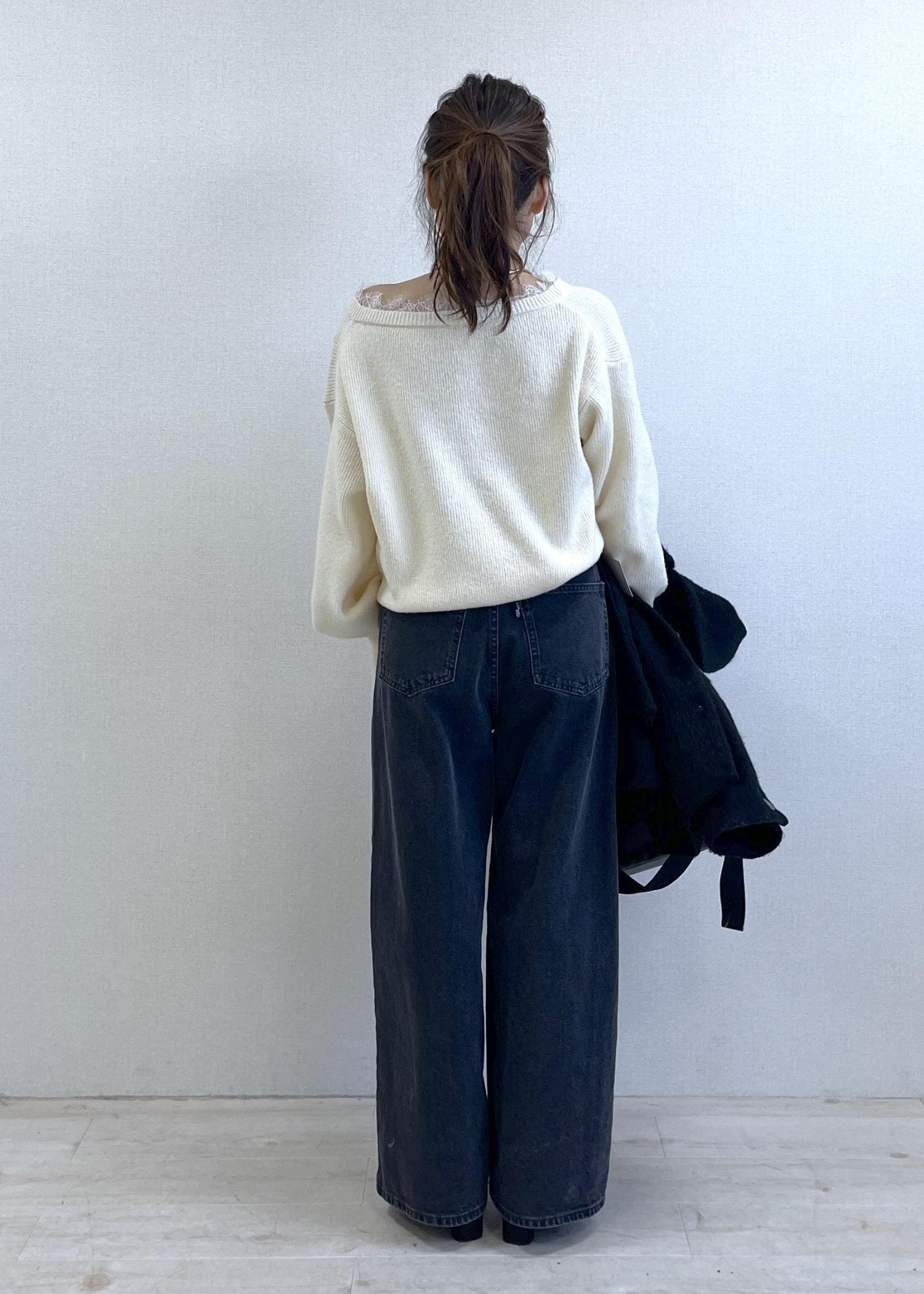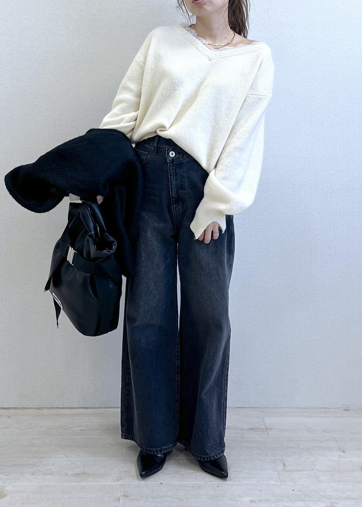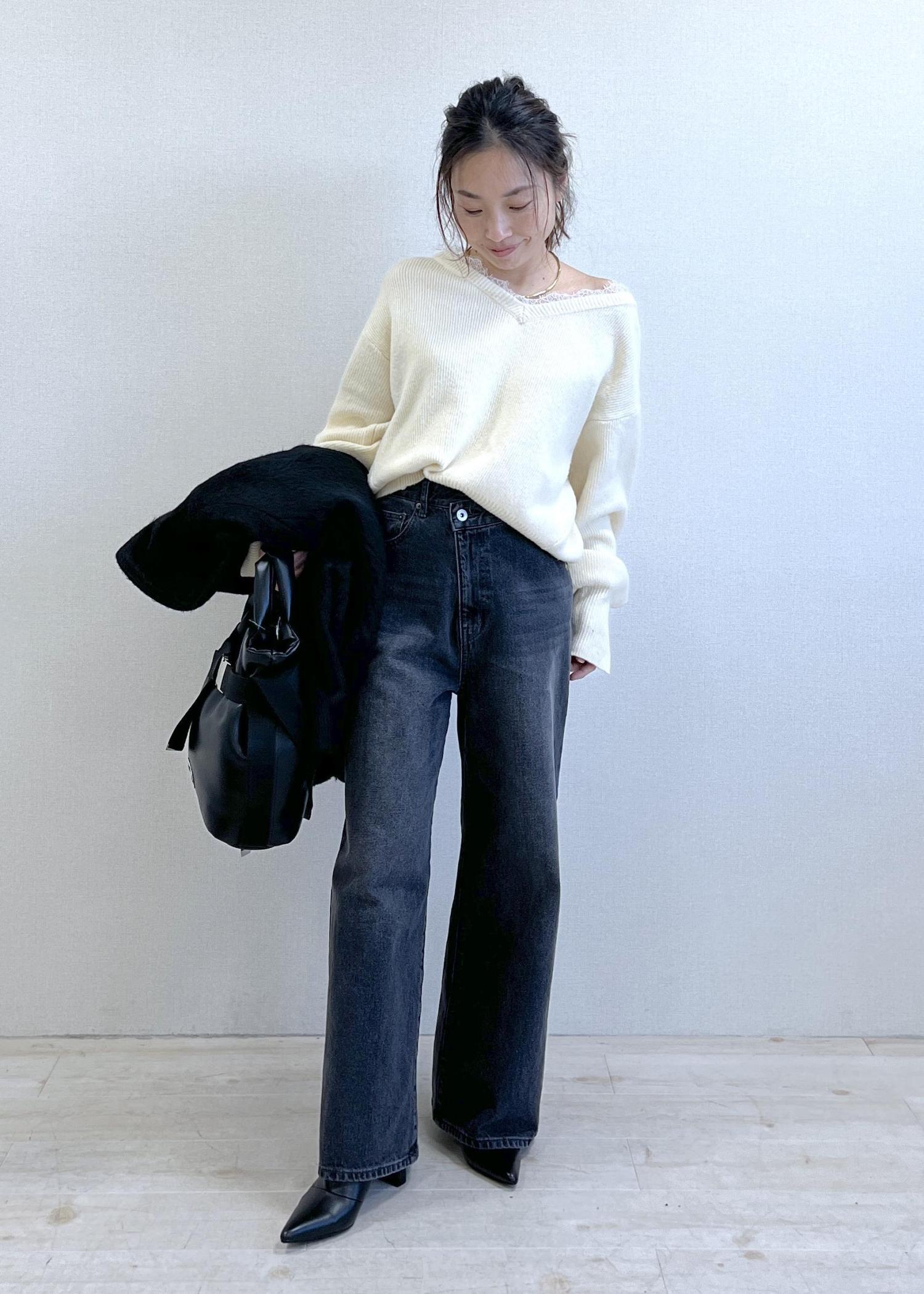 気負わないのにおしゃれに見える、理想の休日スタイル。 柔らかなホワイトのVネックニットは、程よいボリューム袖が女性らしいシルエットを演出します。首元から繊細なレースを覗かせることで、カジュアルなデニムスタイルに華やかさと色っぽさをプラスしました。 ボトムはあえてハンサムなワイドデニムをチョイス。足元を黒のブーツで引き締めれば、ラフになりすぎない「大人のこなれ感」が手に入ります。