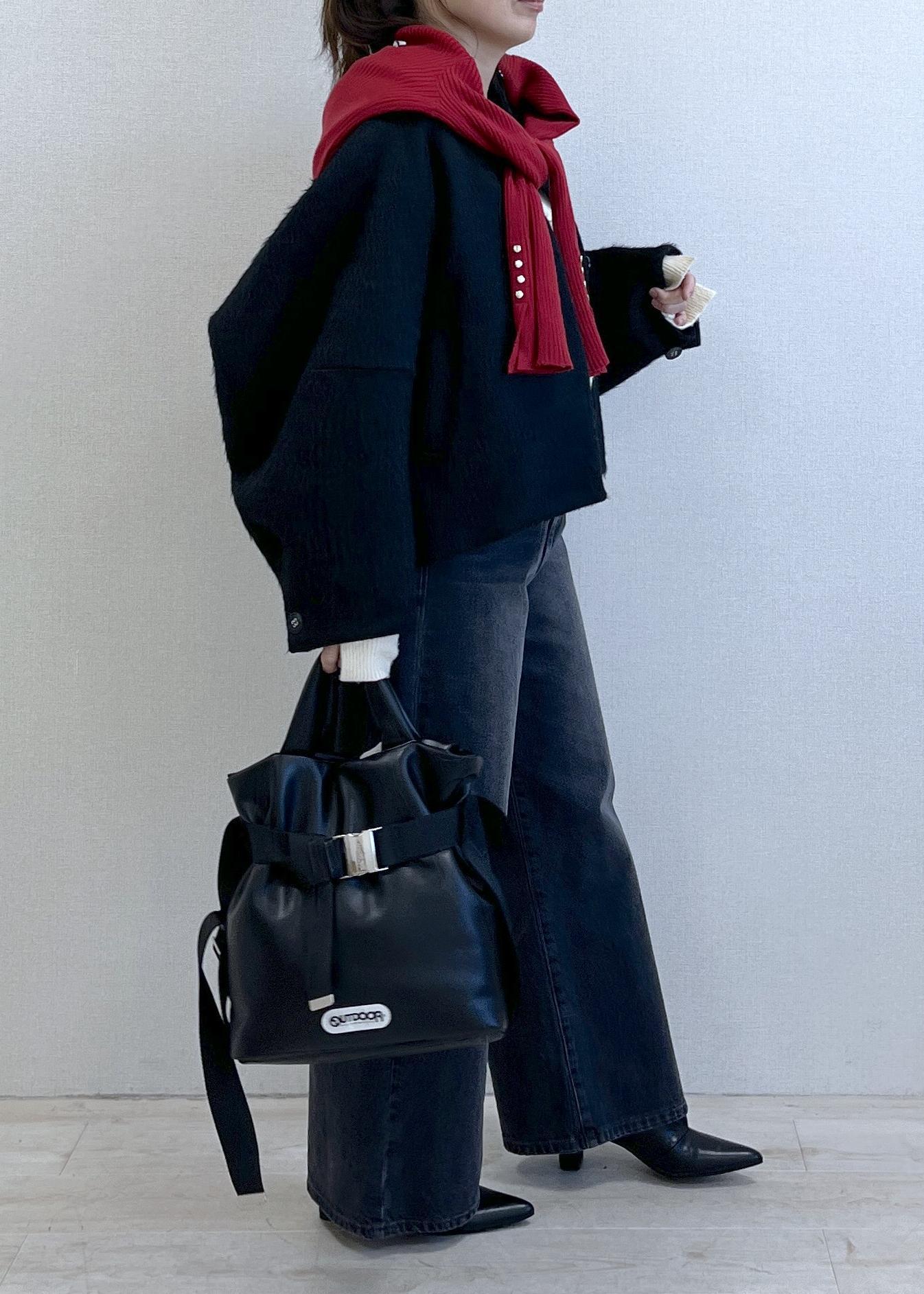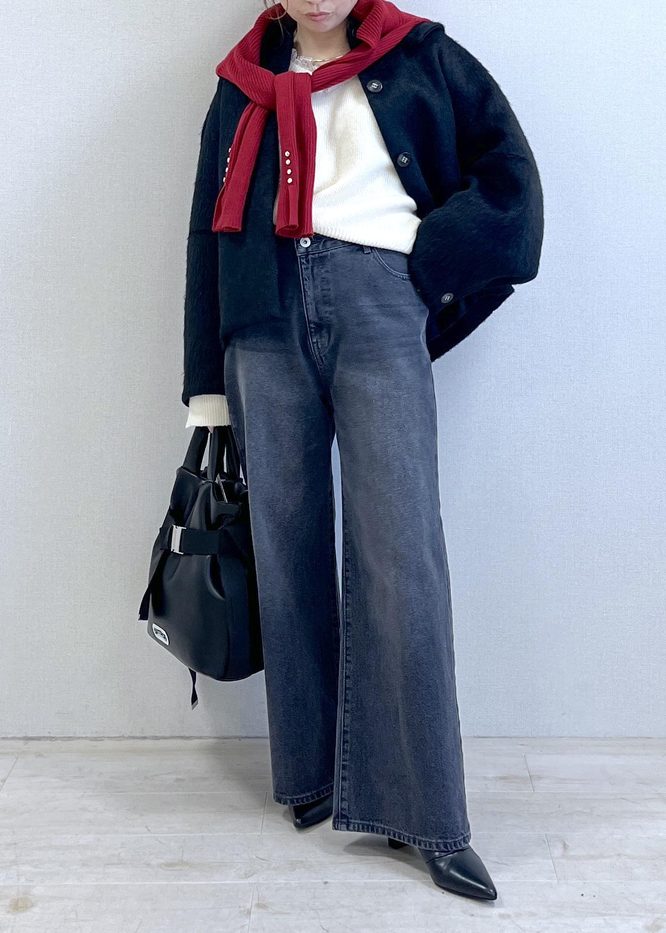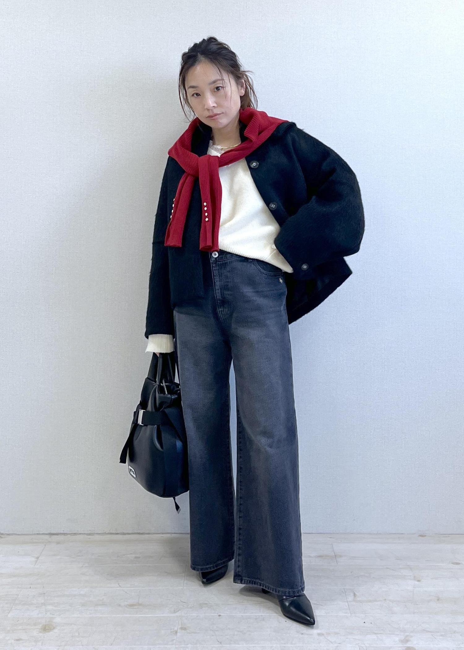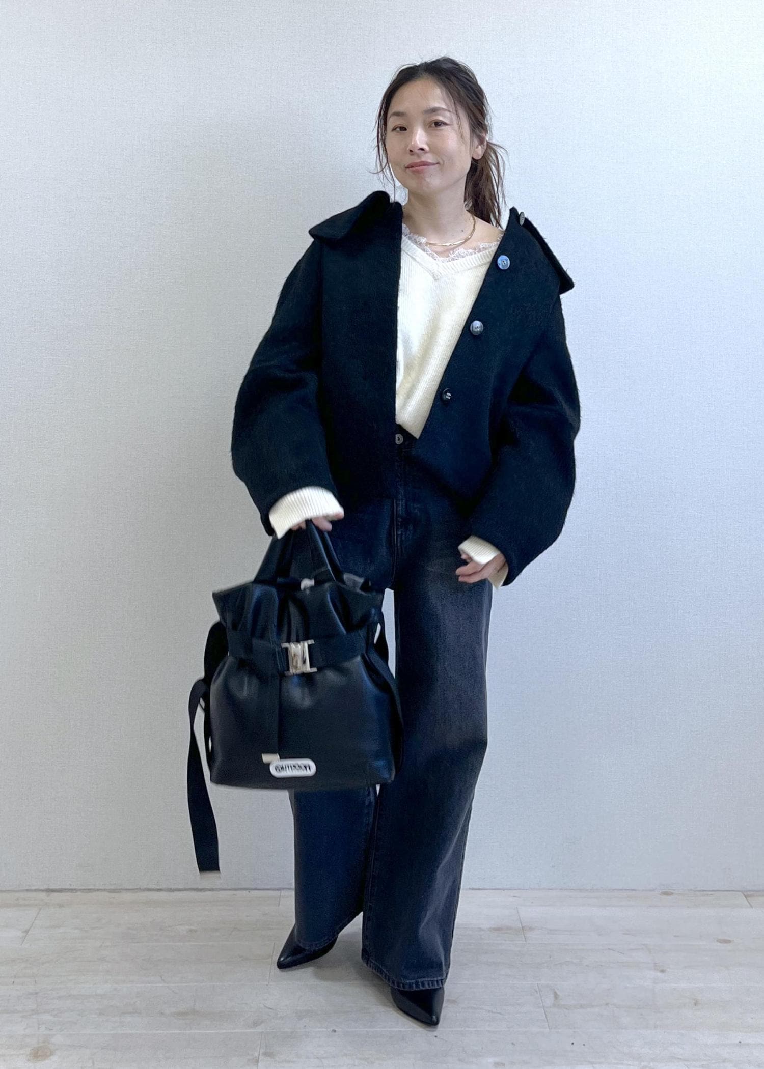 気負わないのにおしゃれに見える、理想の休日スタイル。 柔らかなホワイトのVネックニットは、程よいボリューム袖が女性らしいシルエットを演出します。首元から繊細なレースを覗かせることで、カジュアルなデニムスタイルに華やかさと色っぽさをプラスしました。 ボトムはあえてハンサムなワイドデニムをチョイス。足元を黒のブーツで引き締めれば、ラフになりすぎない「大人のこなれ感」が手に入ります。