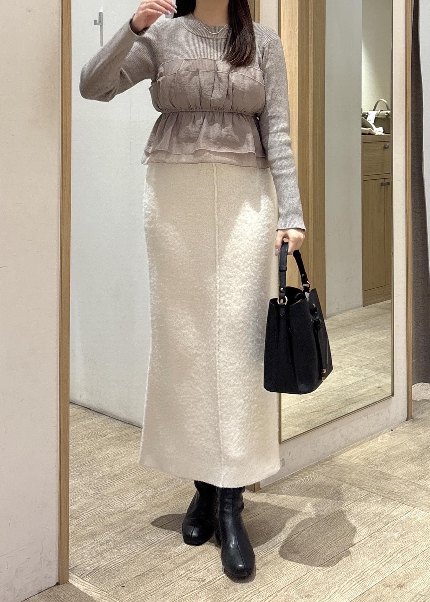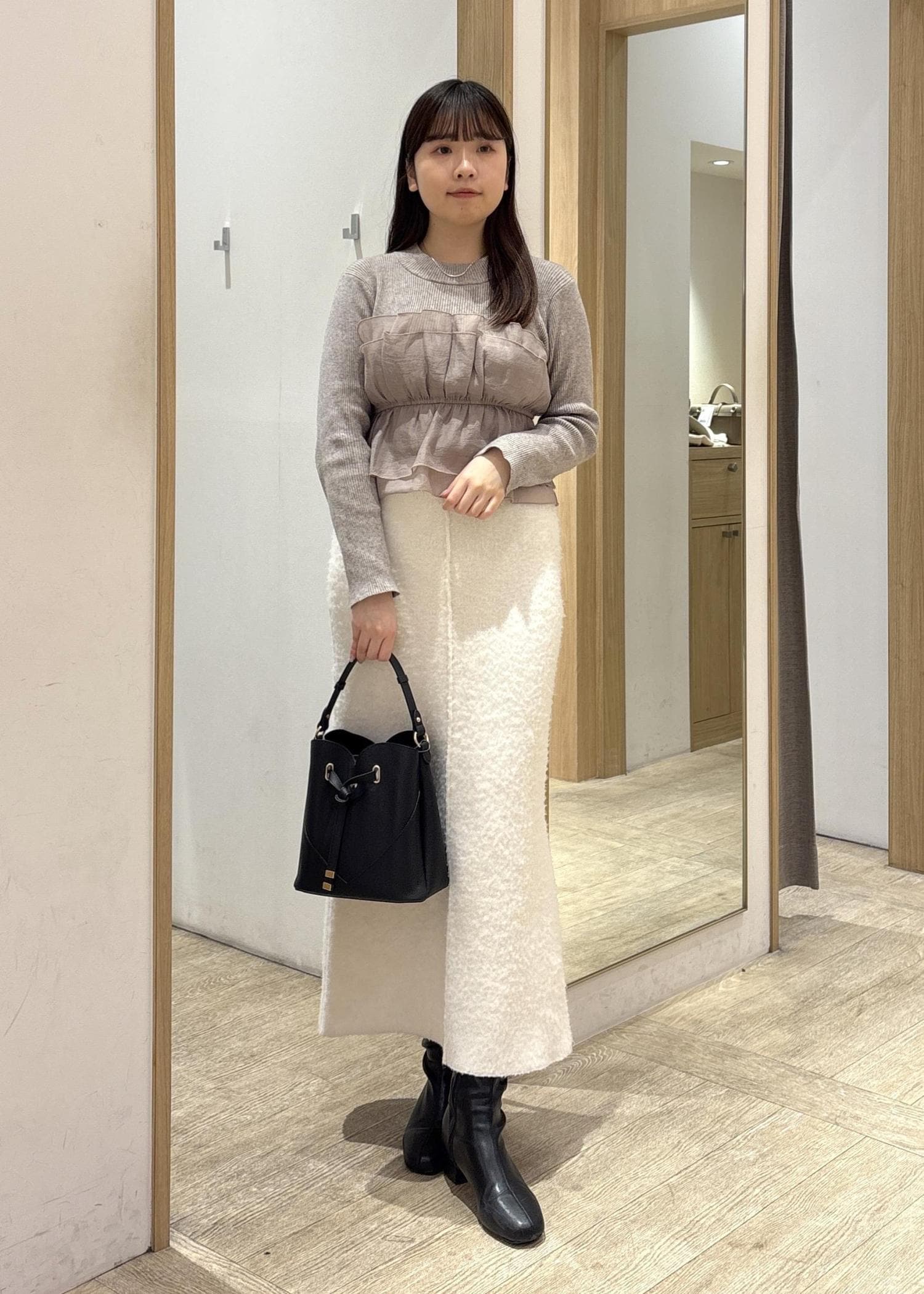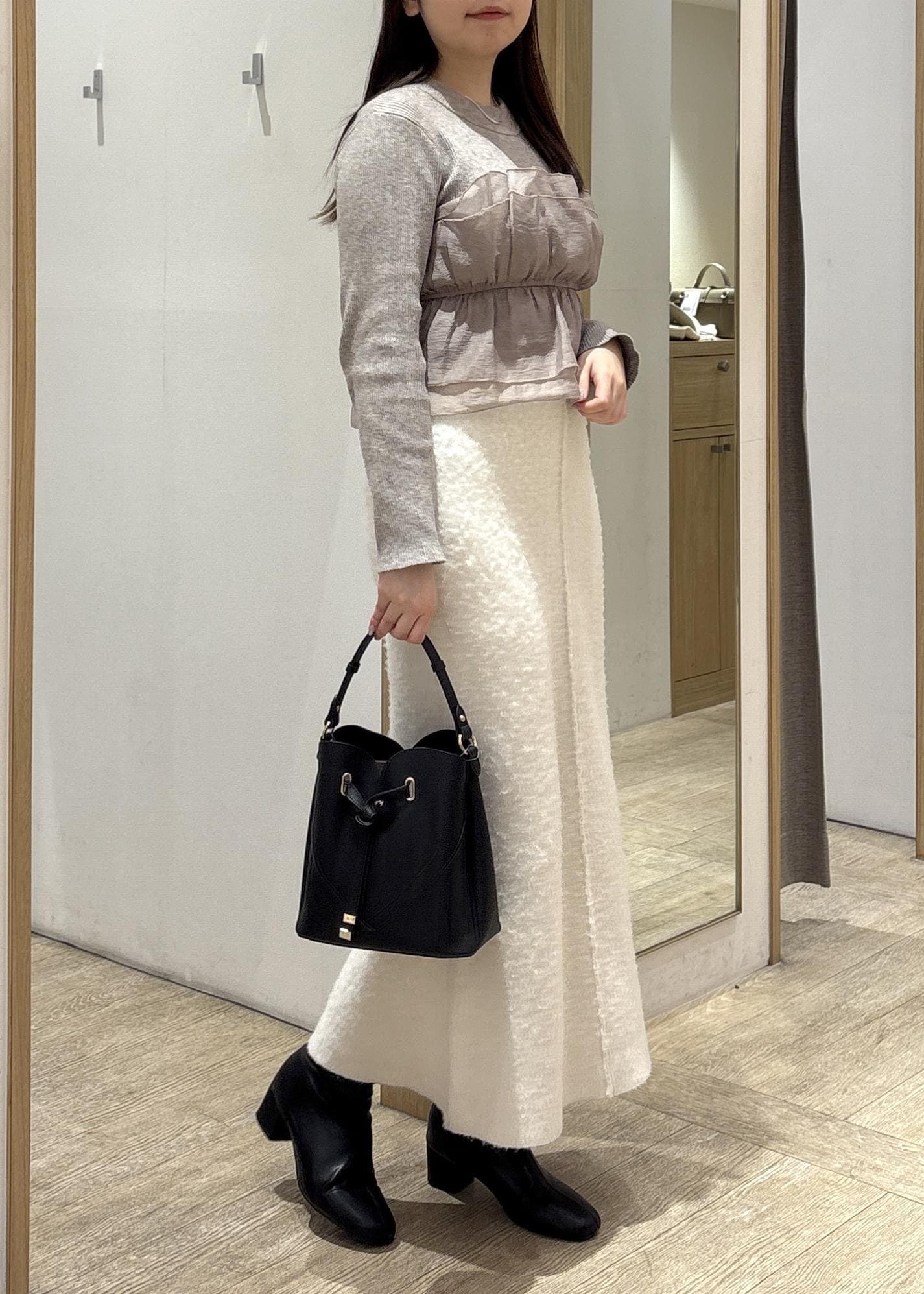 シャギー素材のやわらかな質感なのに広がりすぎず、メリハリのあるシルエットに仕上がります。 -