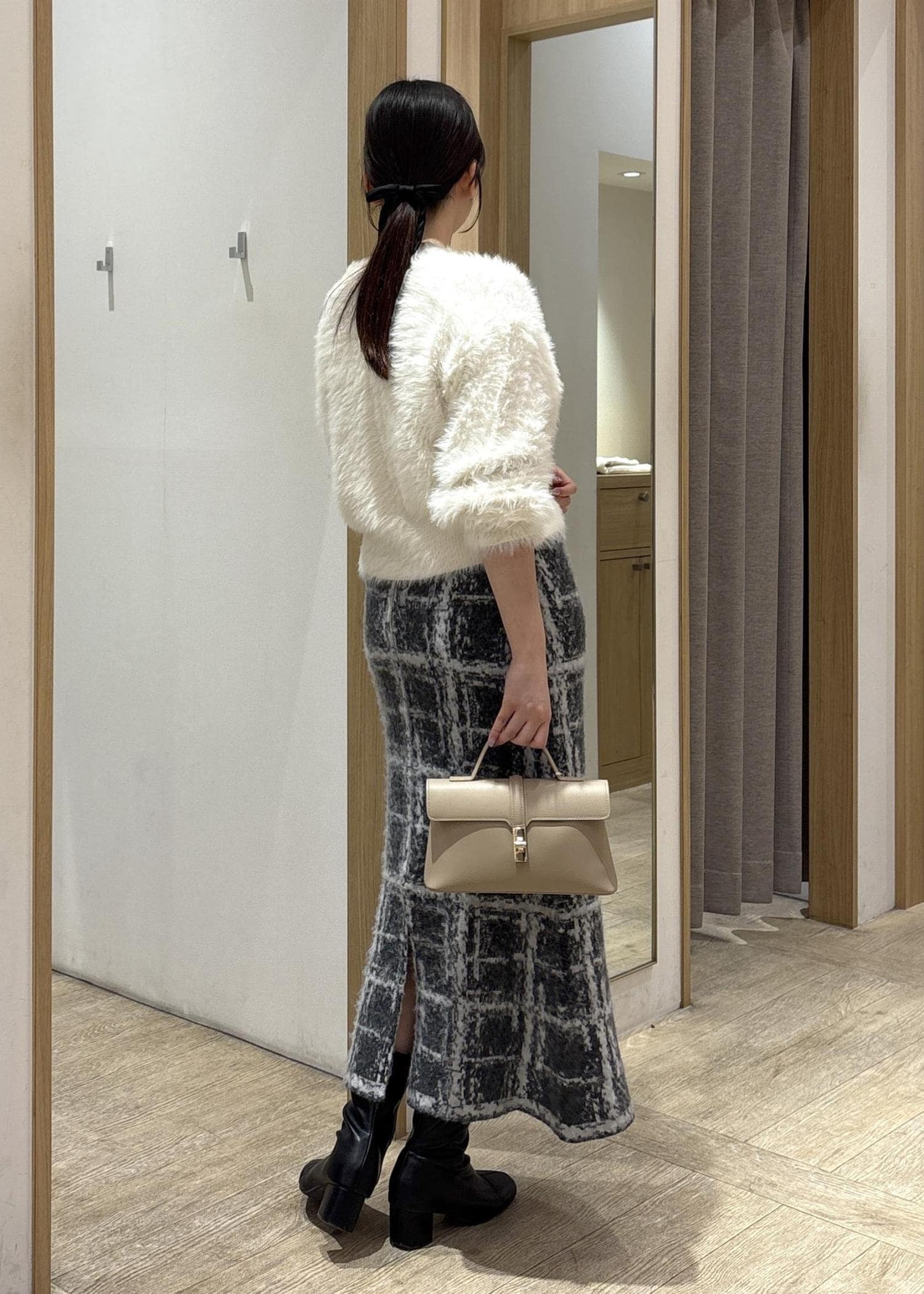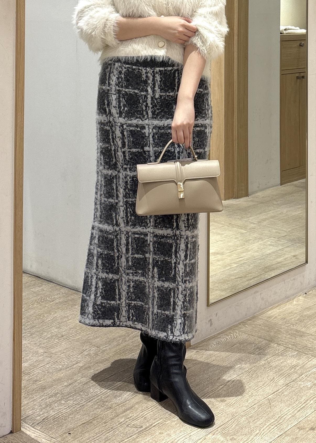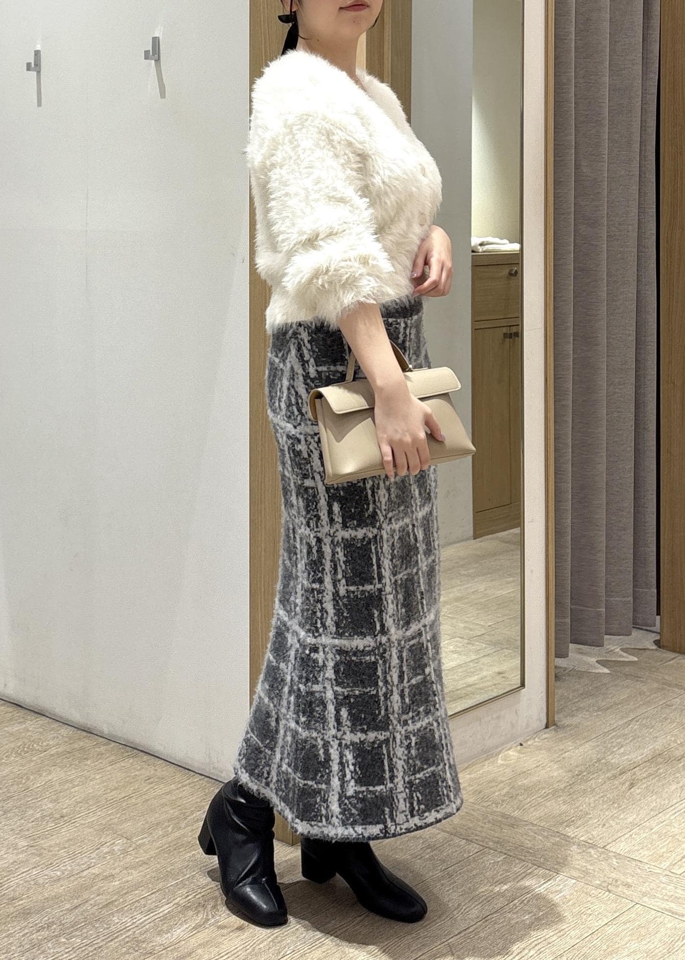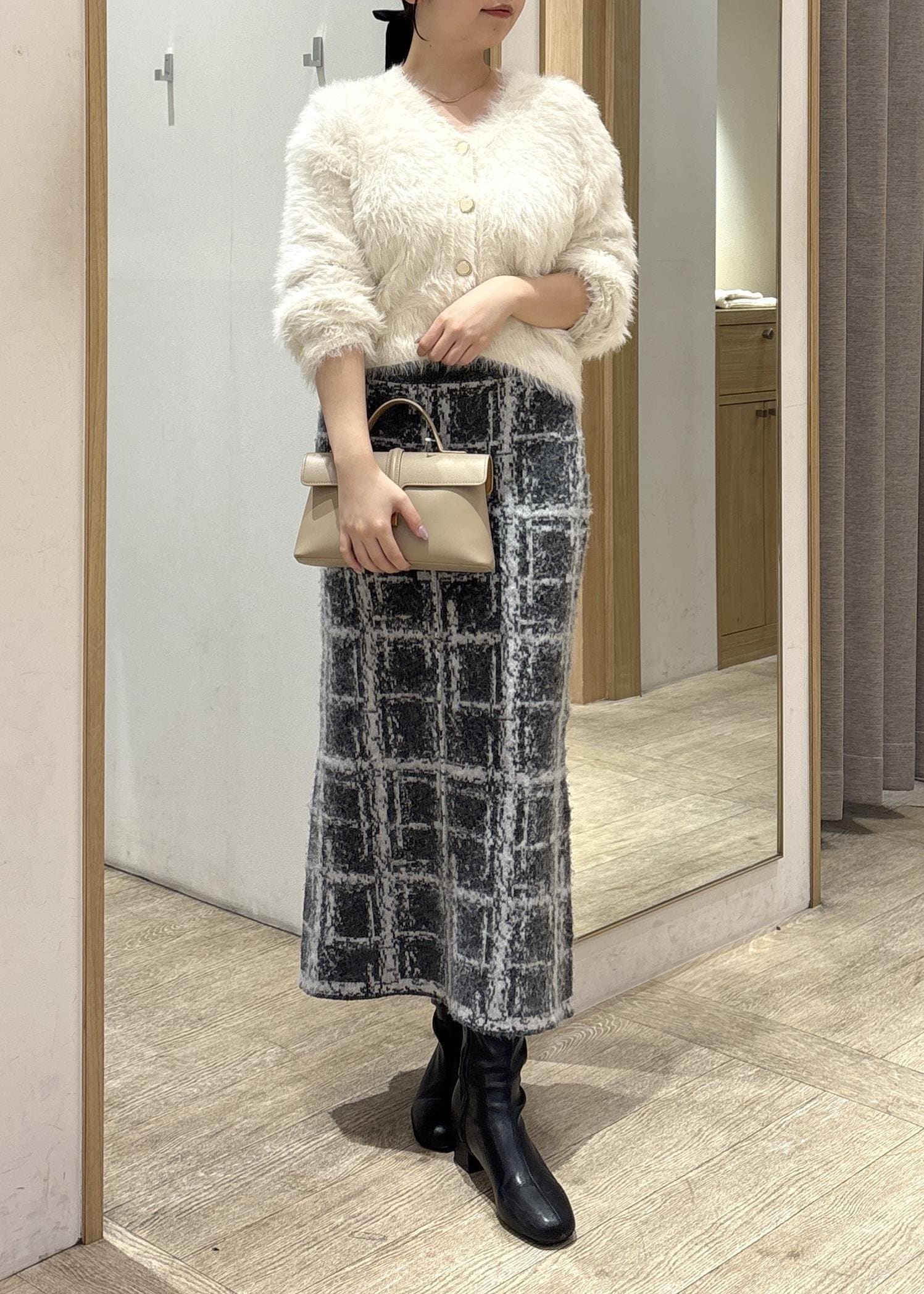 カーディガンのもこもこ感とスカートのシャギー素材が合わさることで、季節感のある冬コーデが完成しつつ、上半身のふんわり感と下半身のすっきり感のバランスが取れた着こなしに♪
