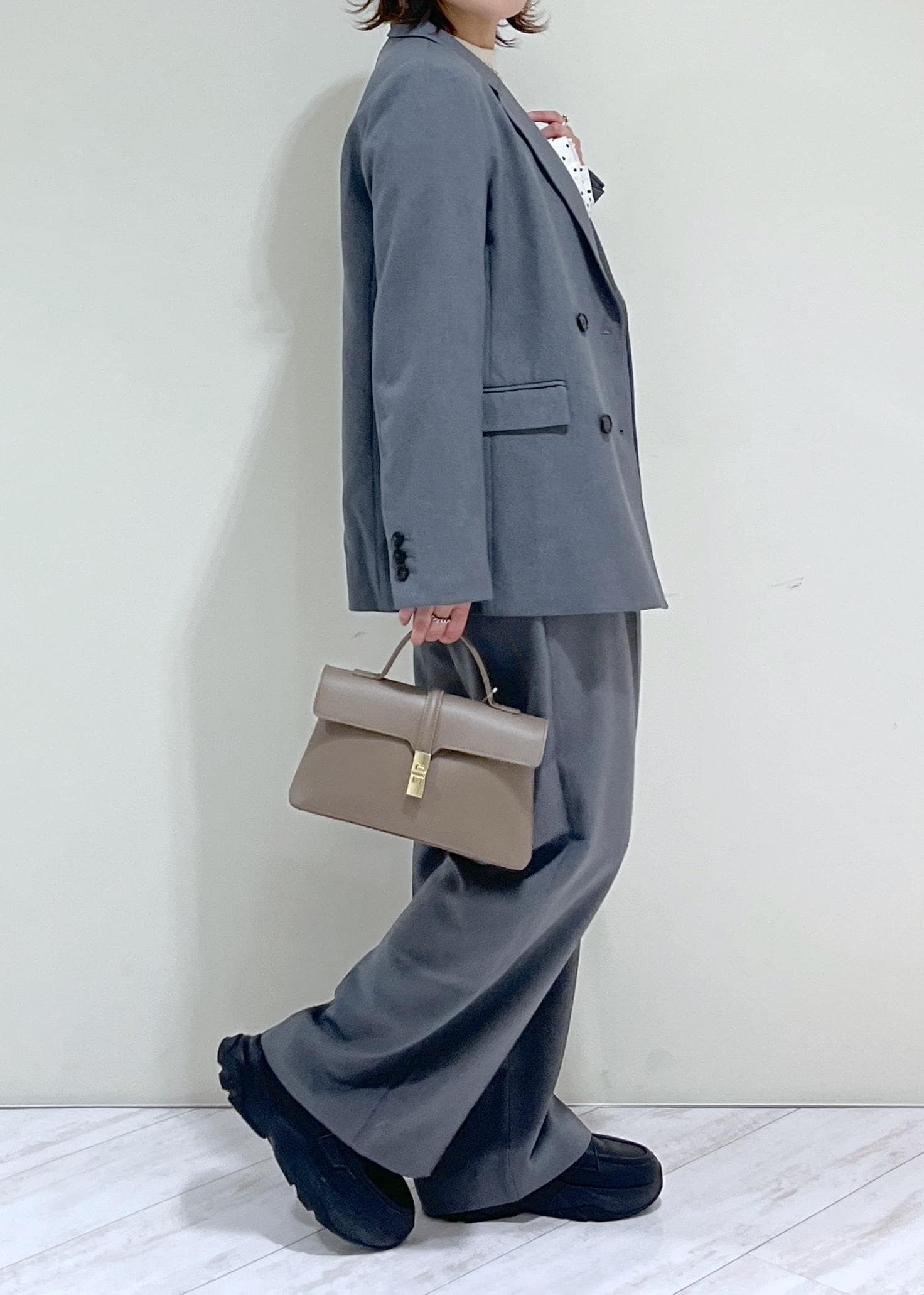 素足だと床に少し付いてしまいます。少しヒールのある靴やスニーカーだと安心ですし、脚のラインもきれいに見えます。 -