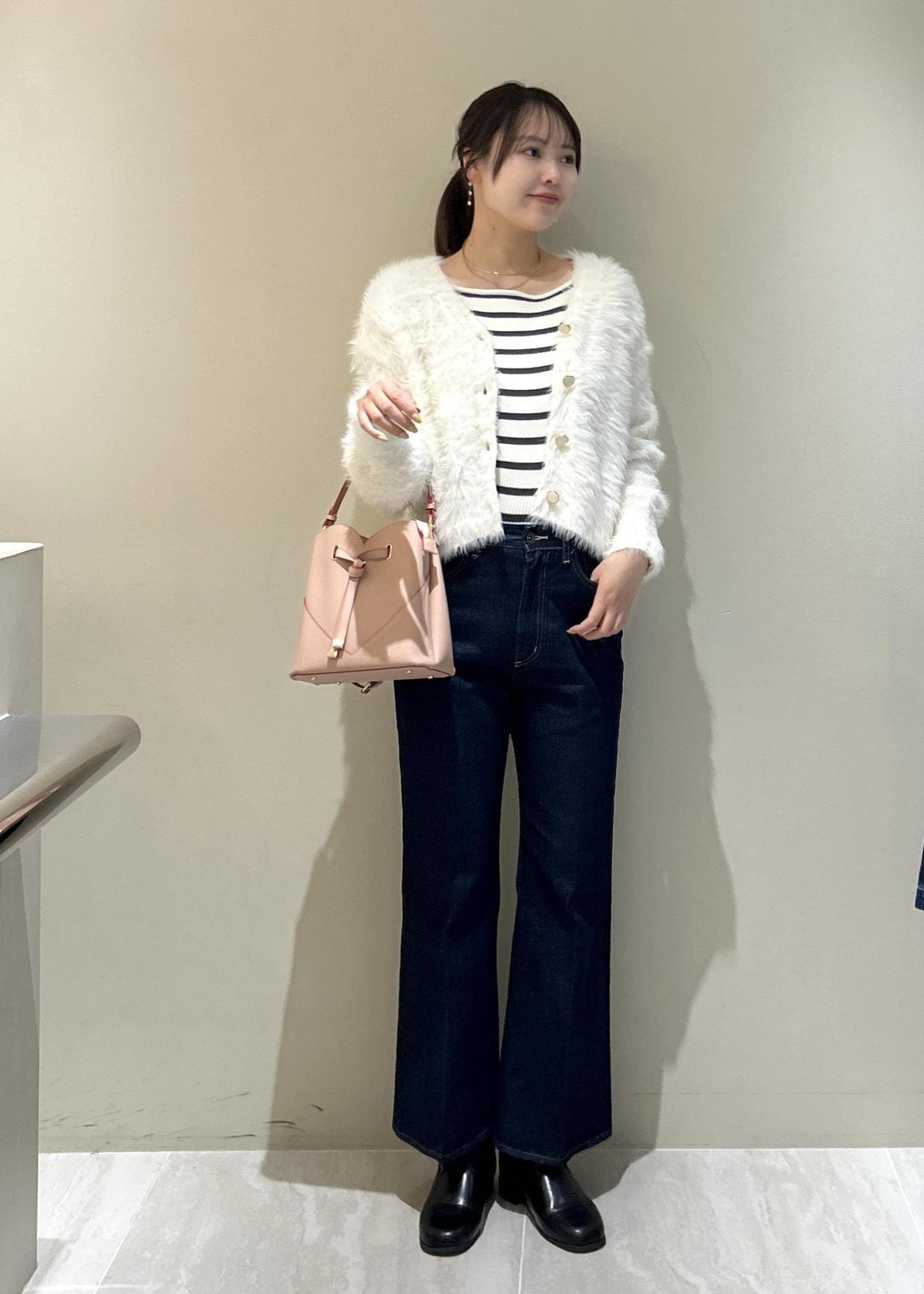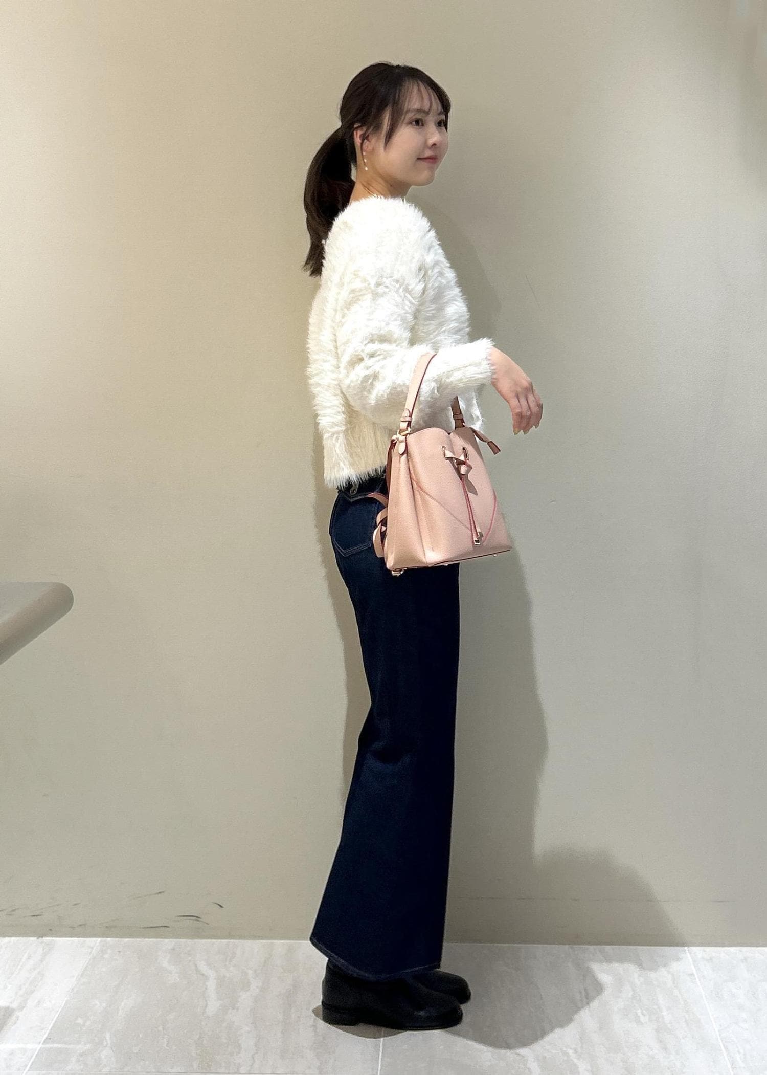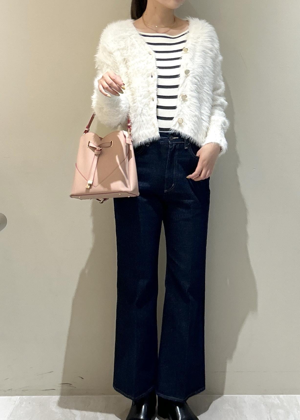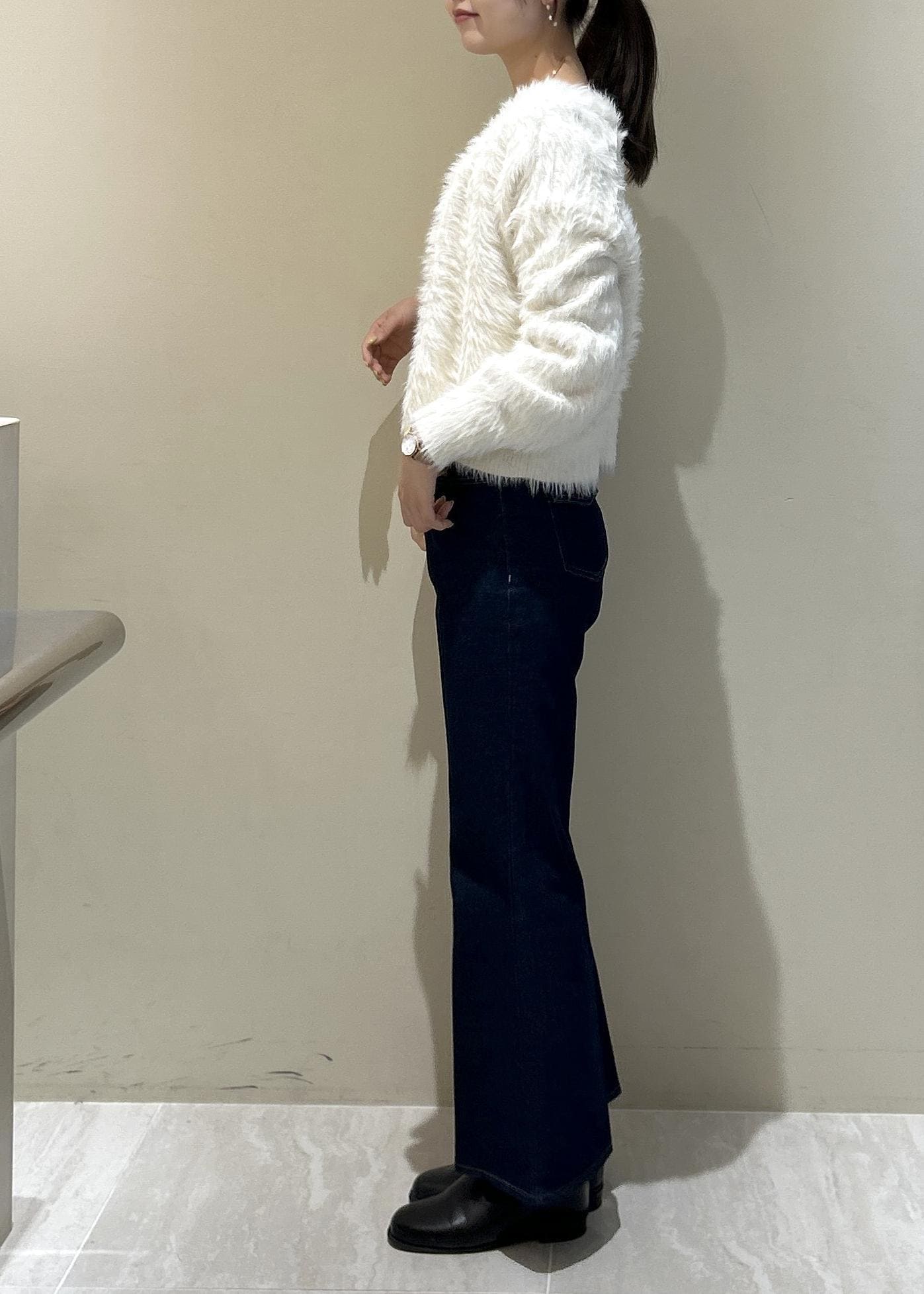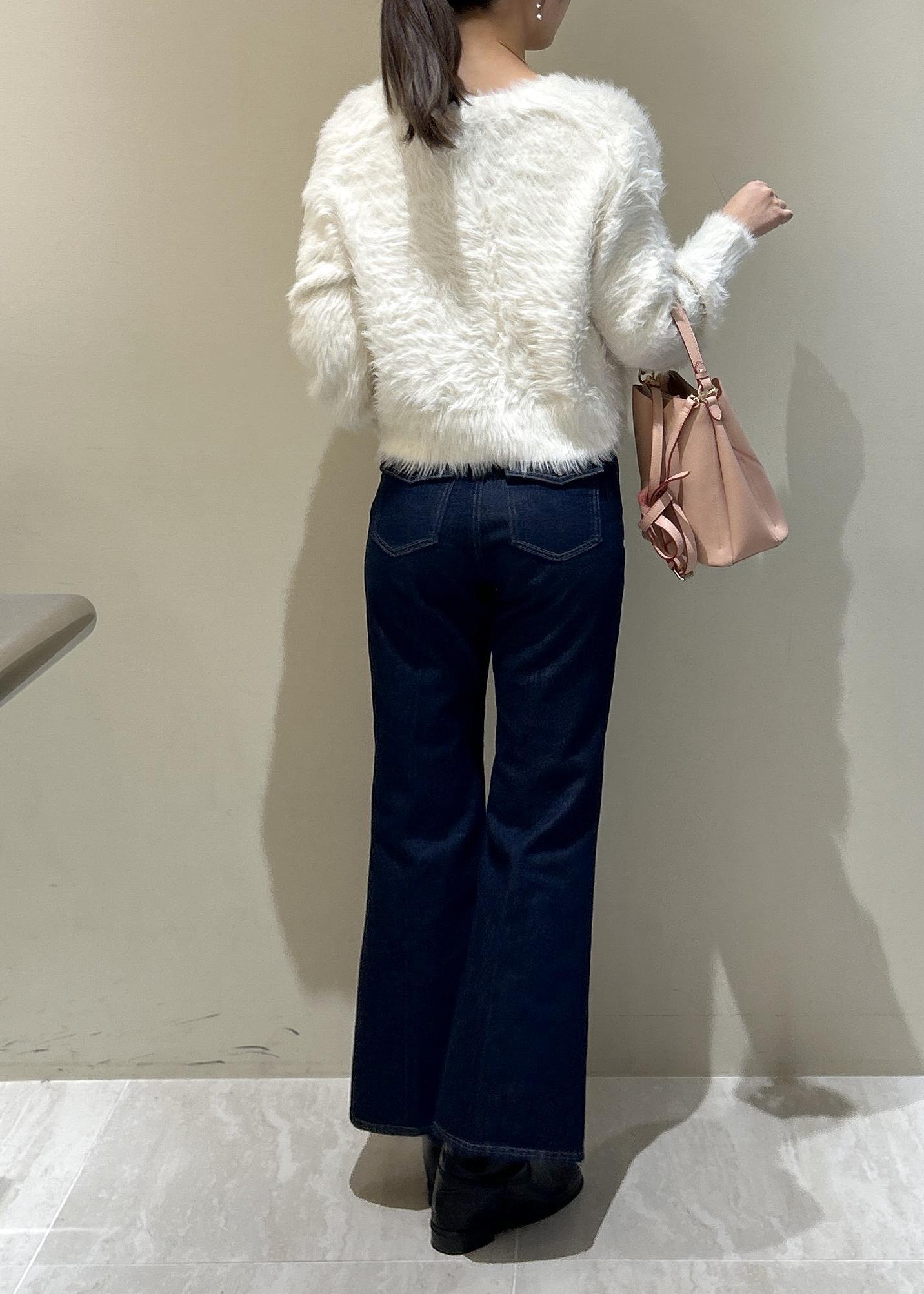 毛足は長いですがVネックで首周りがスッキリ見えするのと体のラインに沿うシルエットなので全く着膨れ感なく着れます。 -