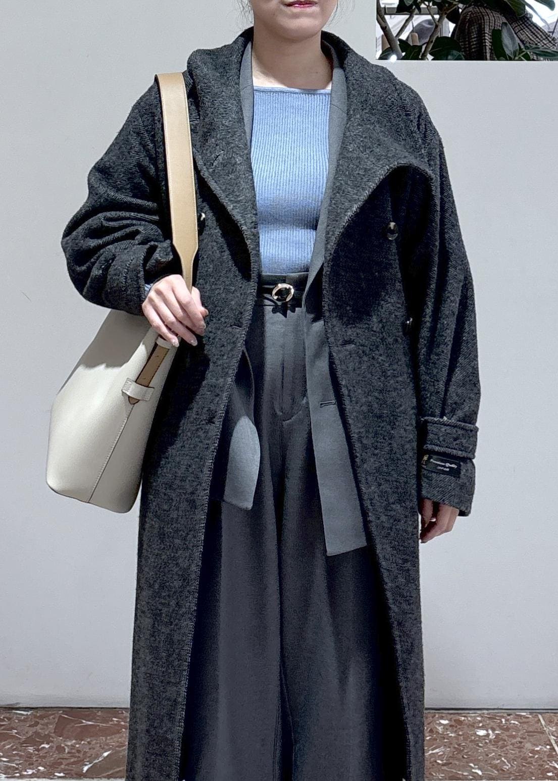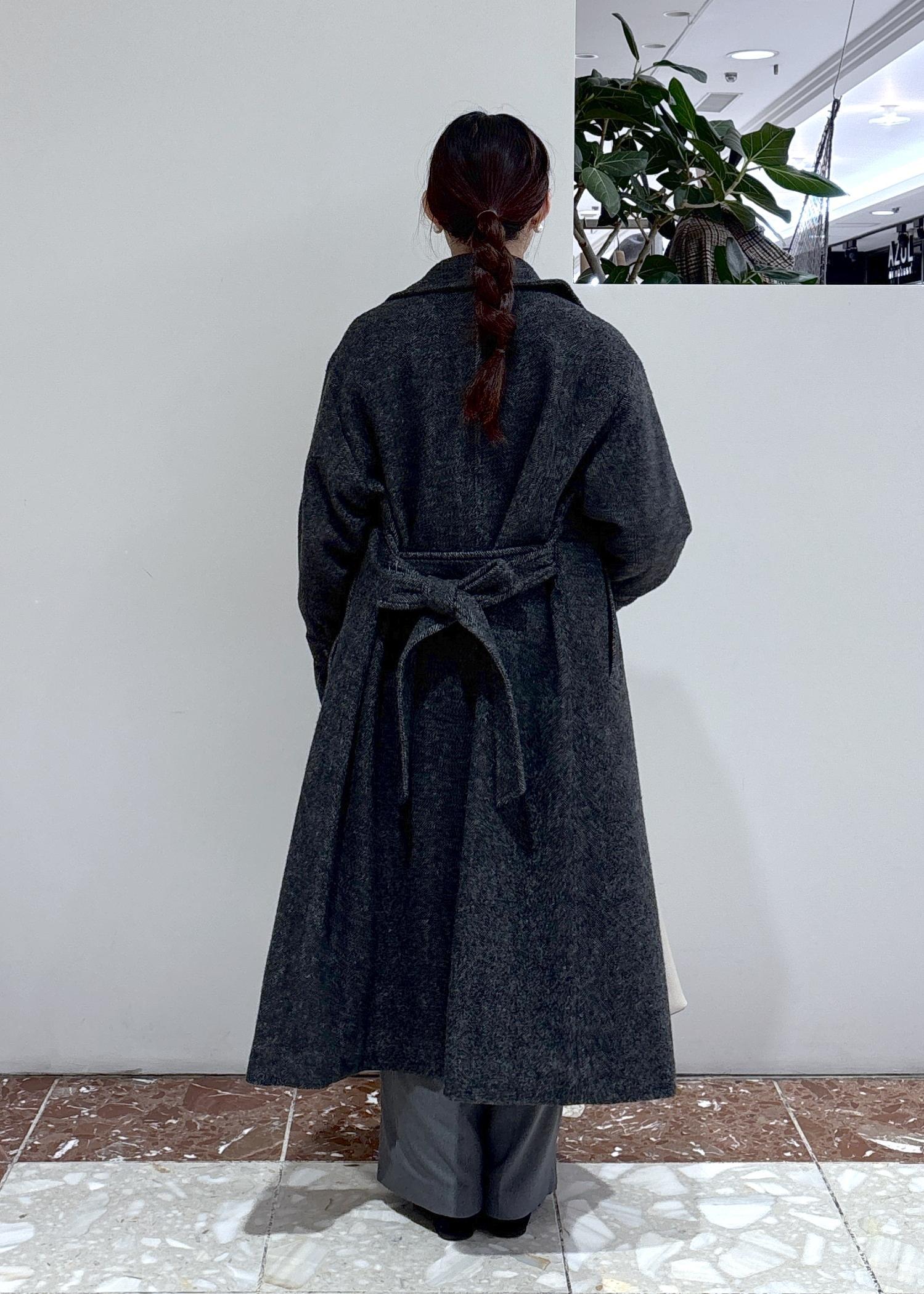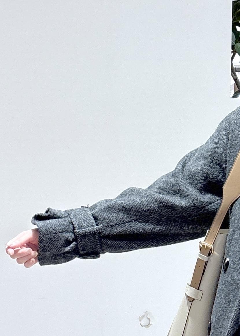 袖部分はボタンが付いていて、奥に留めるとキャンディスリーブのようになり、女性らしいシルエットが楽しめます。ネックもスタンドネックになったり、ベルトの結び方を変えるだけで雰囲気も変わるので、着回し力も抜群です。