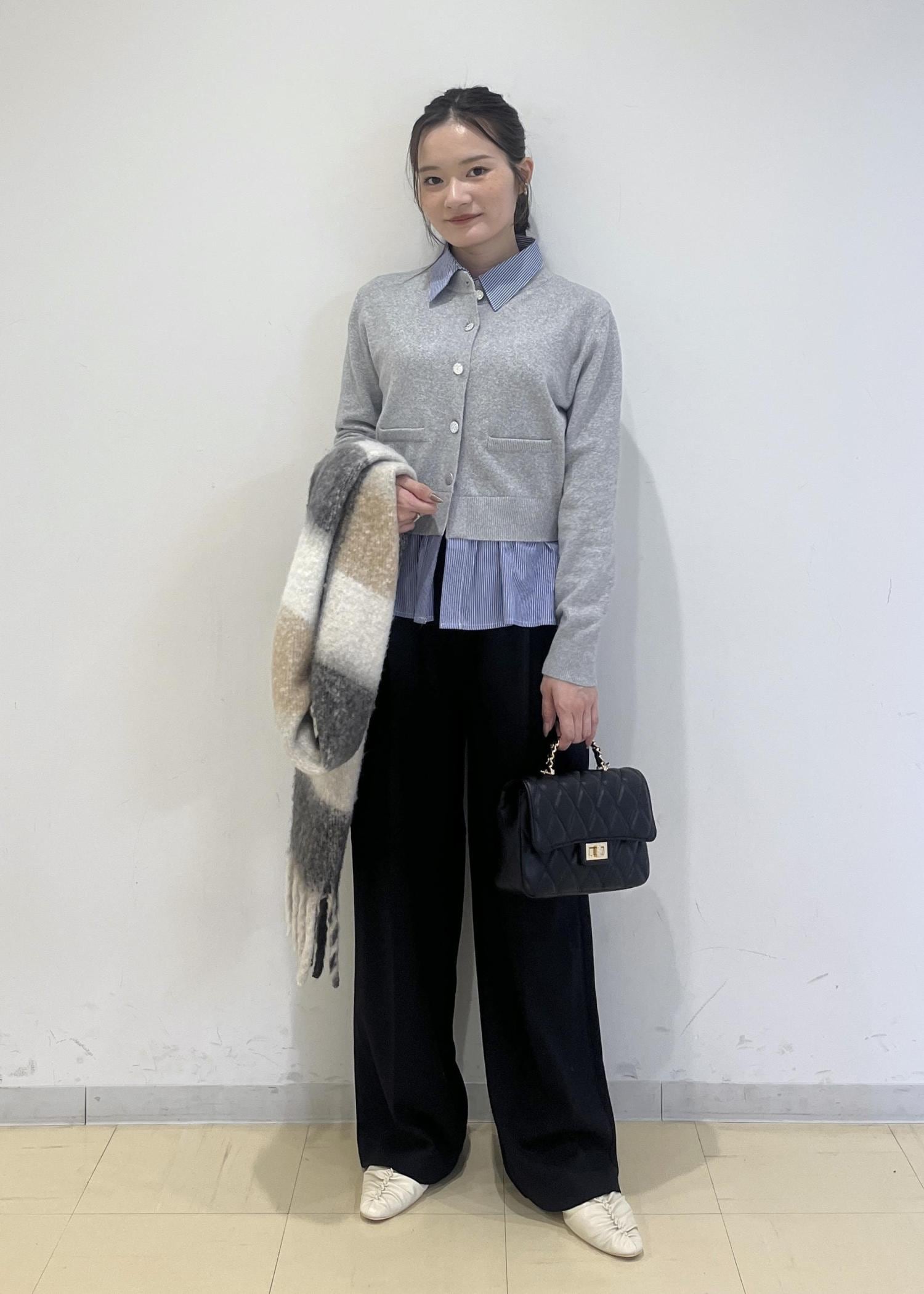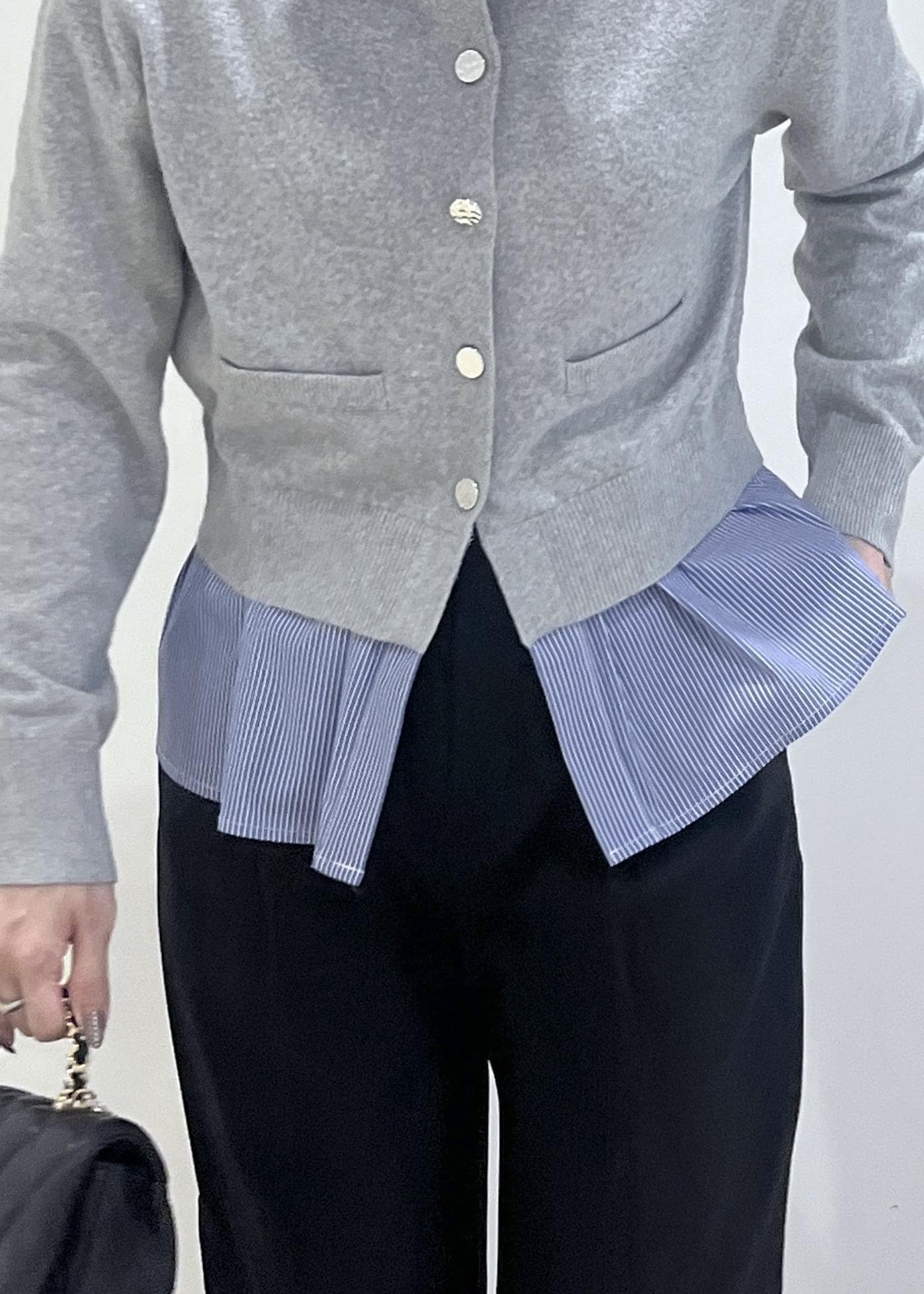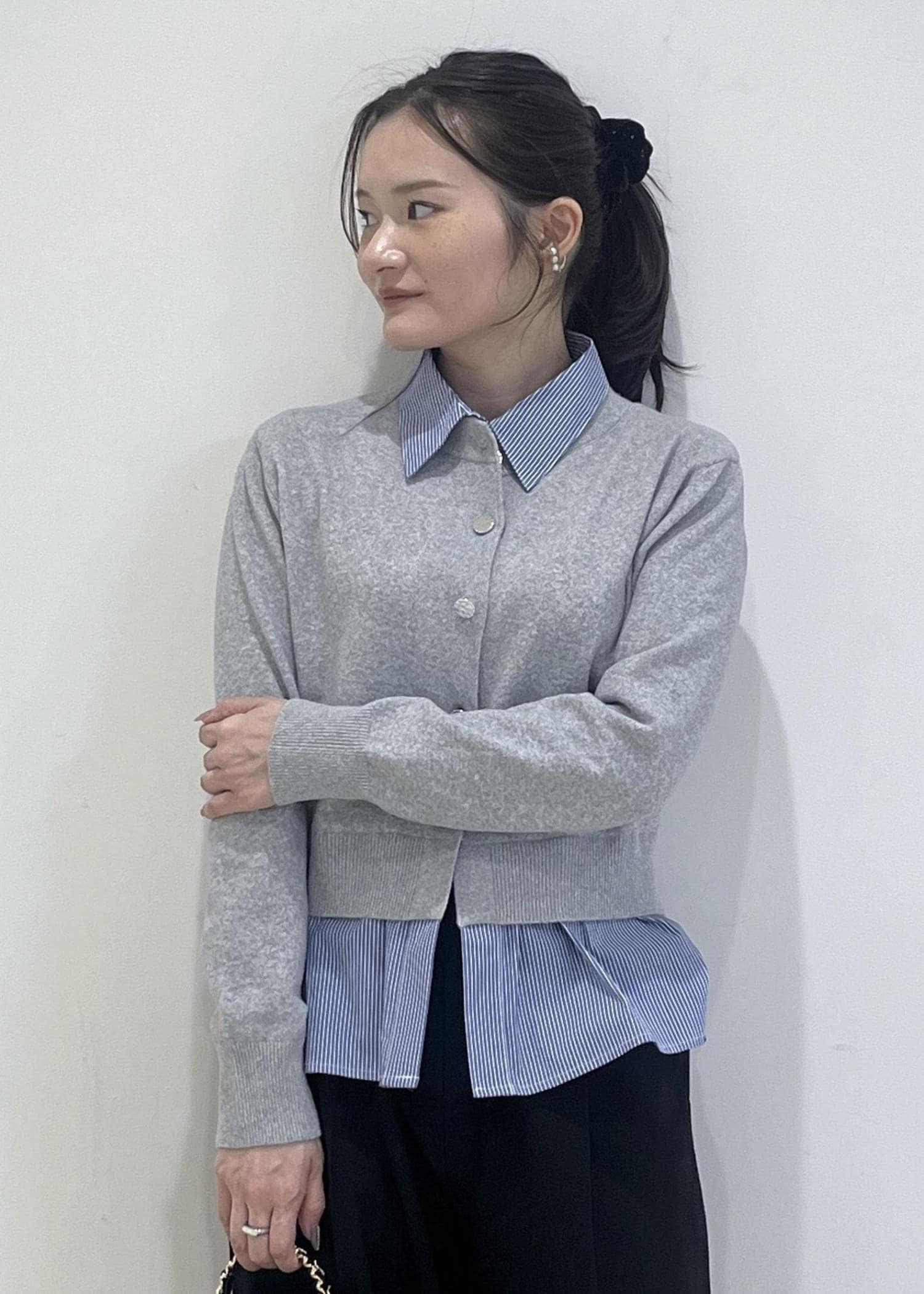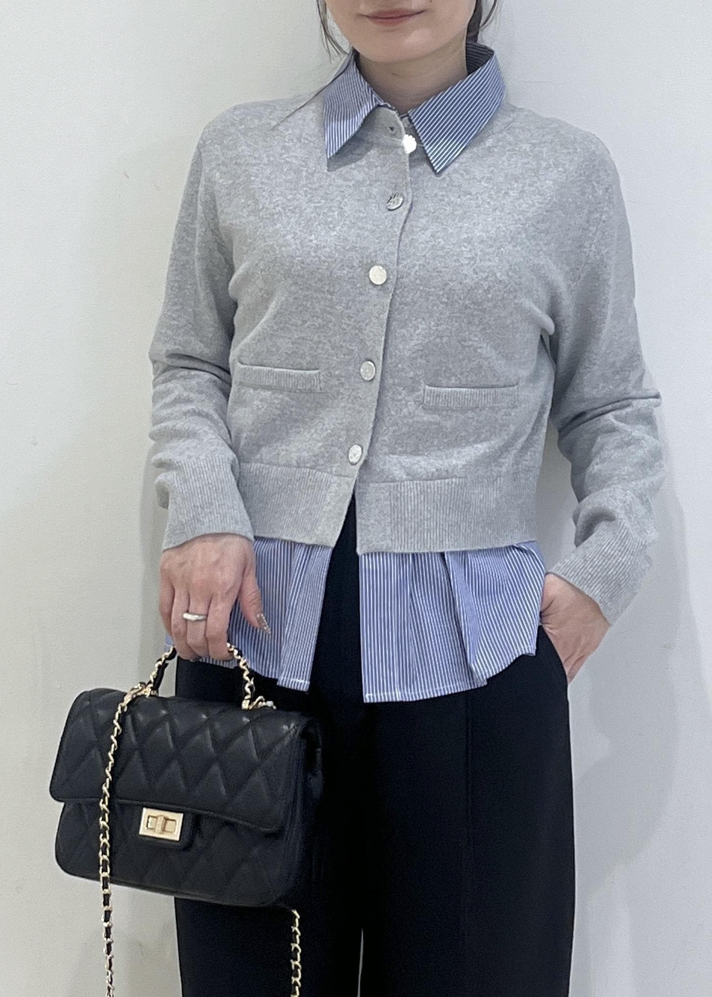 シャツがレイヤードされたようなデザインのニットカーディガン。