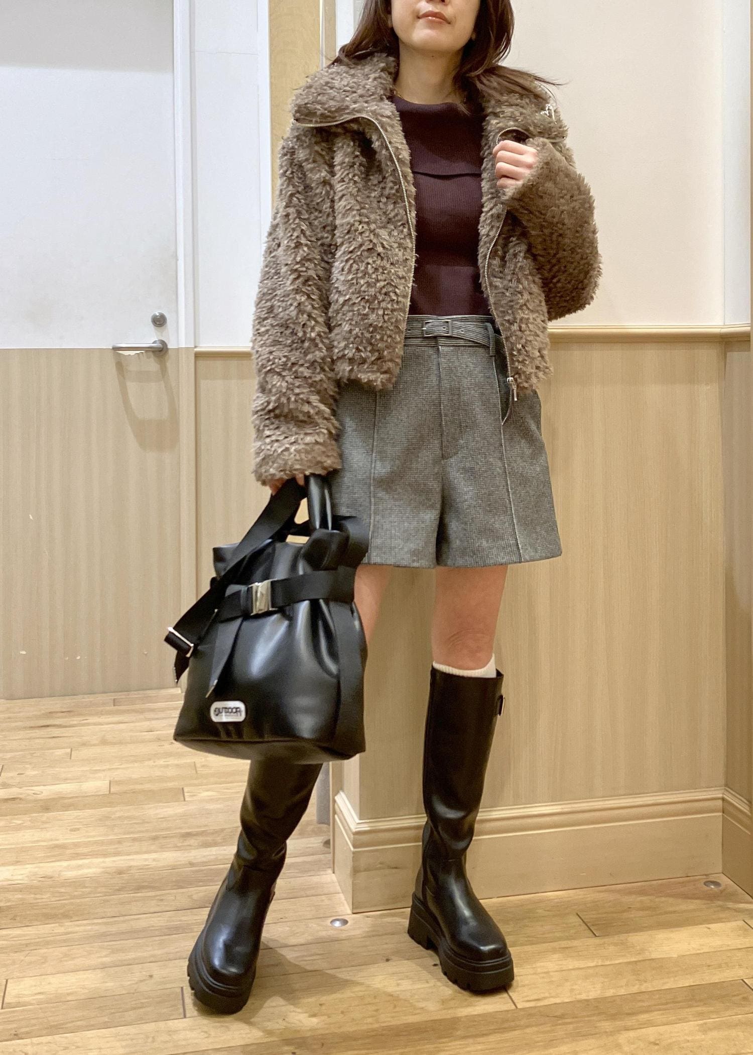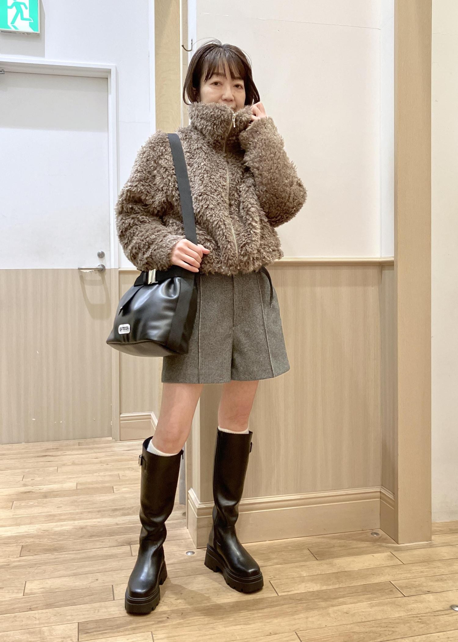 モコモコがカワイイSALEアウターを主役にハンサムにまとめてみました。インナーに合わせたアイテム達はダークカラーを選んだのがポイントです。身長が155cnなのでモコモコアウターの時はショートパンツで合わせてスッキリ見せるのが好きです。
