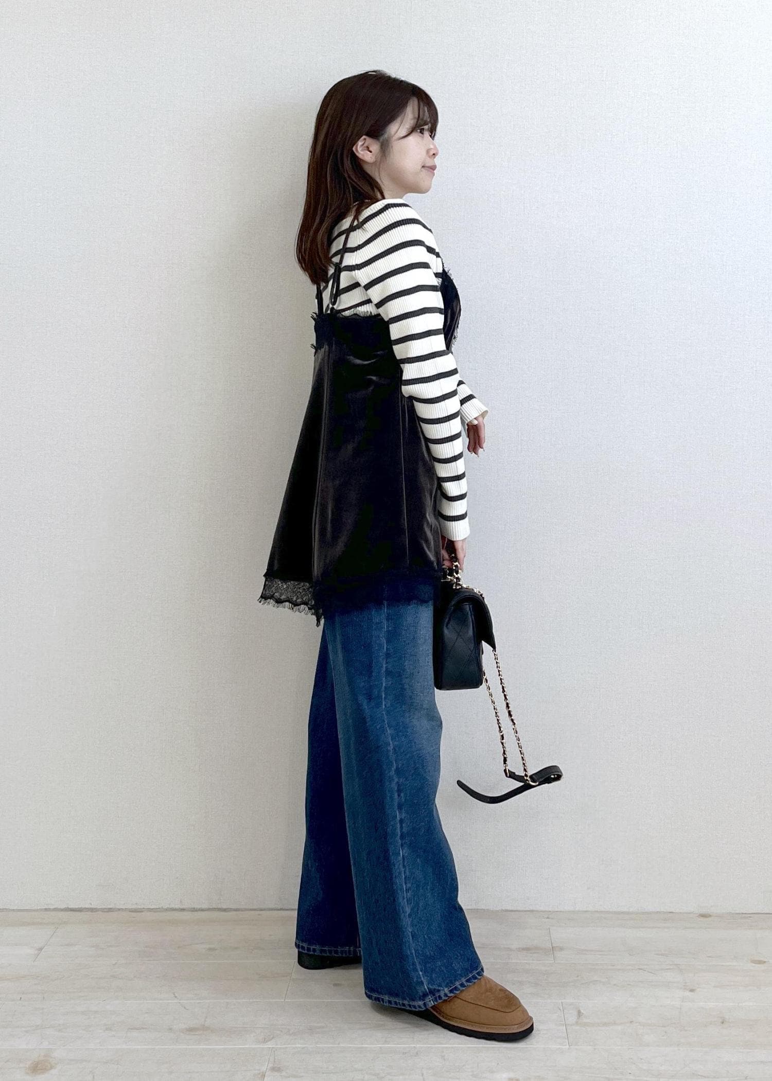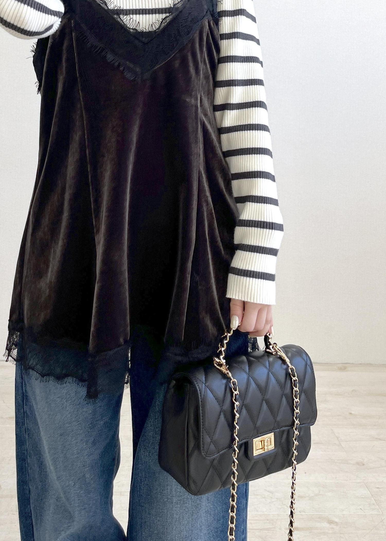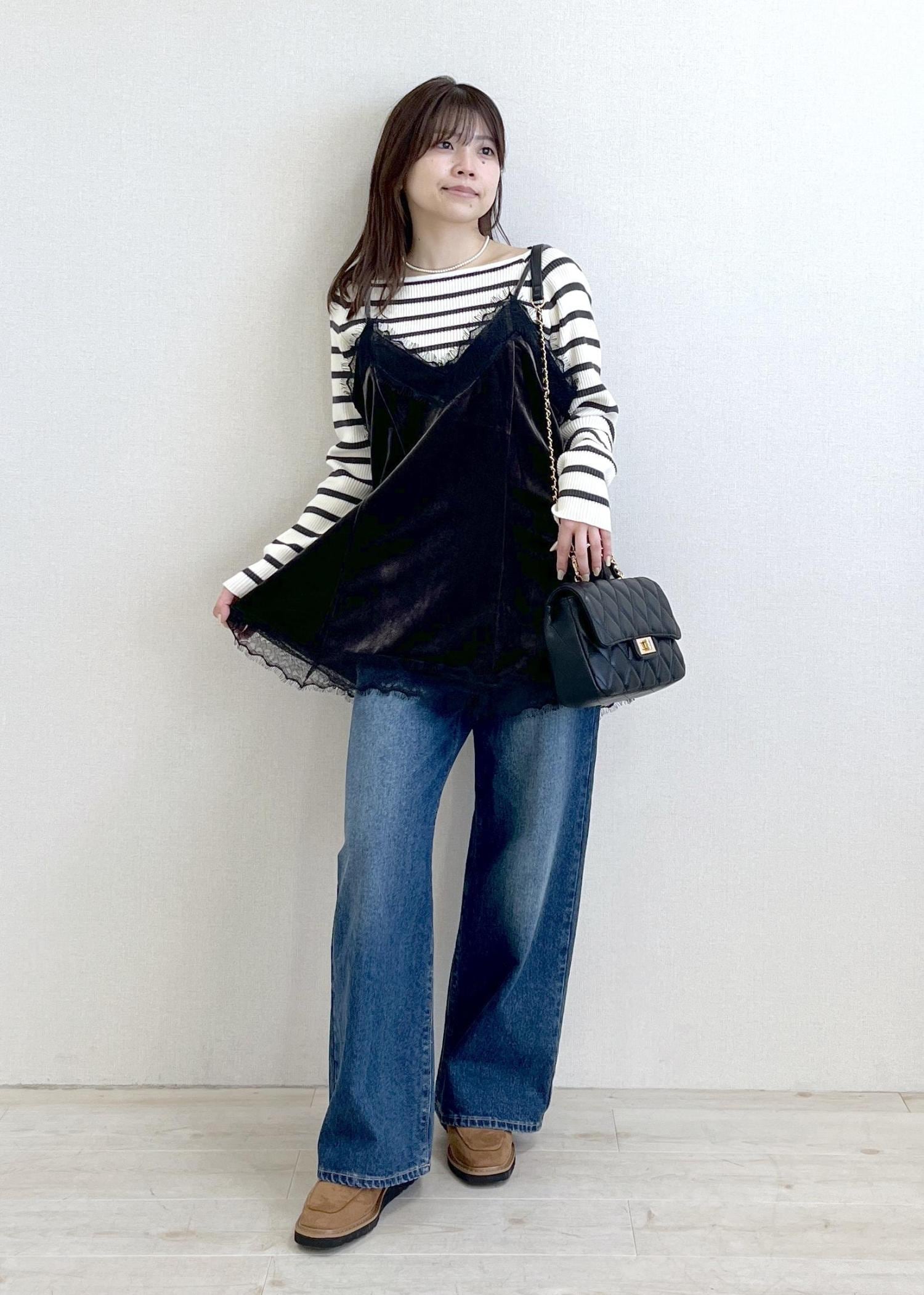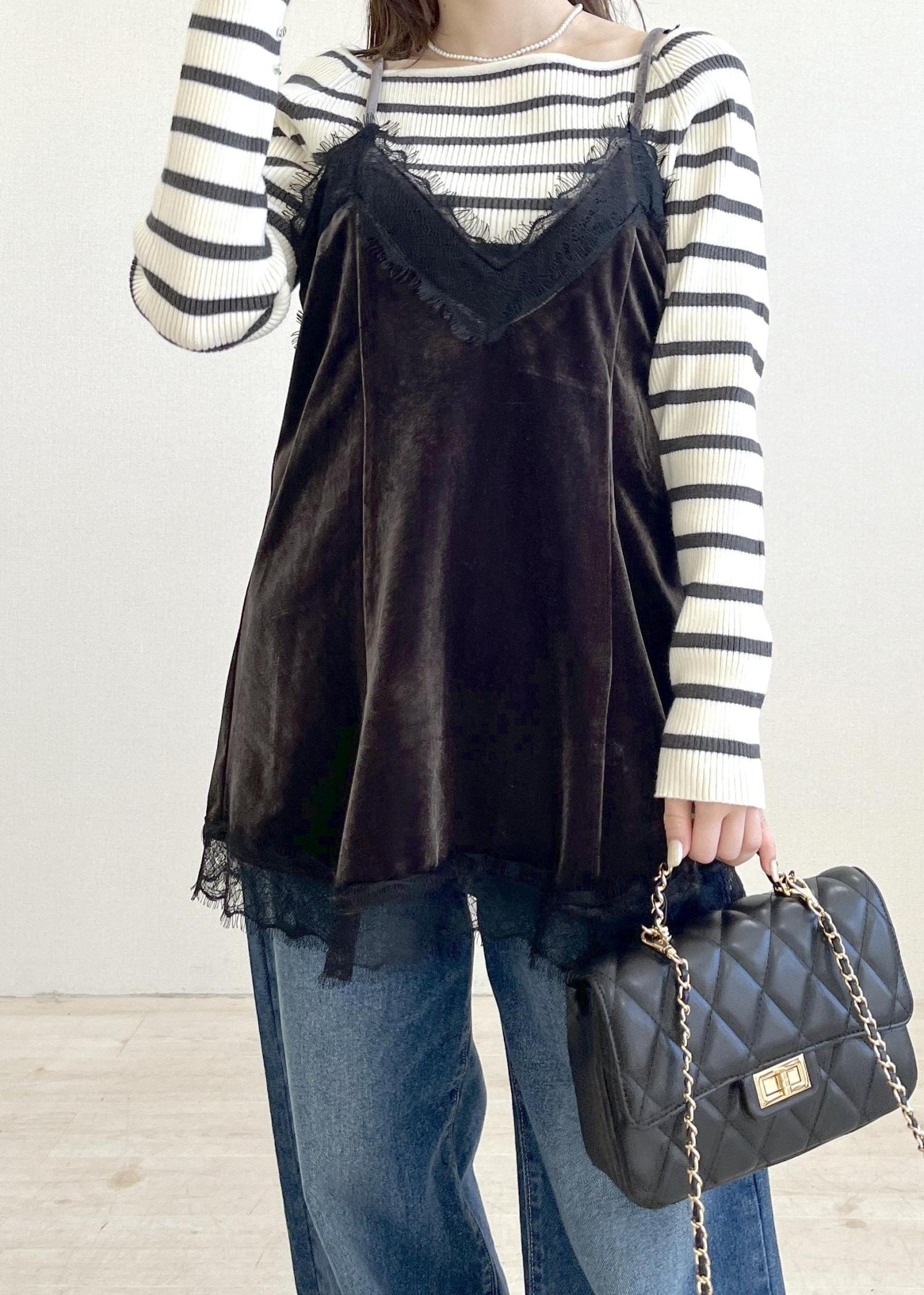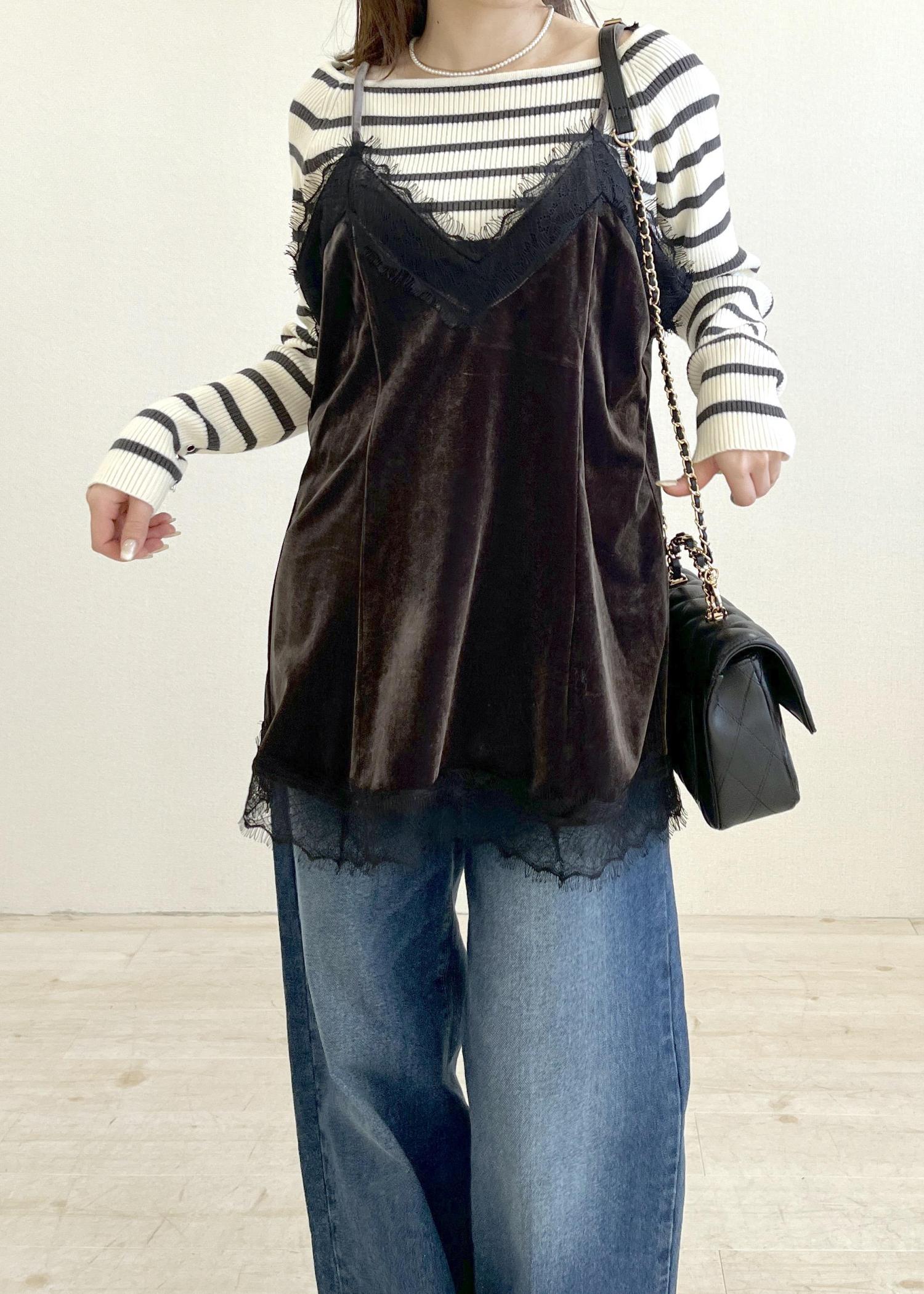 2BUY10%OFFVISベロアレースキャミチュニックチャコール / F¥3,842レビュー身幅はゆったりめなので多少厚手のニットをレイヤードしても余裕がありそうです。