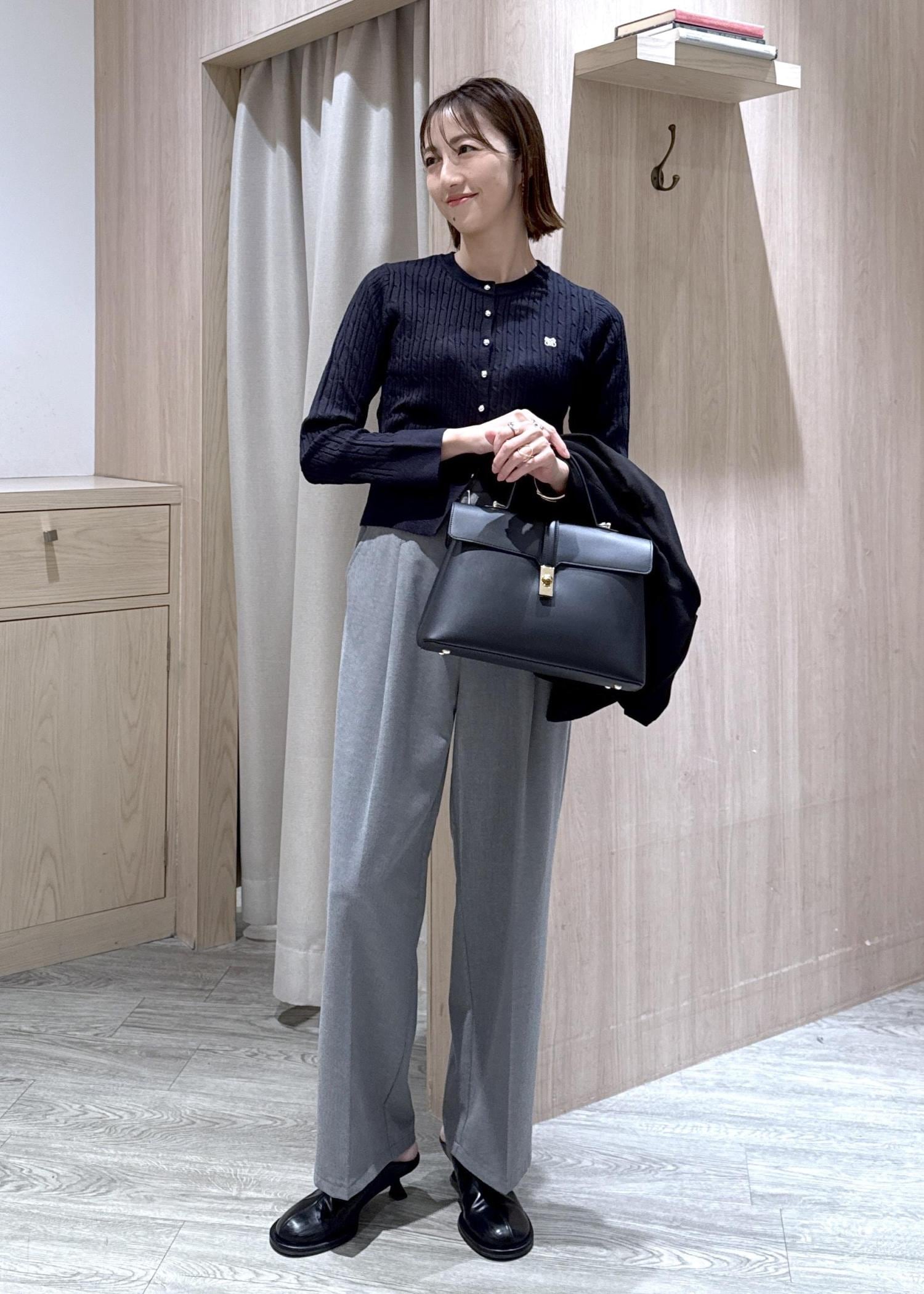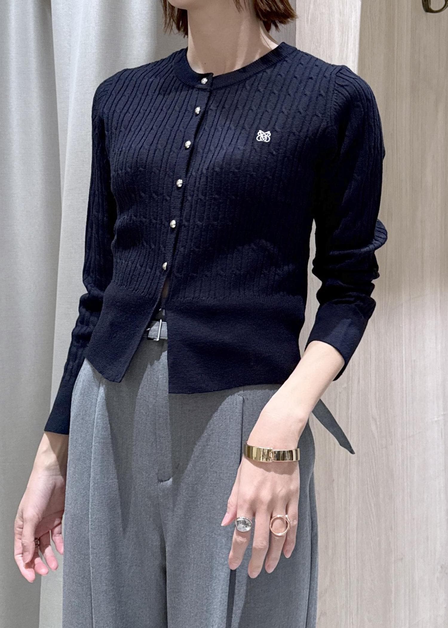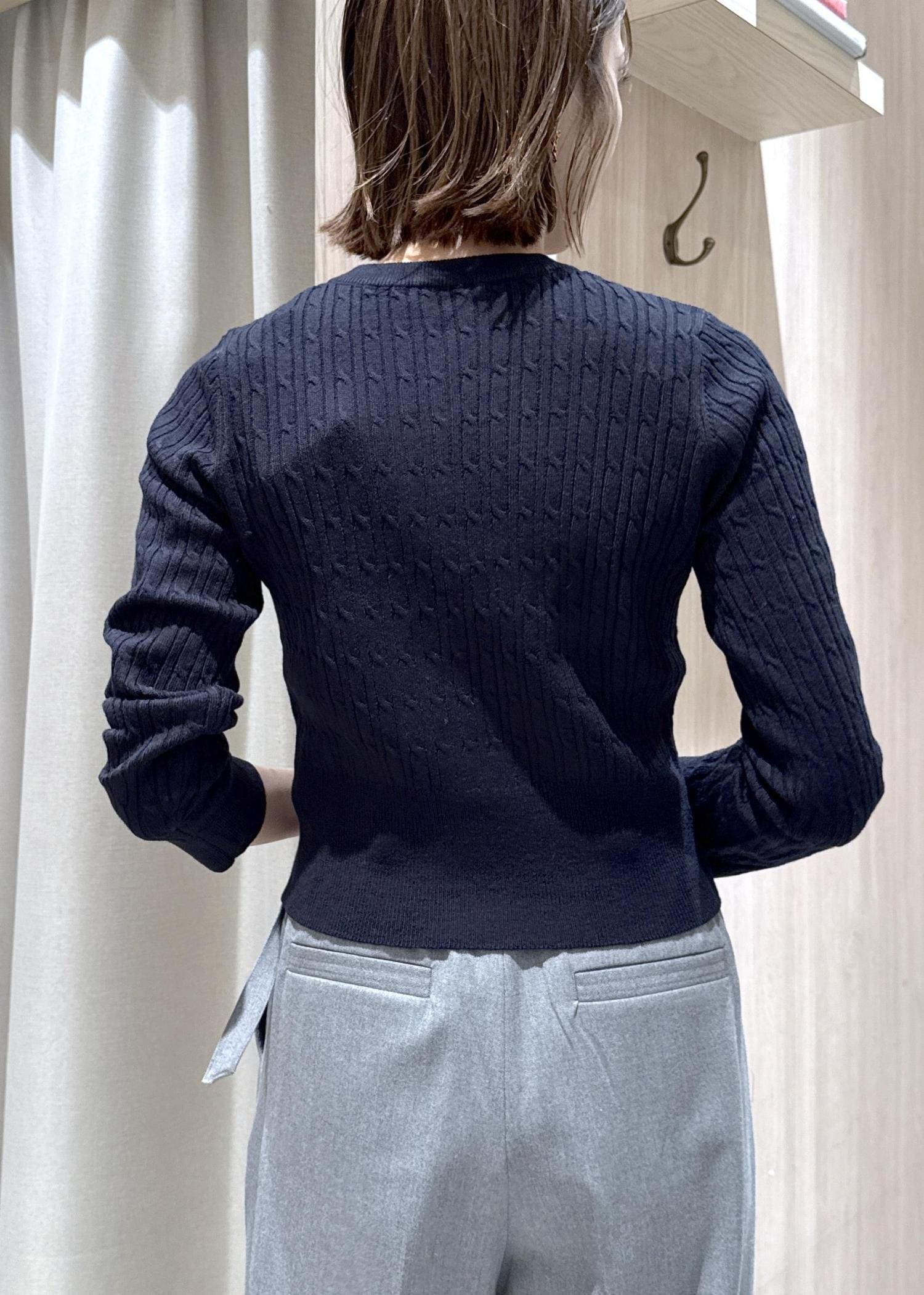 ハイゲージのケーブル編みのカーディガンなのでオフィスカジュアルにもピッタリ!