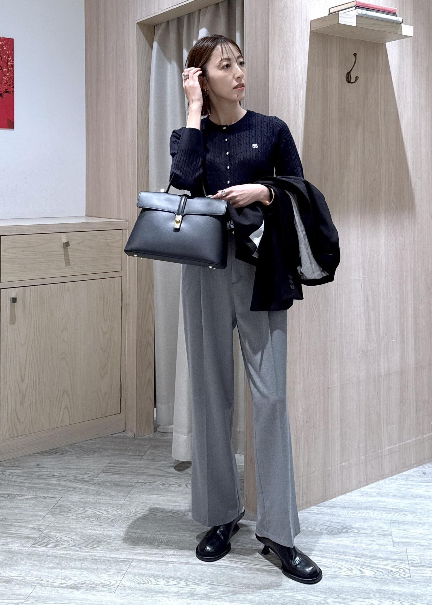 美easyジャケットにコンパクトな丈感のカーディガンを合わせた通勤コーデです♪