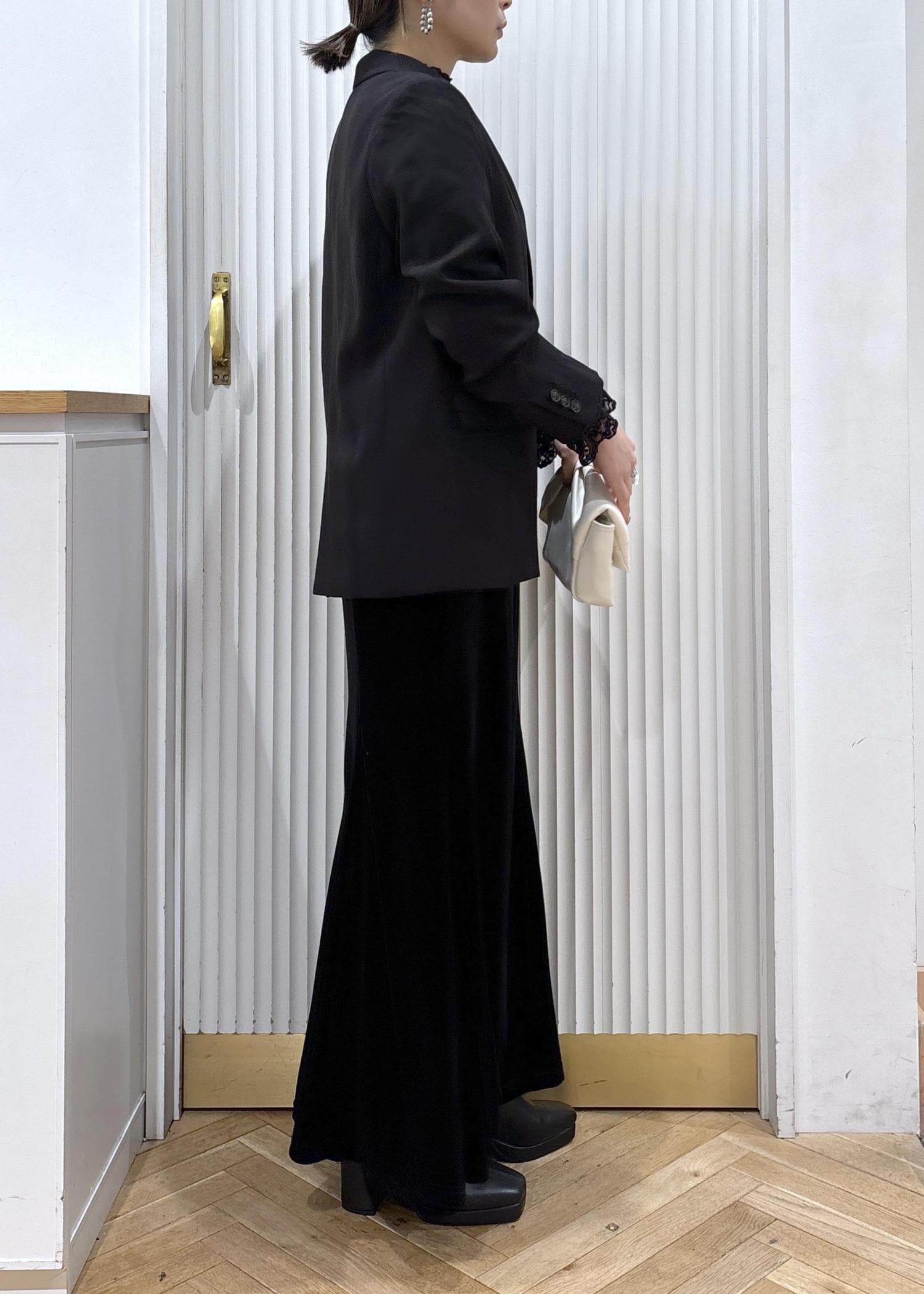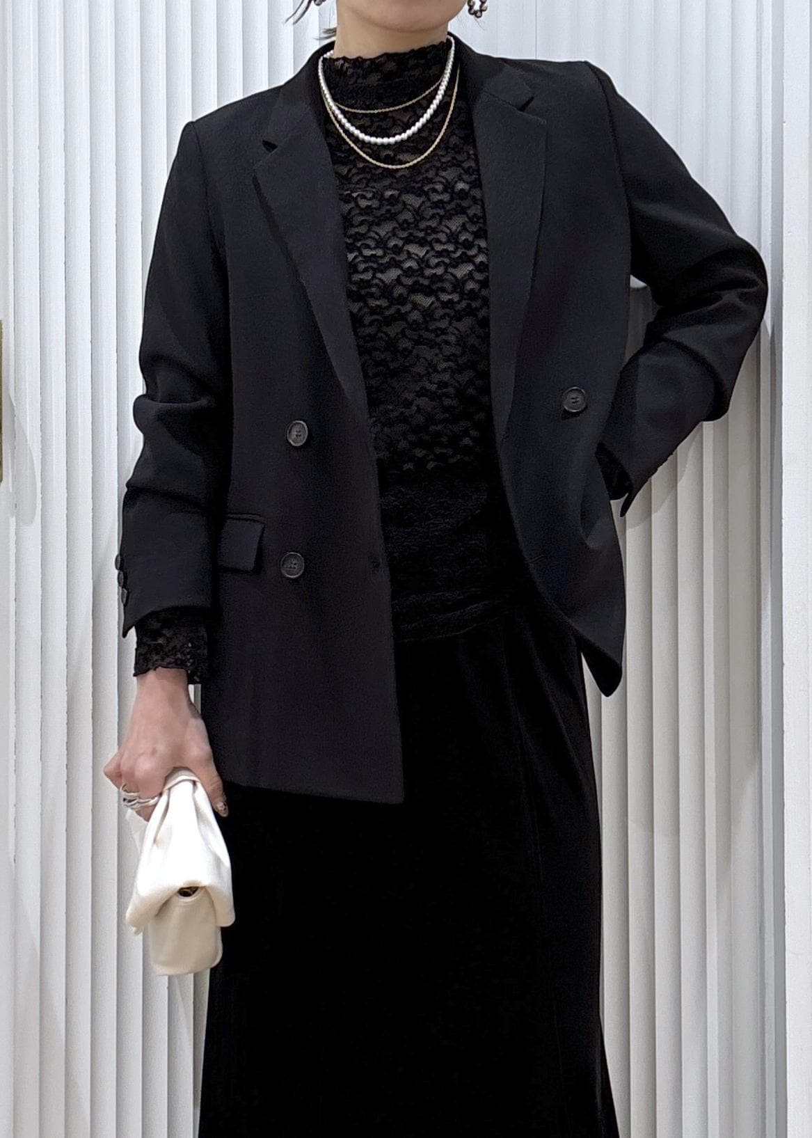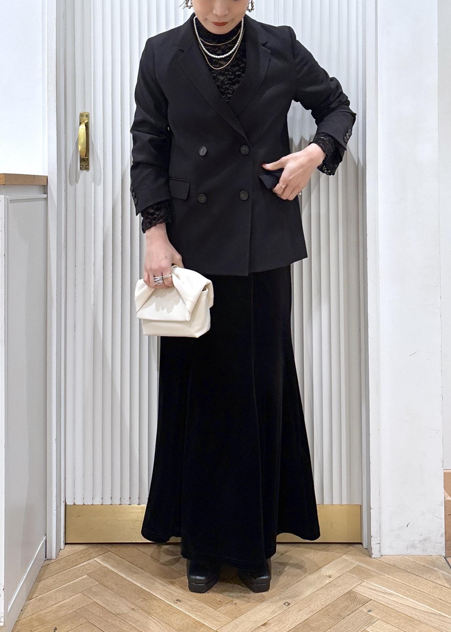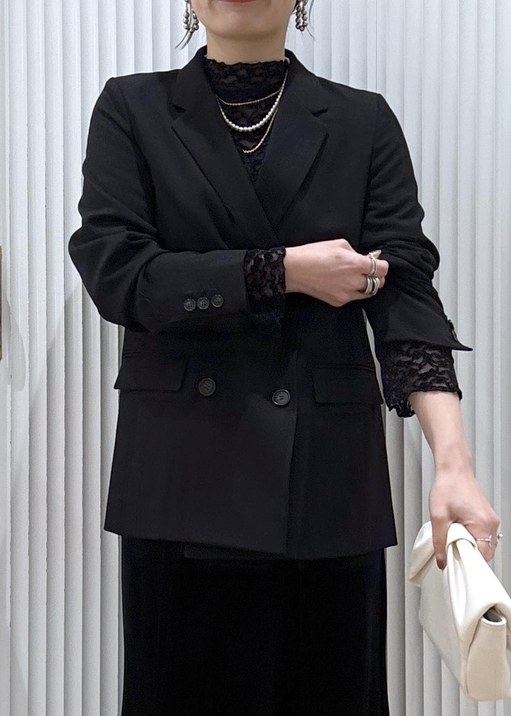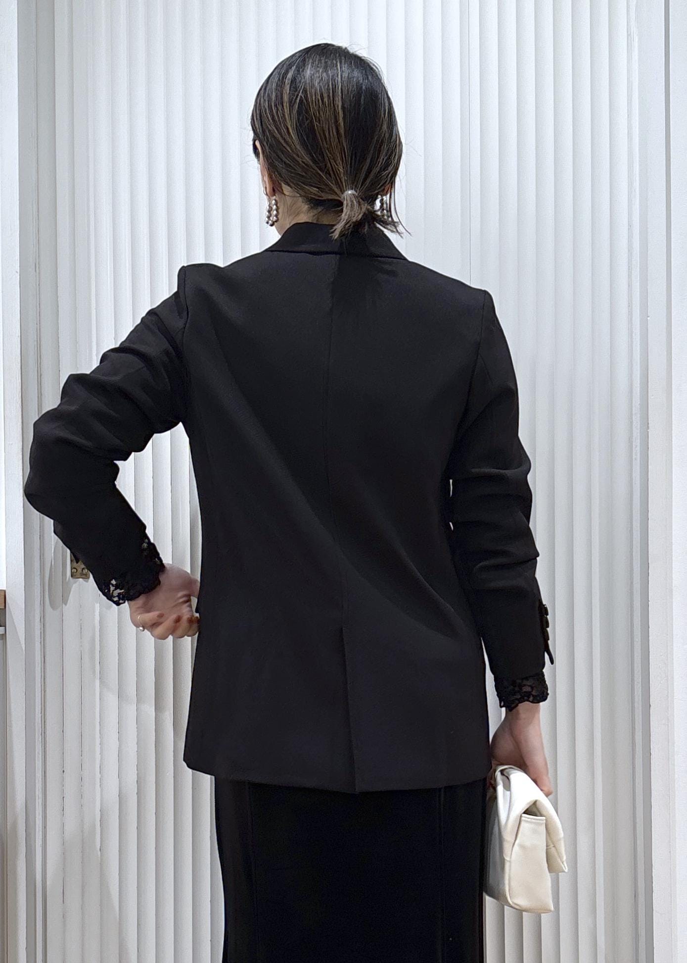 インナーにはシアー感のあるレーストップスを使ってブラックでまとめた、シックなセレモニーコーデ。
