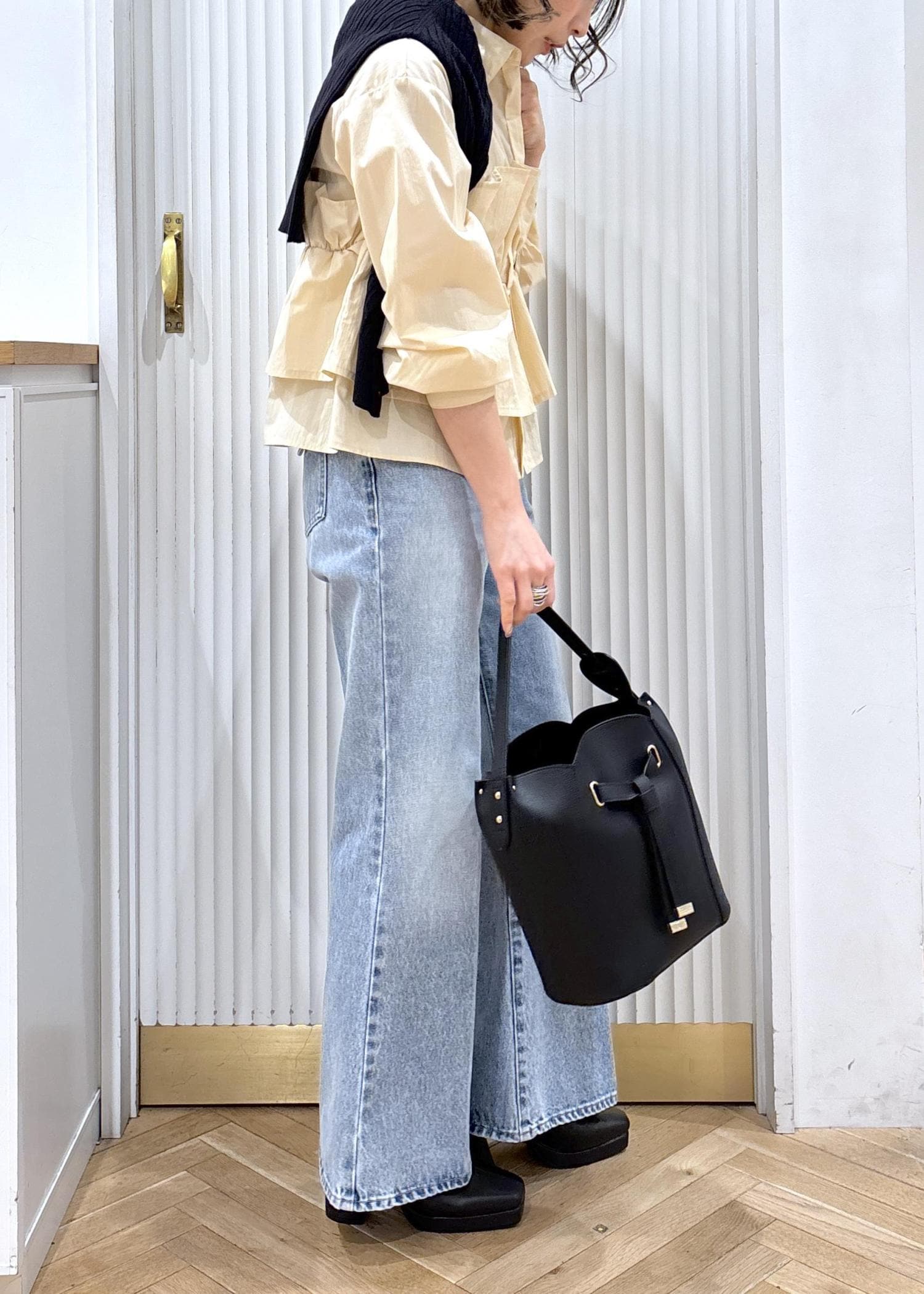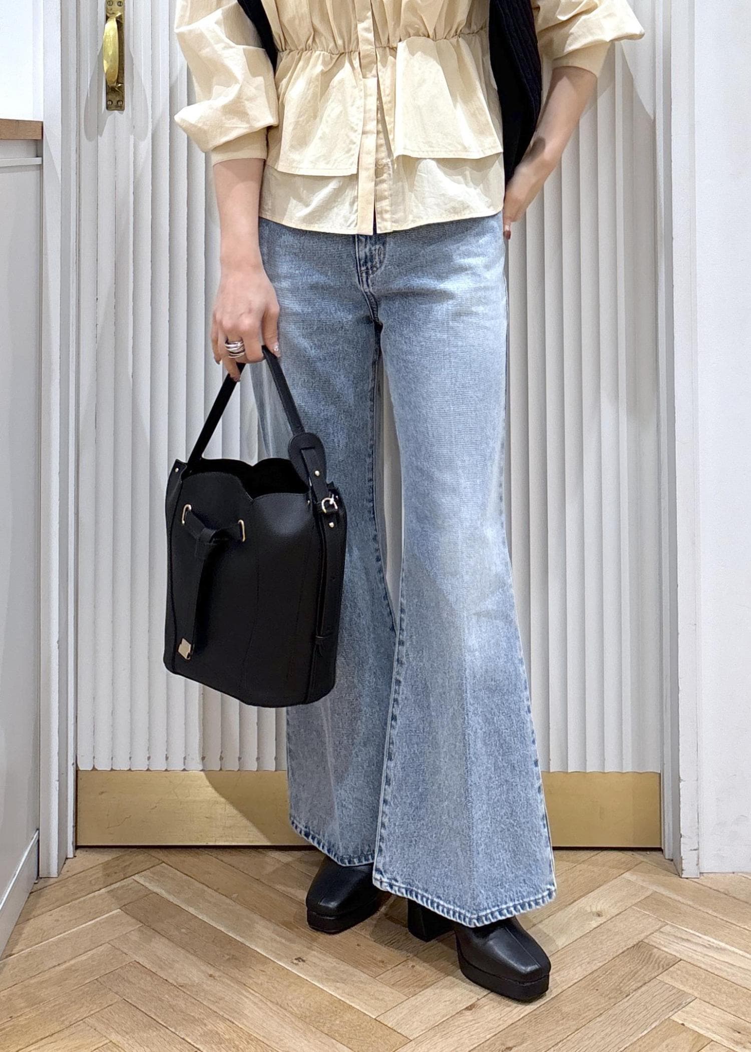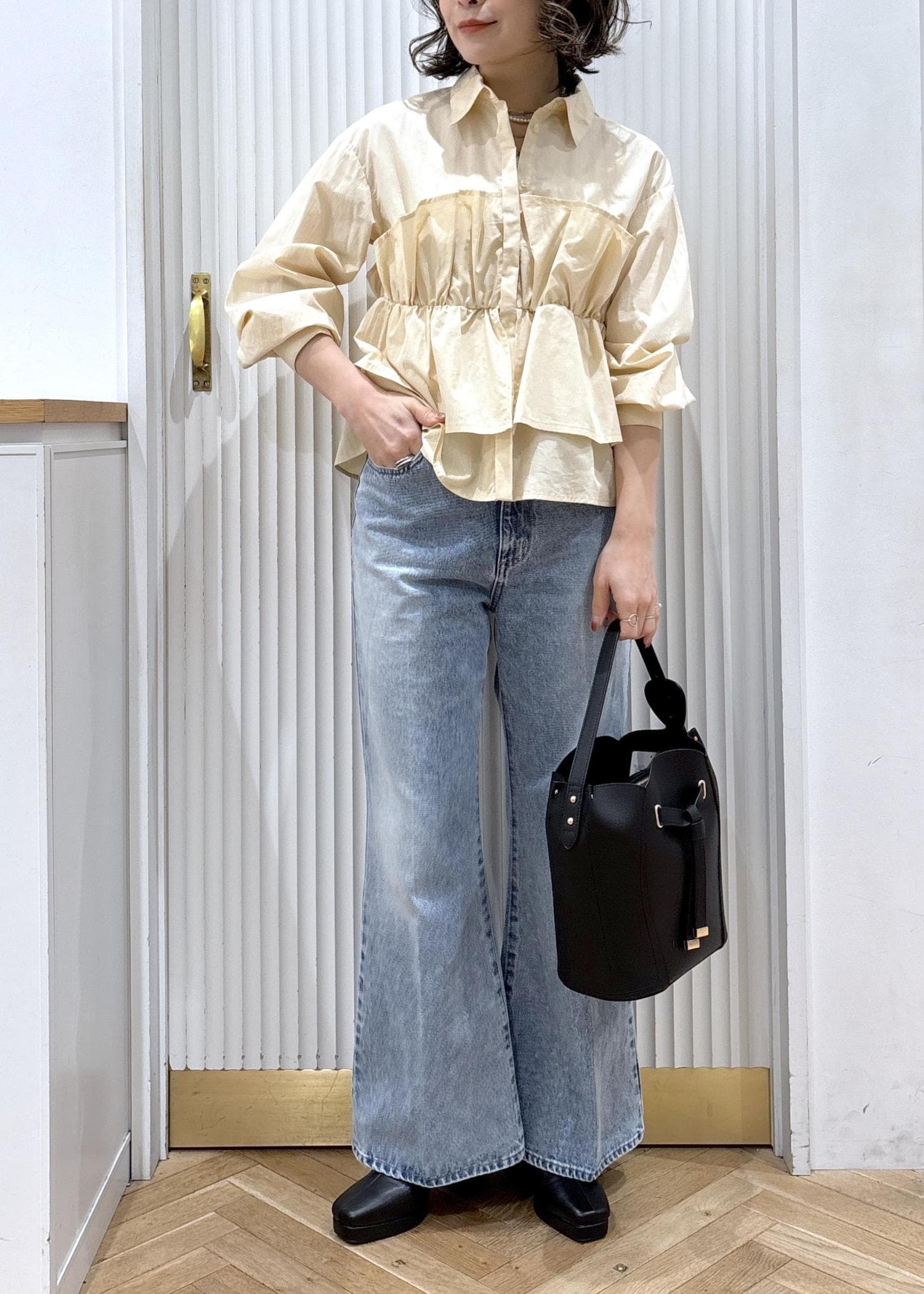 1枚でちゃんと可愛い!春を意識してベビーイエローをチョイス♡着映えシャツとフレアデニムのカジュアルコーデです♡