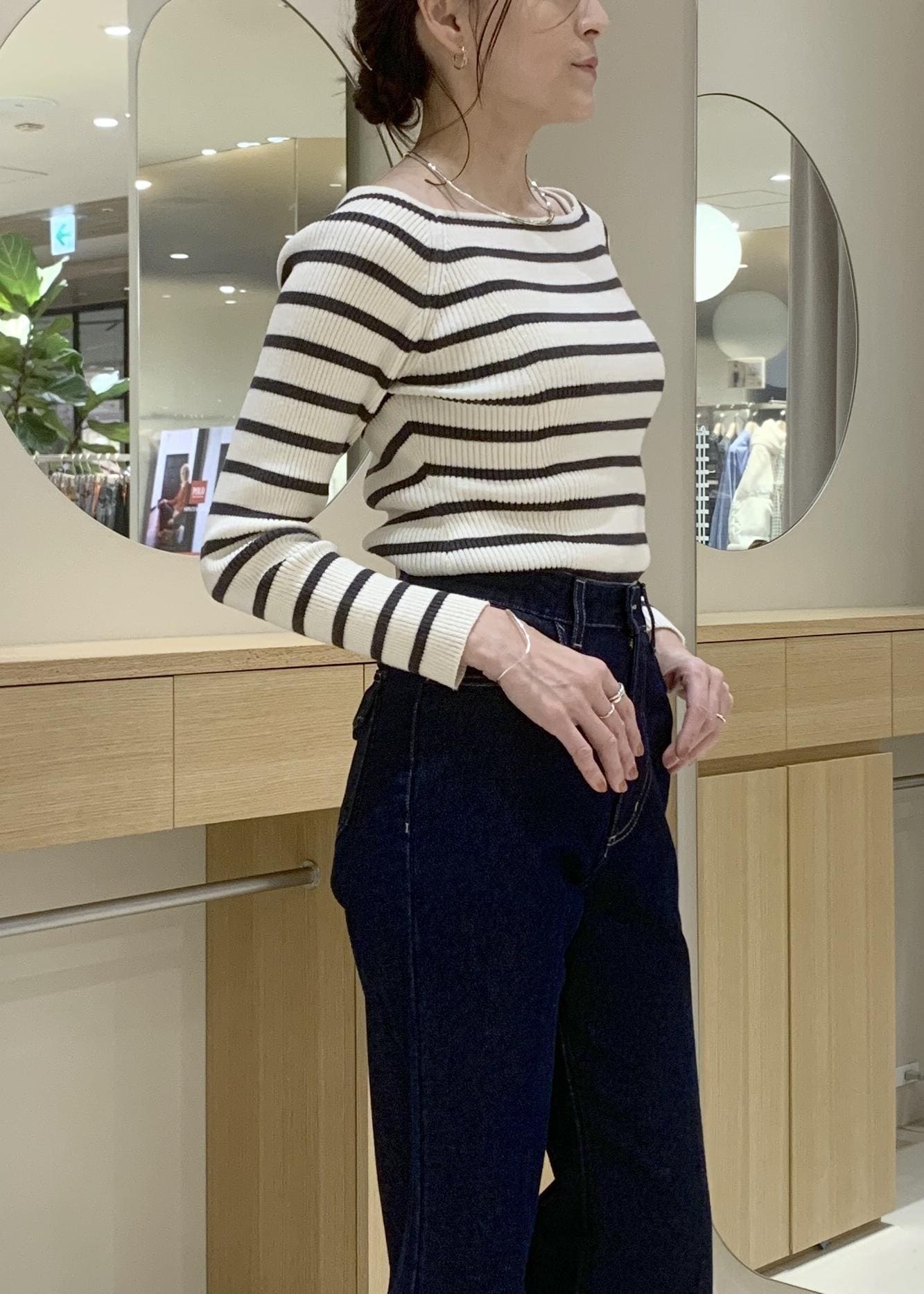 首元のデコルテラインが綺麗に見えて、女性らしい印象ですよ。一枚で着ても袖口のデザインがインパクトがあり、物足りなさを感じません。 -