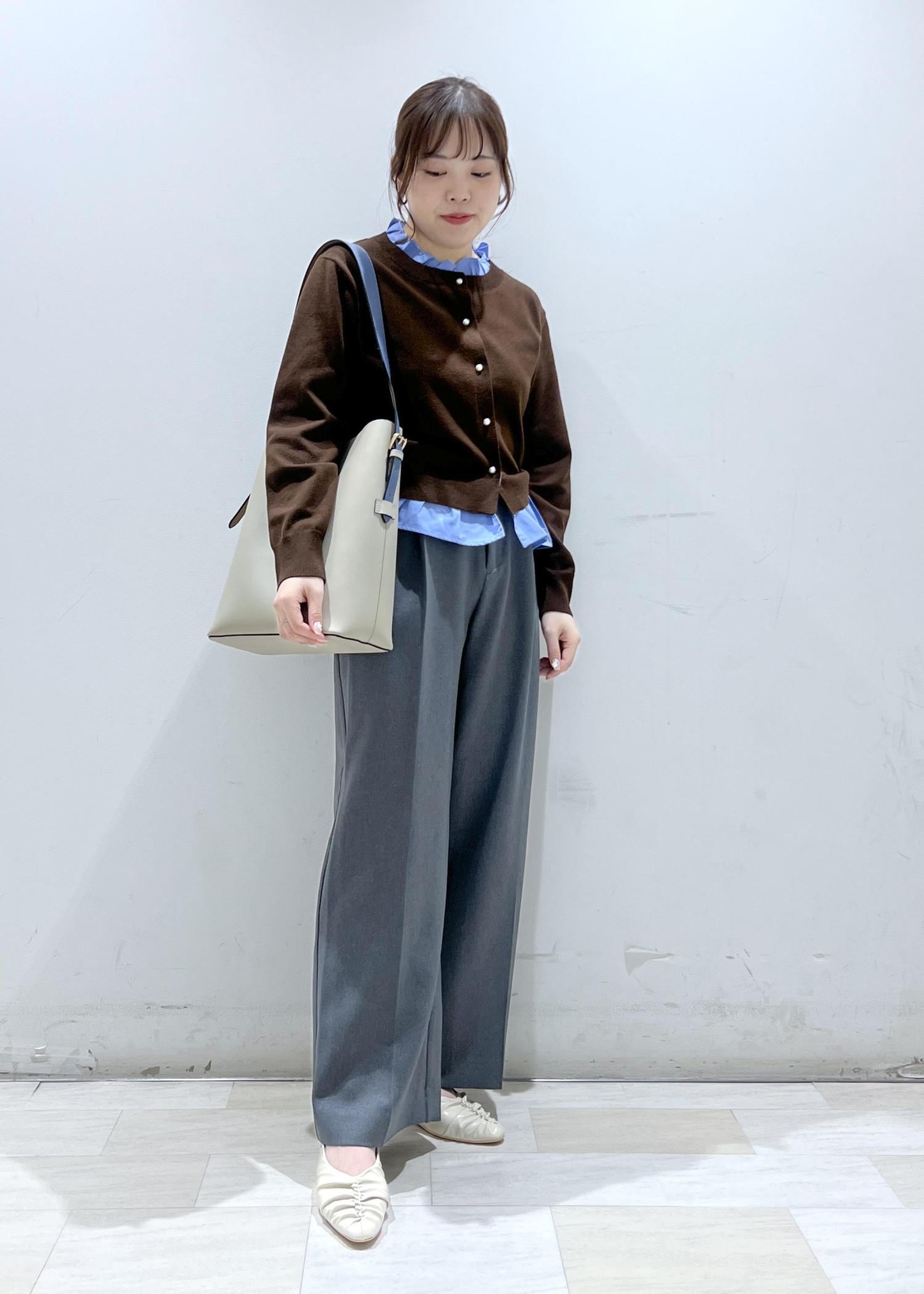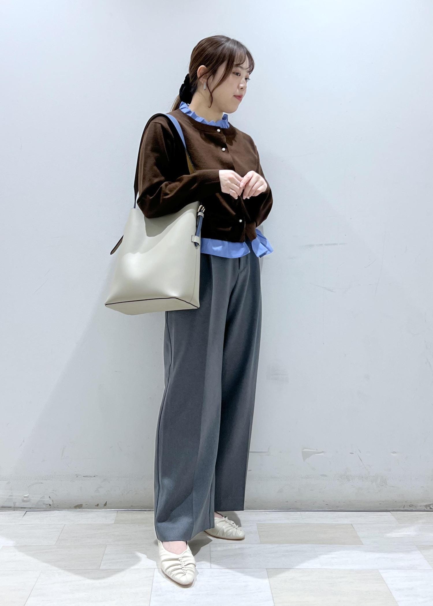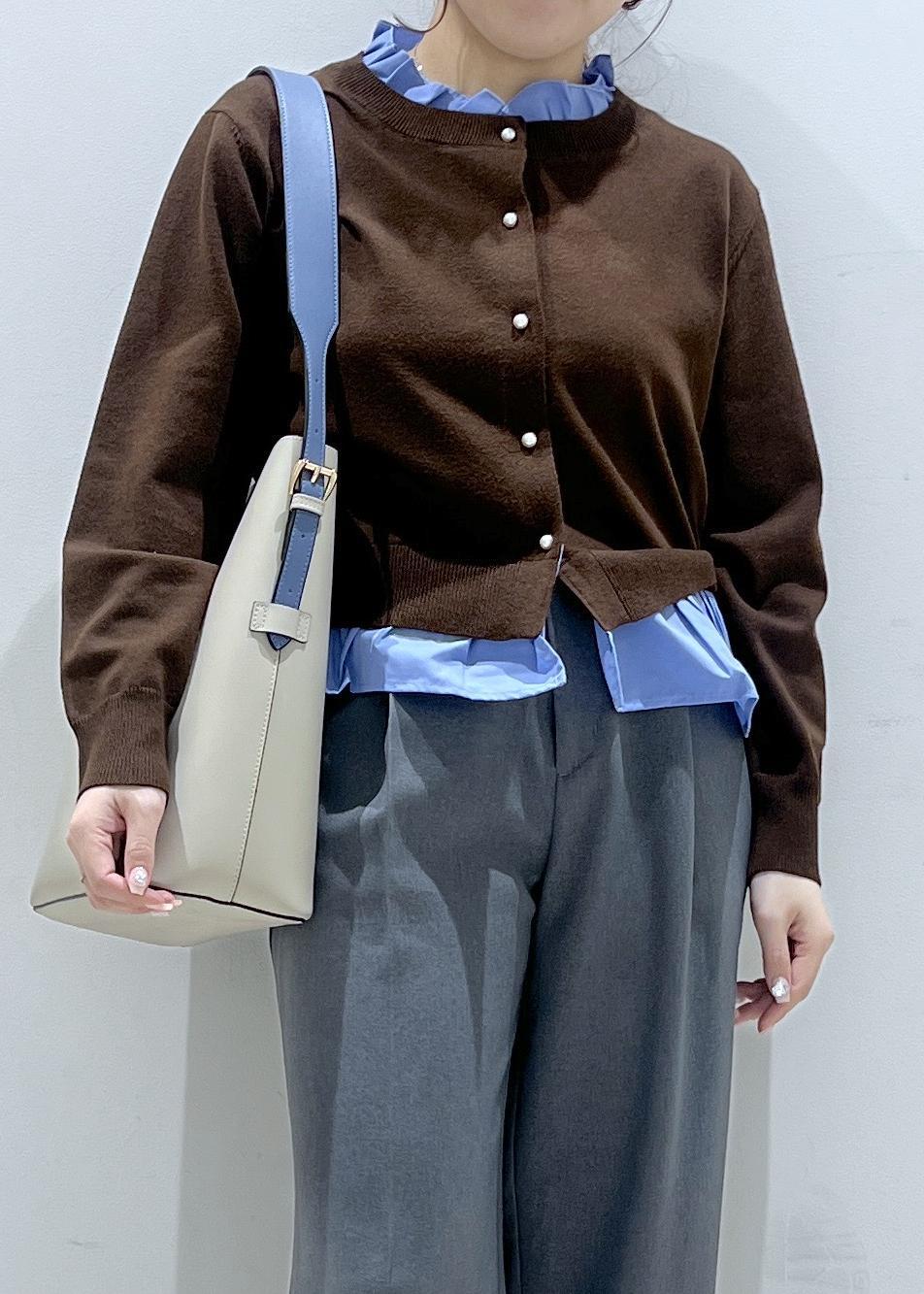 仕事でも普段使いでもさまざまなテイストで着れるデザインで、着用しているカラーはブラウン×ブルーの配色がとても可愛いです。ほどよく薄手なので3シーズン着やすい素材です。 -