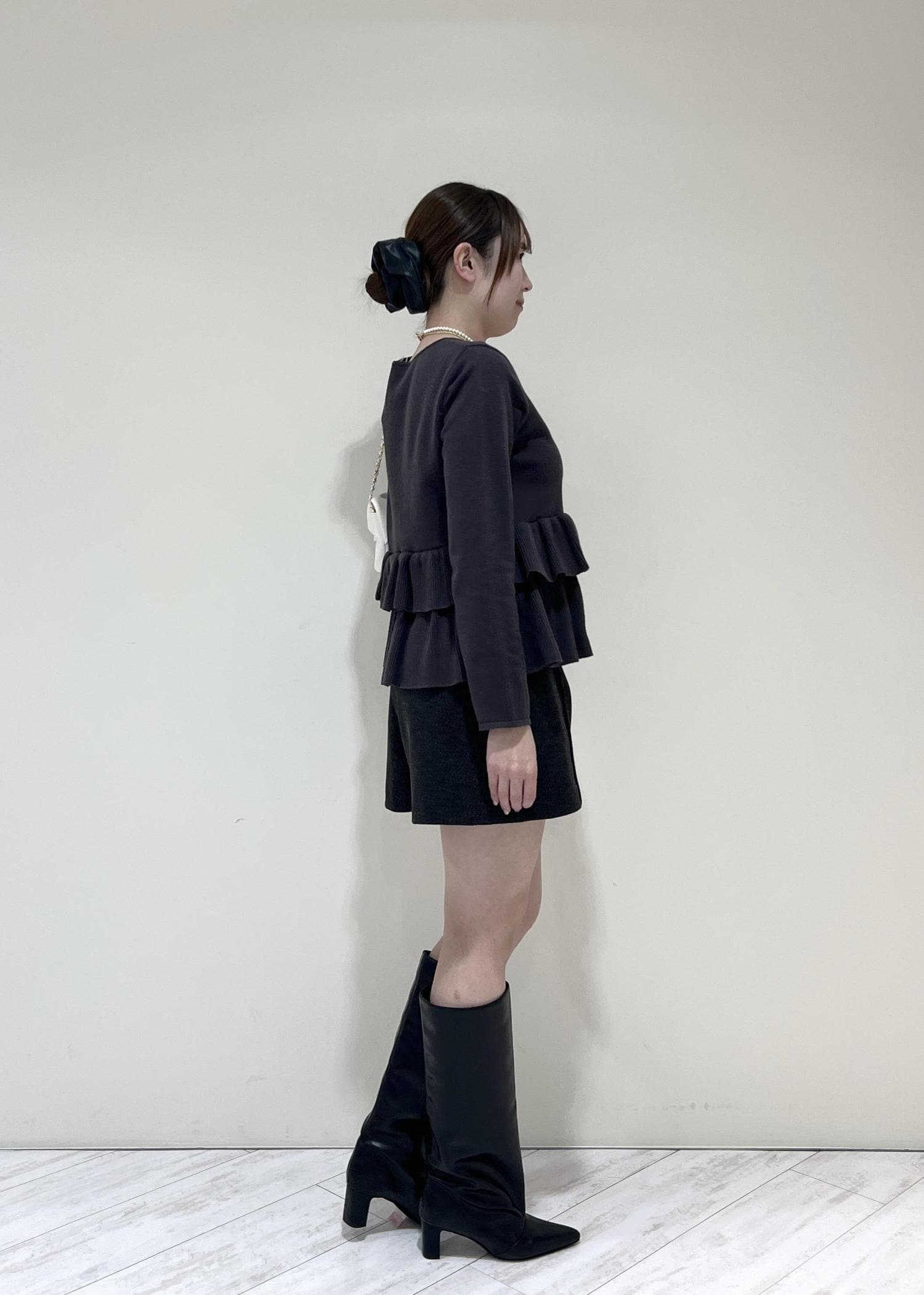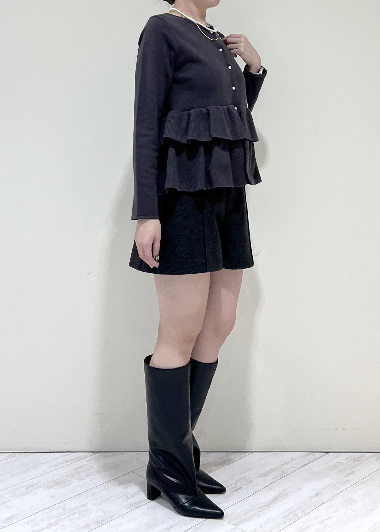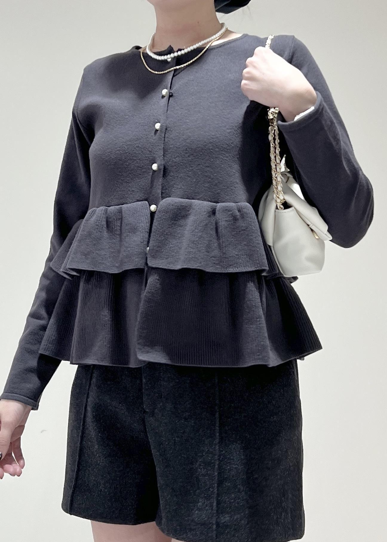 VISティアードペプラムニットカーディガンチャコール / F¥6,589レビューカーディガンとしても一枚着としても着回せるデザインです!着丈は腰にかかるくらいで、サイズ感は程よくゆったり着られるのでインナーにハイネック等を合わせても◎