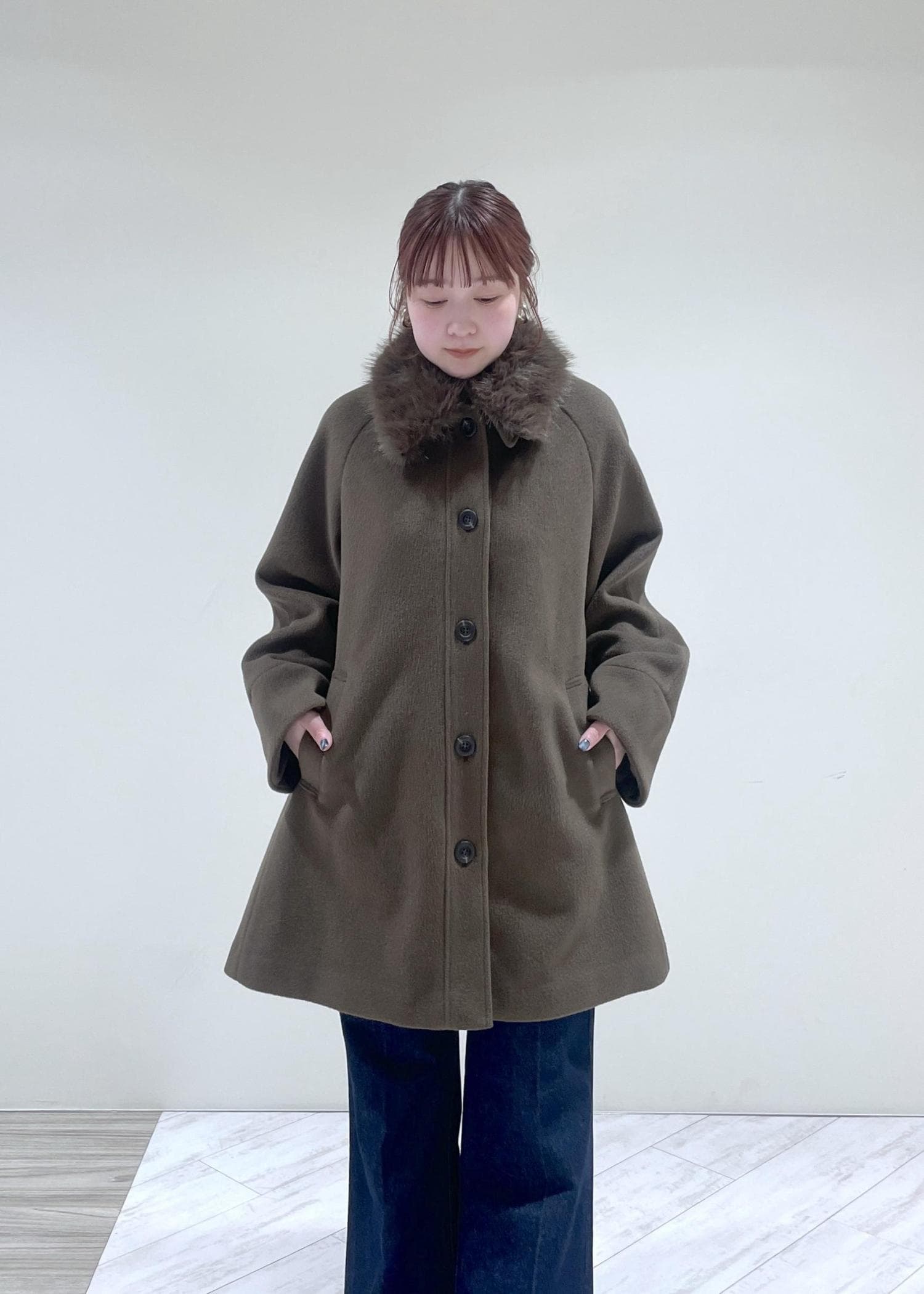 2BUY10%OFFVISファー付きAラインステンコートダークブラウン / F¥14,784レビューAラインシルエットで横幅は広めですがオーバーサイズすぎず、程よいゆるさが可愛いミドル丈コートです♡襟元のファーは取り外し可能なので、綺麗めから普段使いまで様々なシーンで着て頂けます!