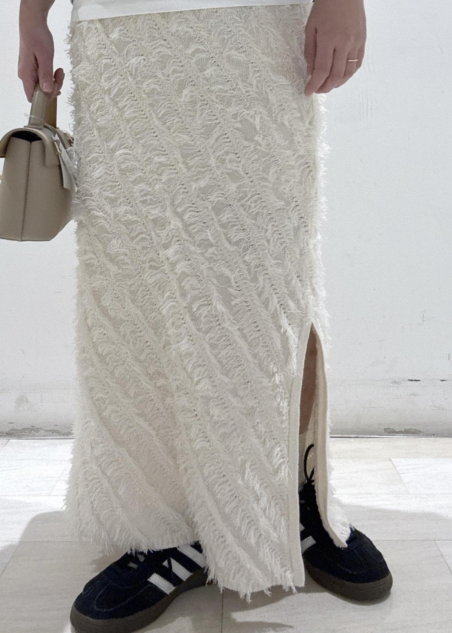VISフリンジニットナロースカートキナリ / F¥4,612レビューフリンジの表面感が華やかになるデザインスカート。