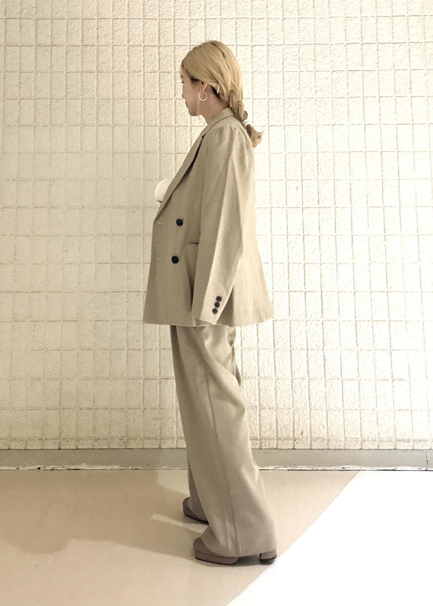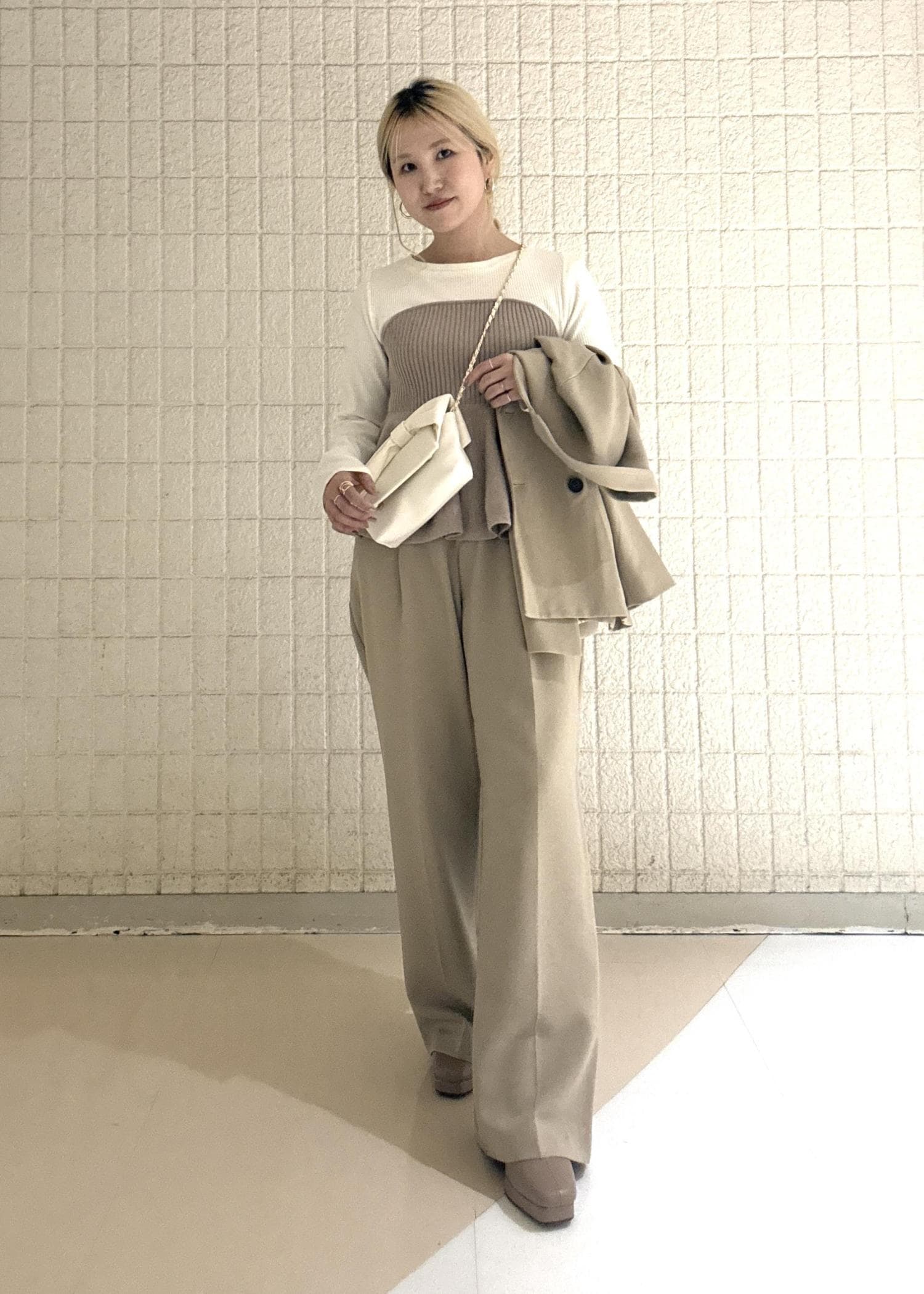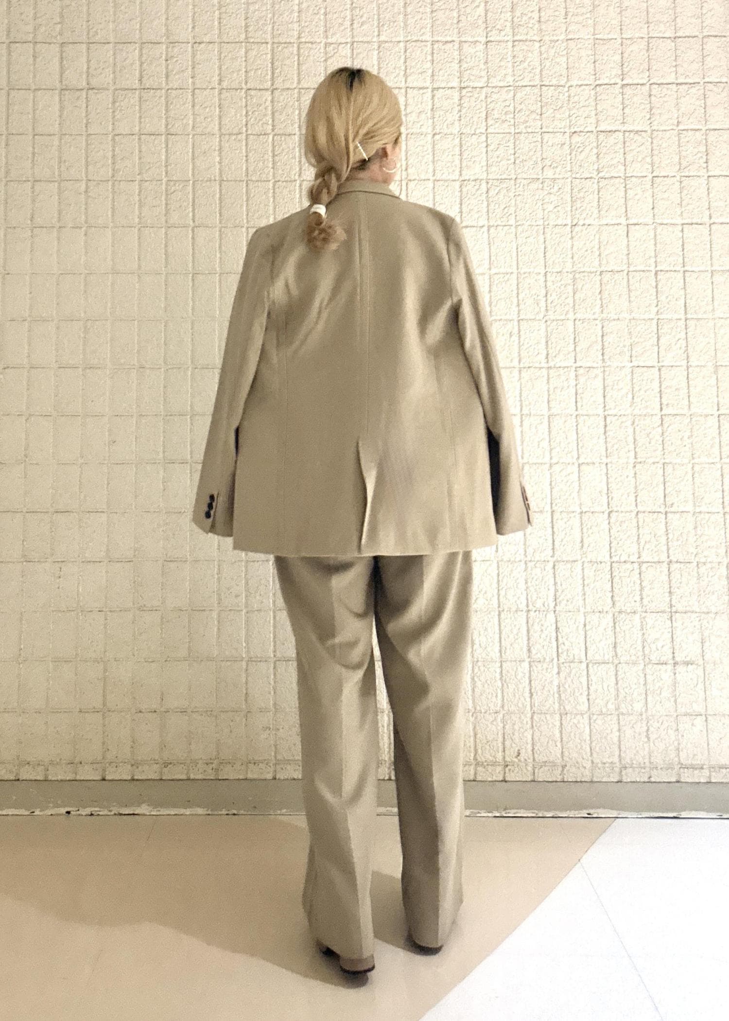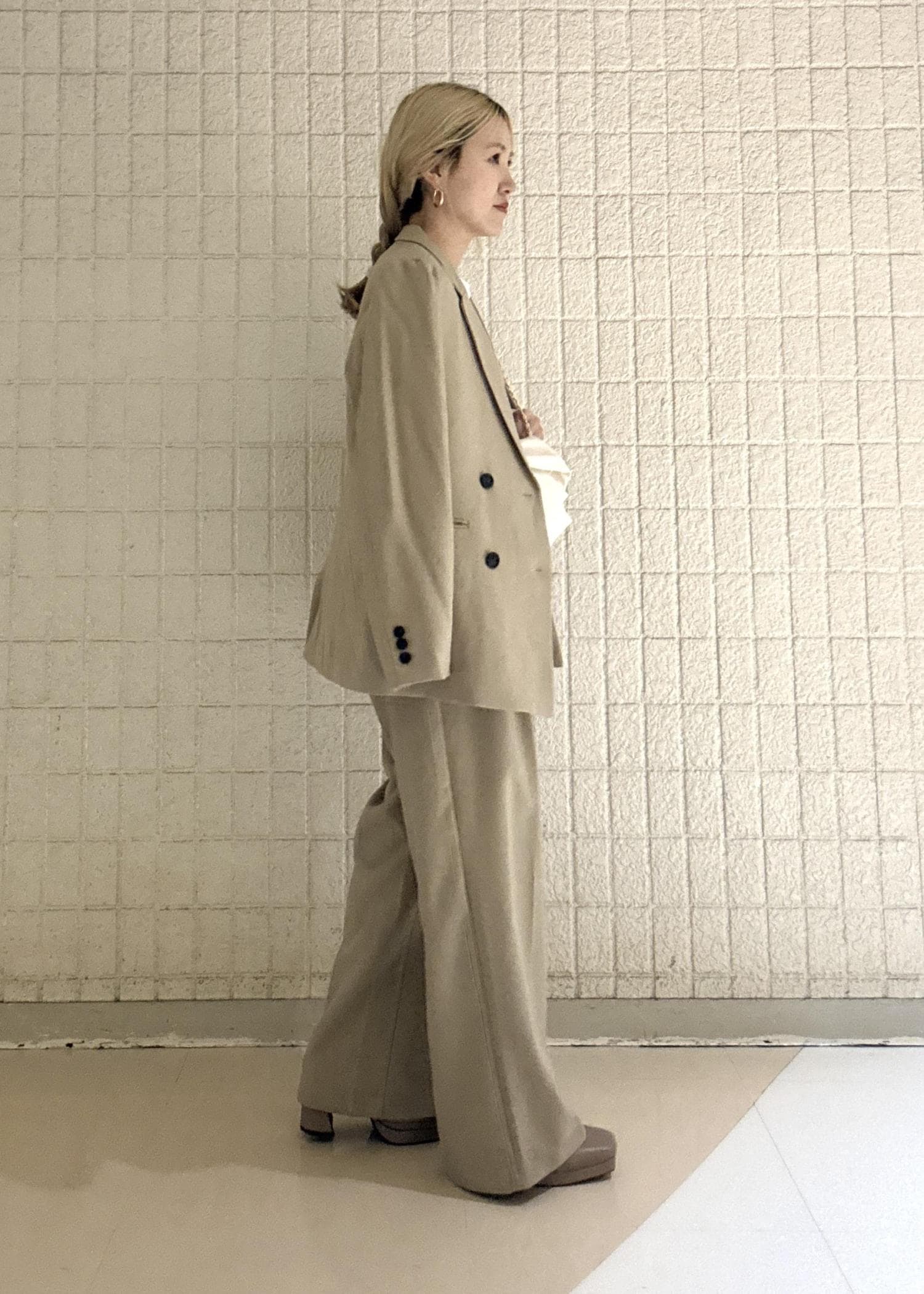 かっこよくなりがちなパンツのセットアップコーデをインナーと小物を工夫する事で、少しフェミニンで甘さのあるコーデにしてみました。