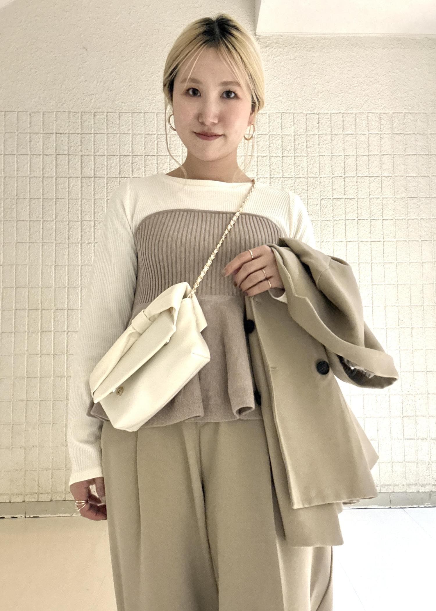 VISペプラムニットドッキングプルオーバーベージュ系 / F¥5,929レビュー胸下まで少しキュッと絞りのあるシルエットで裾はフレアで広がりがあるので腰位置が高く見えてスタイルアップして見えます。