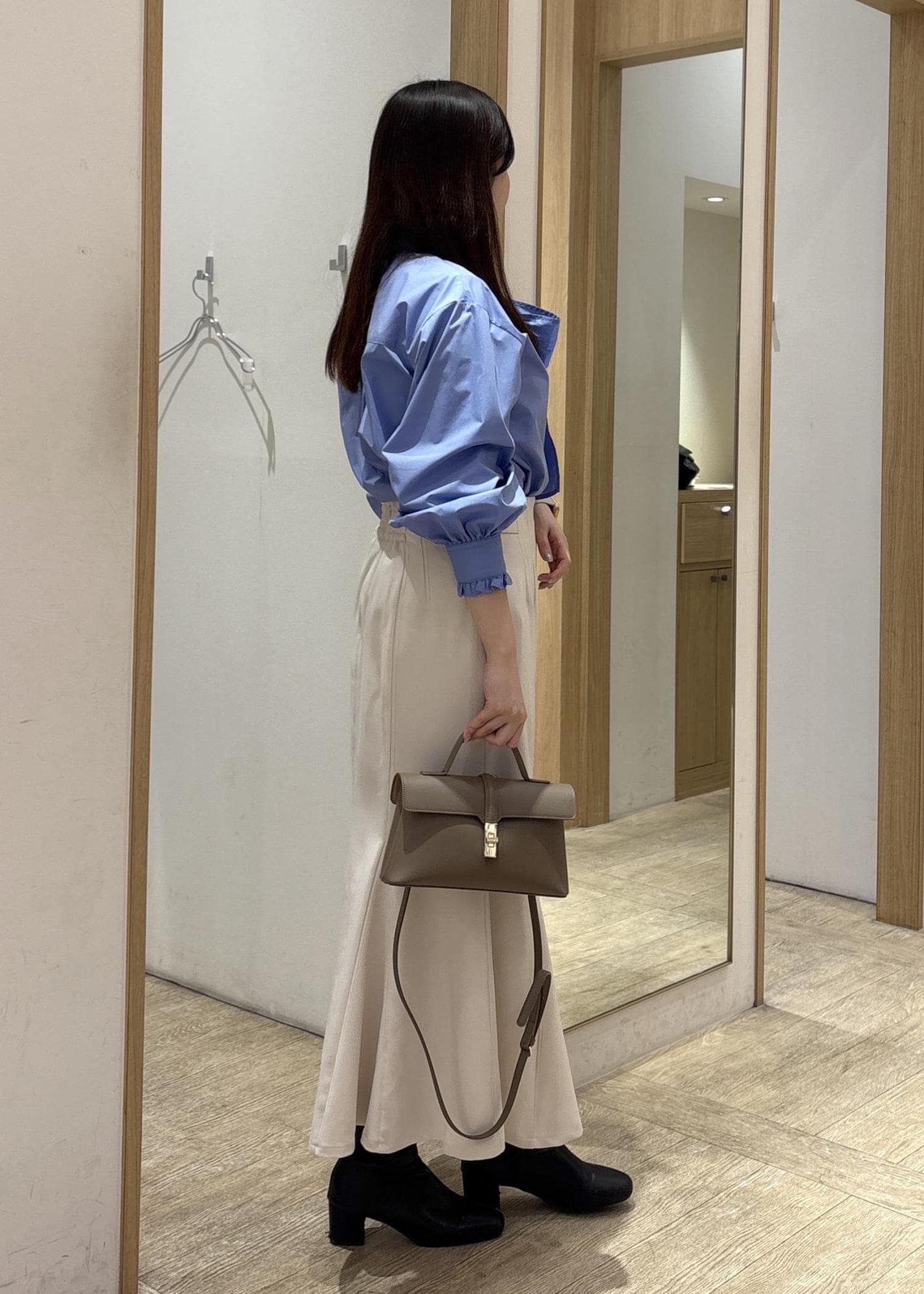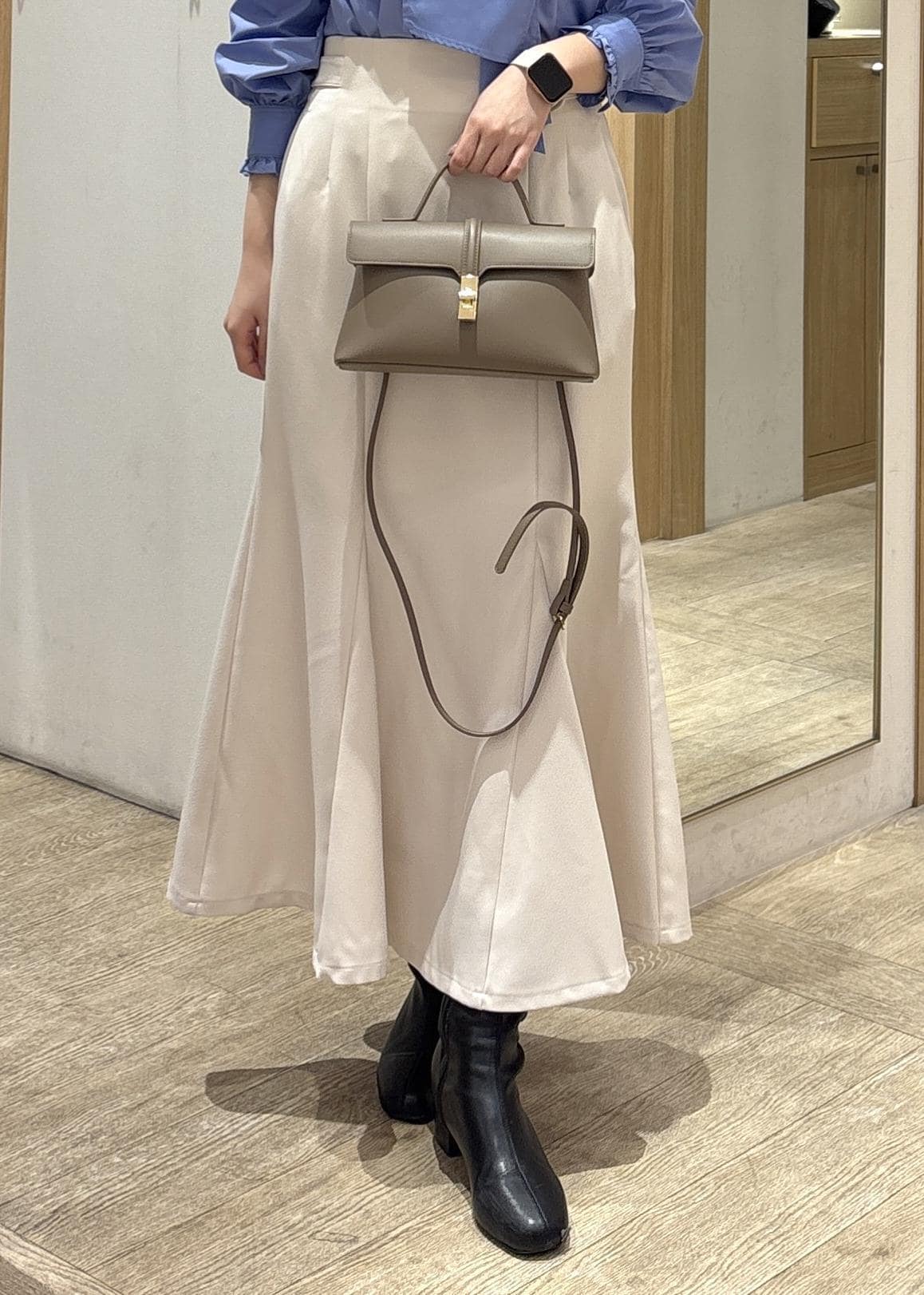 腰回りをすっきり見せ、裾に向かって広がるラインがスタイルアップにつながります。