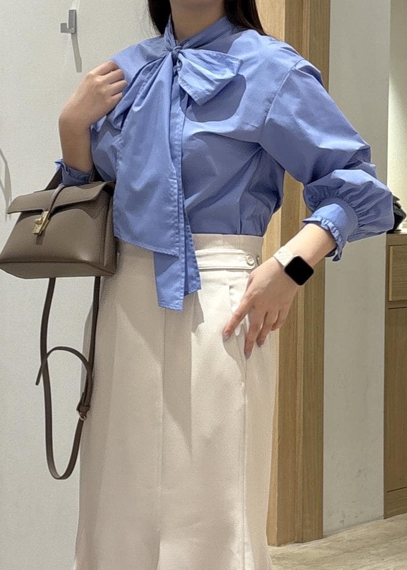 VISチェック&デニムアソートボウタイリボン付きスタンドカラーシャツサックス / F¥6,589レビュー程よいサイズ感でレースのインナーなどレイヤードしてもすっきりと着用できるゆとりがあります!
