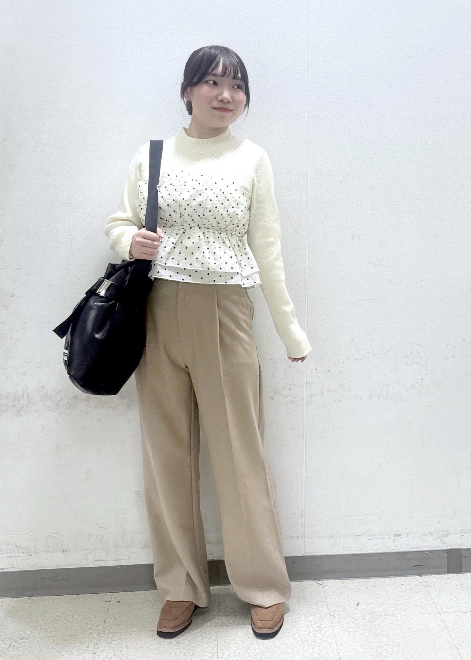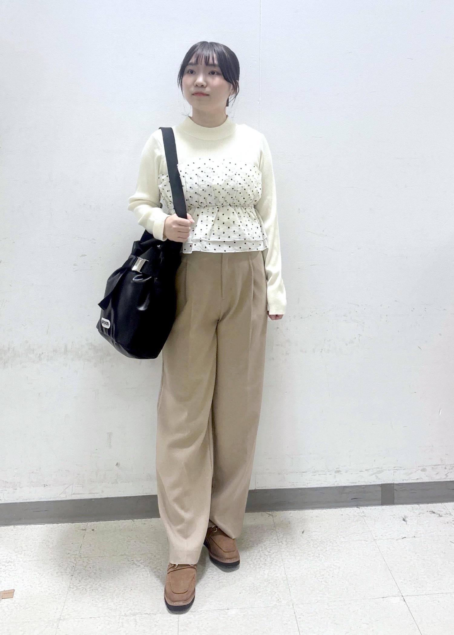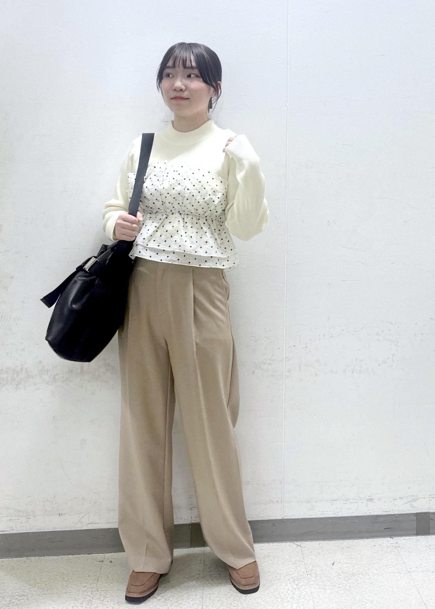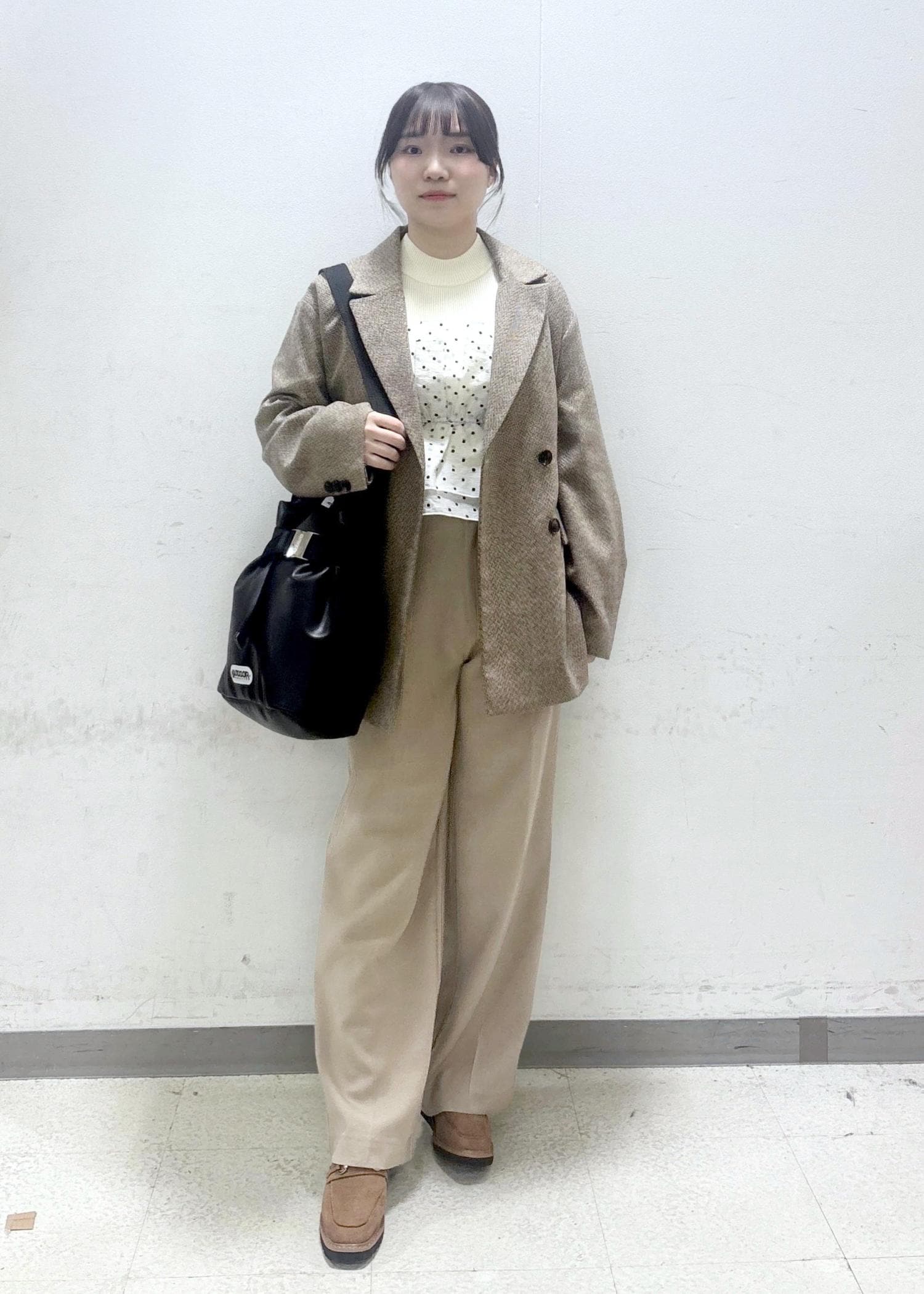トレンドのドット柄の入ったビスチェドッキングトップスで華やかさを出しつつ、ブラウンのジャケット、パンツ、ローファーでまとまりのあるオフィスカジュアルコーデに仕上げました!