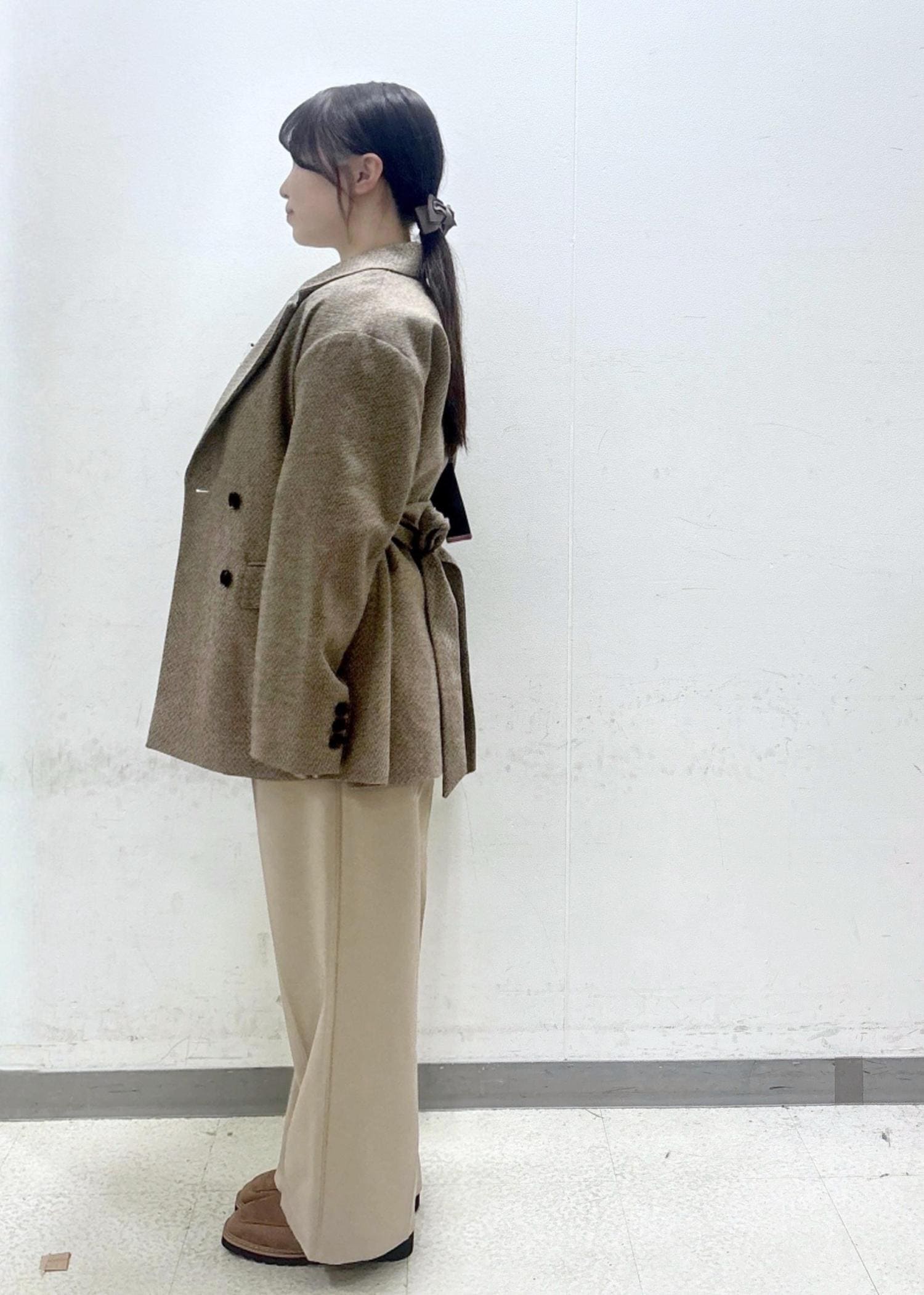 柔らかく軽い着心地のジャケットです。共地のウエストベルトがついているので、ウエスト部分にメリハリをつけることもできます!