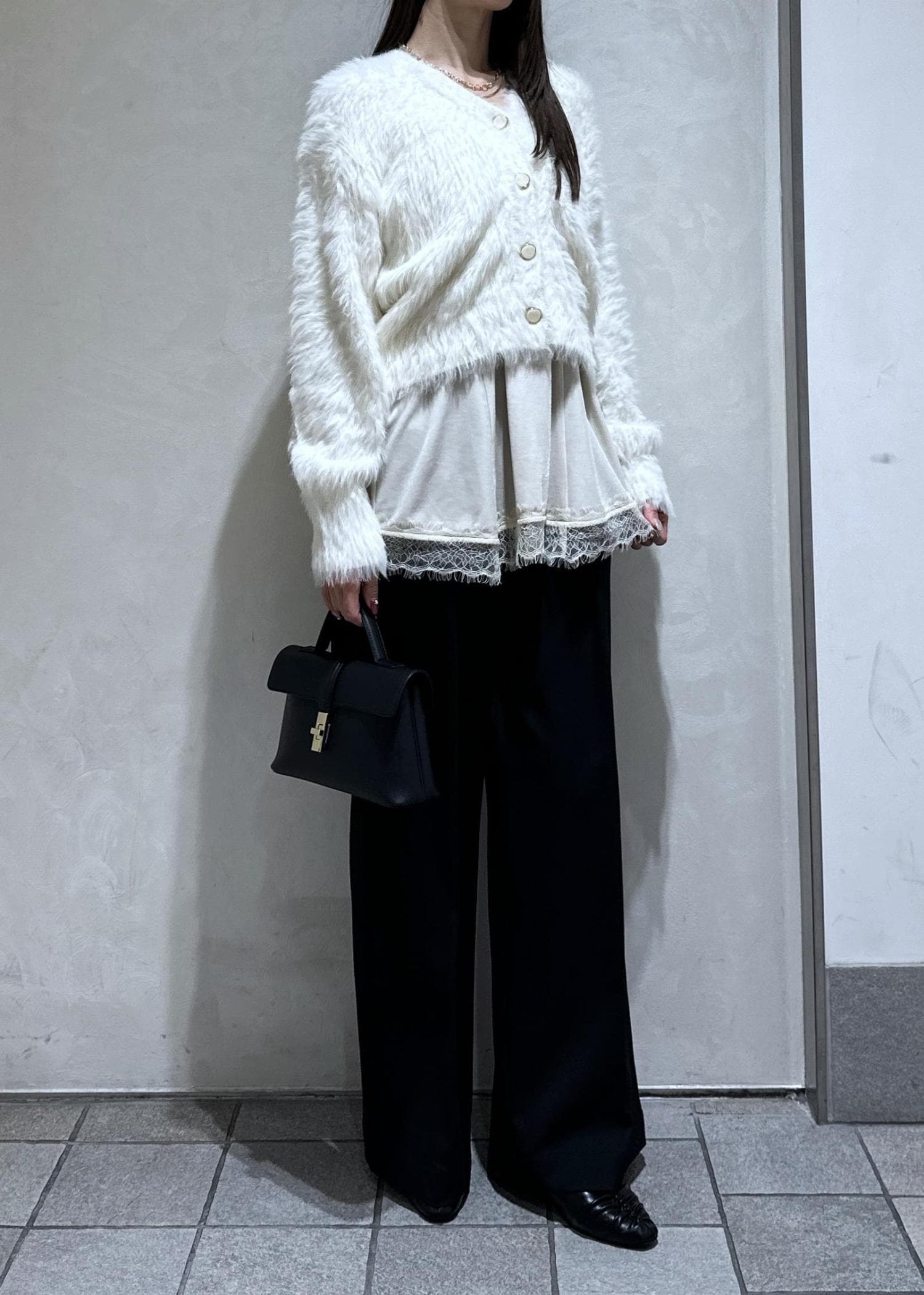 レースインナー×黒パンツで上品な大人っぽコーデです。