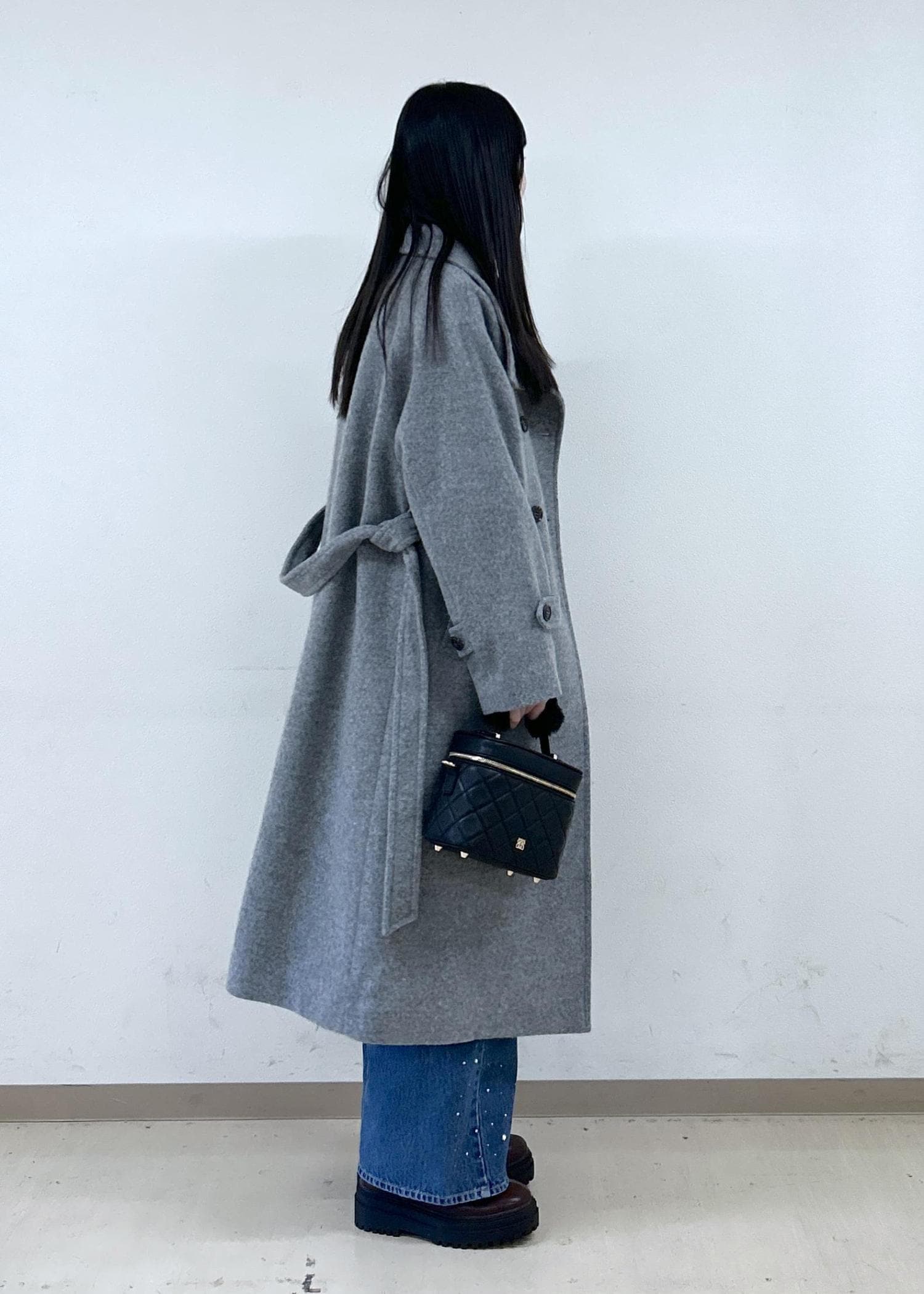 Sサイズでも下に厚手のニットや重ね着インナーが問題無く着られます。ベルトでウエストマークが出来るので着膨れしがちな寒い時期でもスタイリッシュに! -