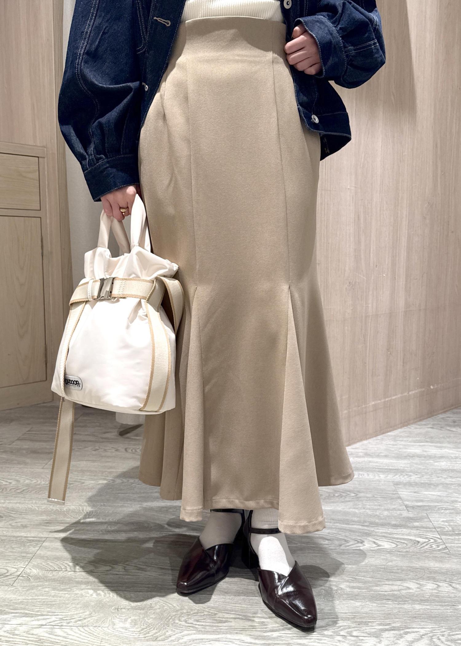 VIS美easyウーリッシュマーメイドスカート/セットアップ対応・イージーケアベージュ / M¥6,589レビュー身長157cm / Mサイズ着用 / ウエスト両サイドのボタンで調節しました。