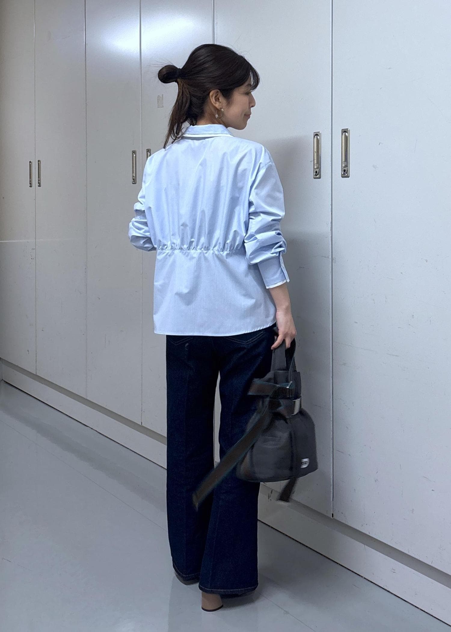 VIS無地&ストライプダブルカラーウエスト切り替えシャツサックス / F¥5,489レビュー156cm/F着用。着丈はお尻にかかる長さで着丈は手の甲が隠れます。ダブルカラーがポイントのシャツはシャーリングもあり一枚で着映えするデザイン。ポリエステルなのでお手入れが楽なのも嬉しい‼︎柔らかいブルーカラーでイエベでも合わせやすい印象です!