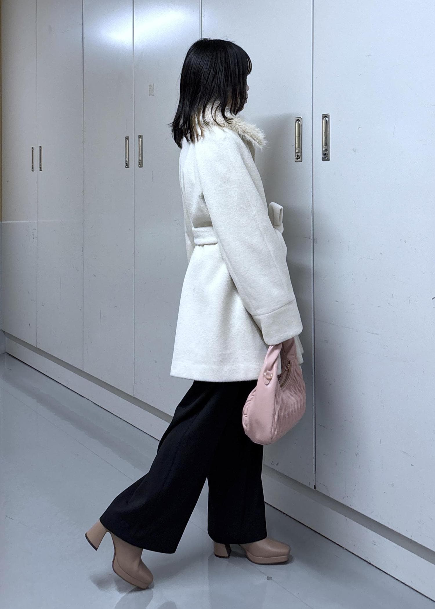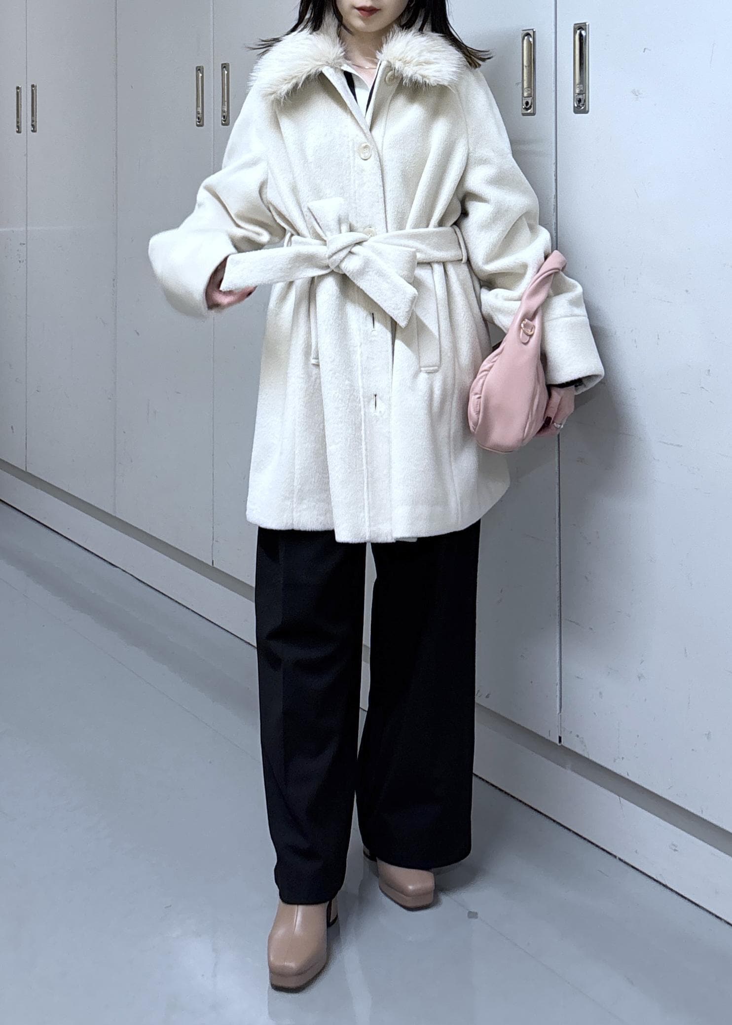 ファー付きのコートはウエストベルトを前でリボン結びでフェミニンな印象で着てみましたが、アウターを脱ぐとモノトーンなカジュアルコーデになります。
