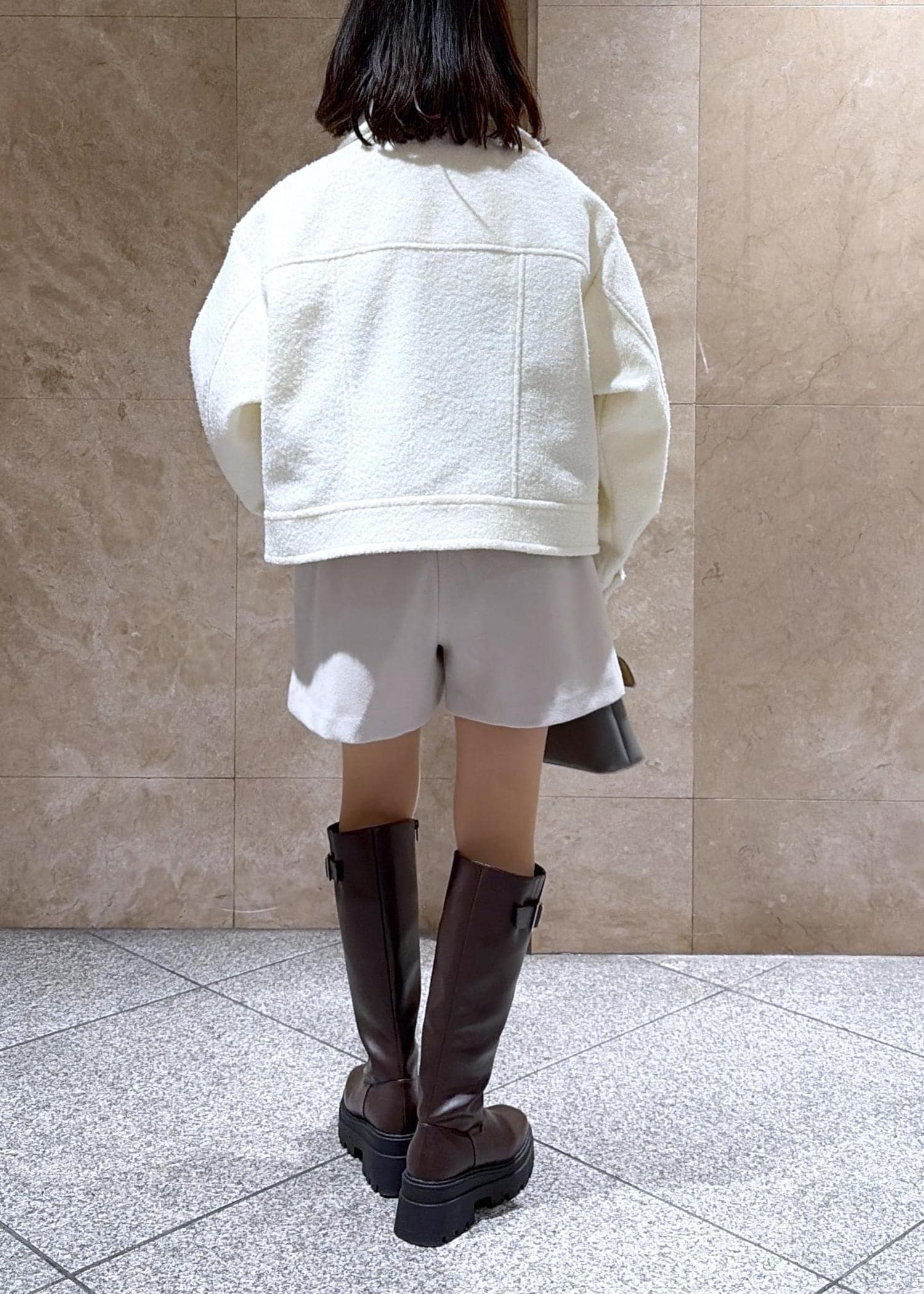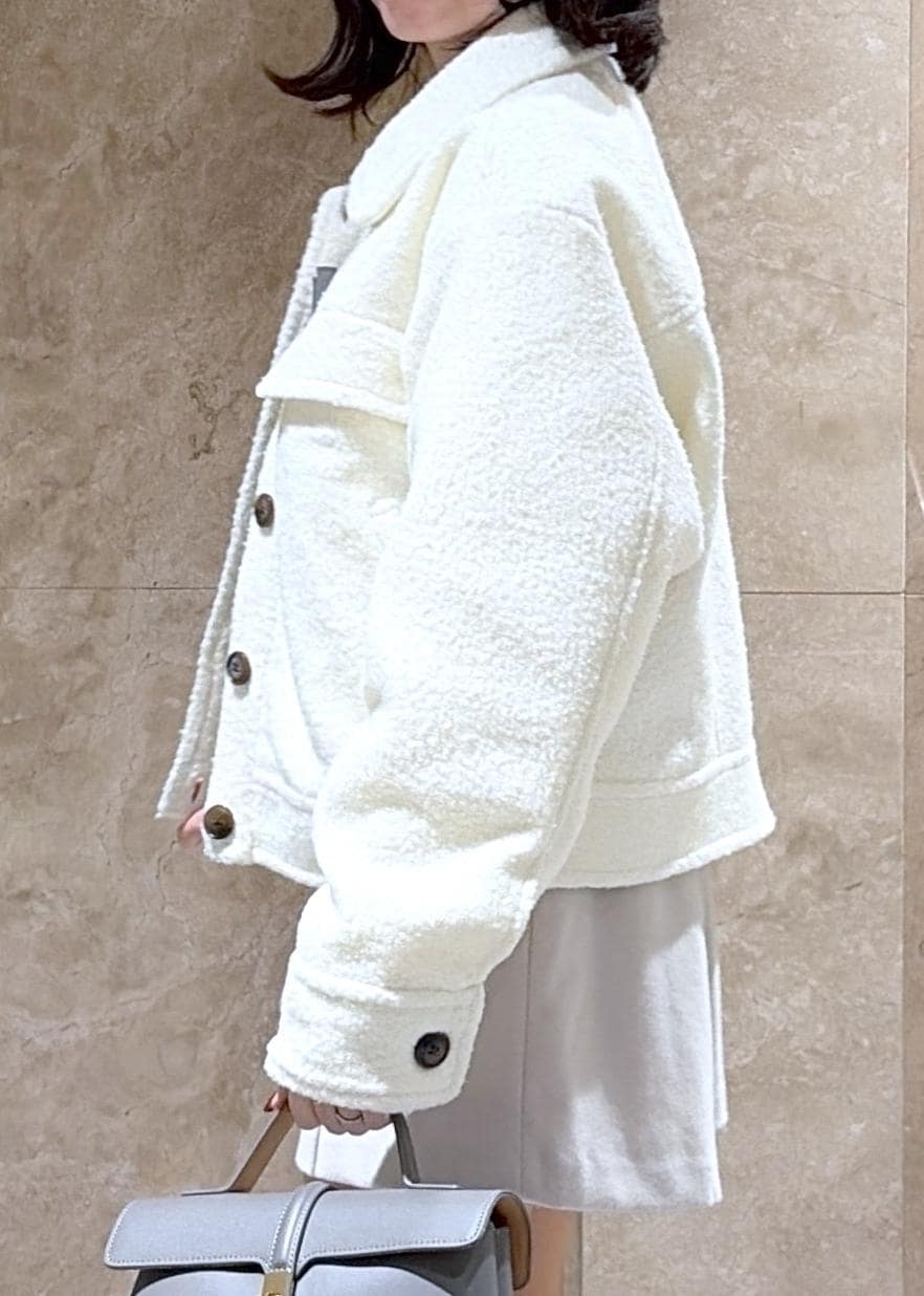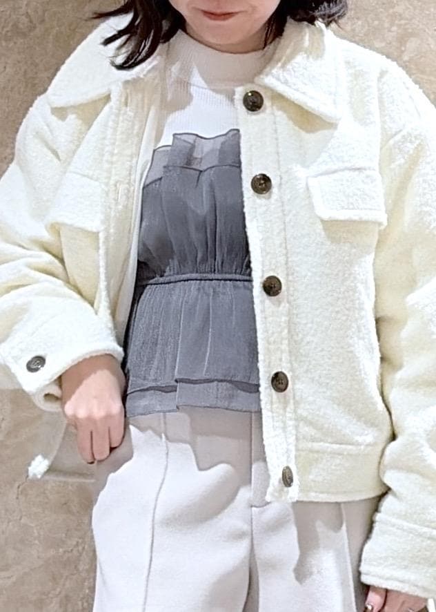 ショート丈なのですが、肩周りや袖は少しゆとりがあったので、中に分厚めのニットやインナーを着用しても大丈夫です◎