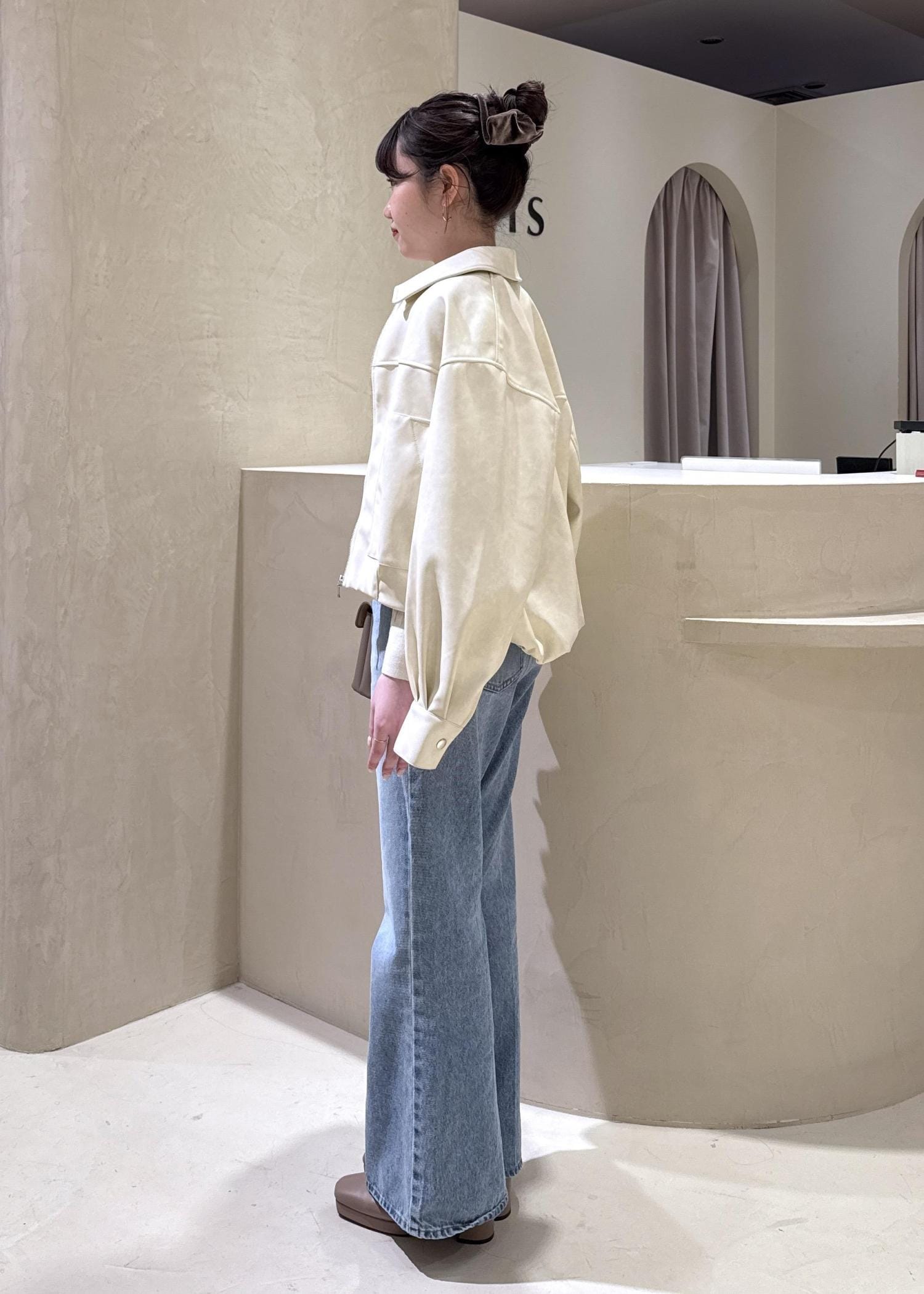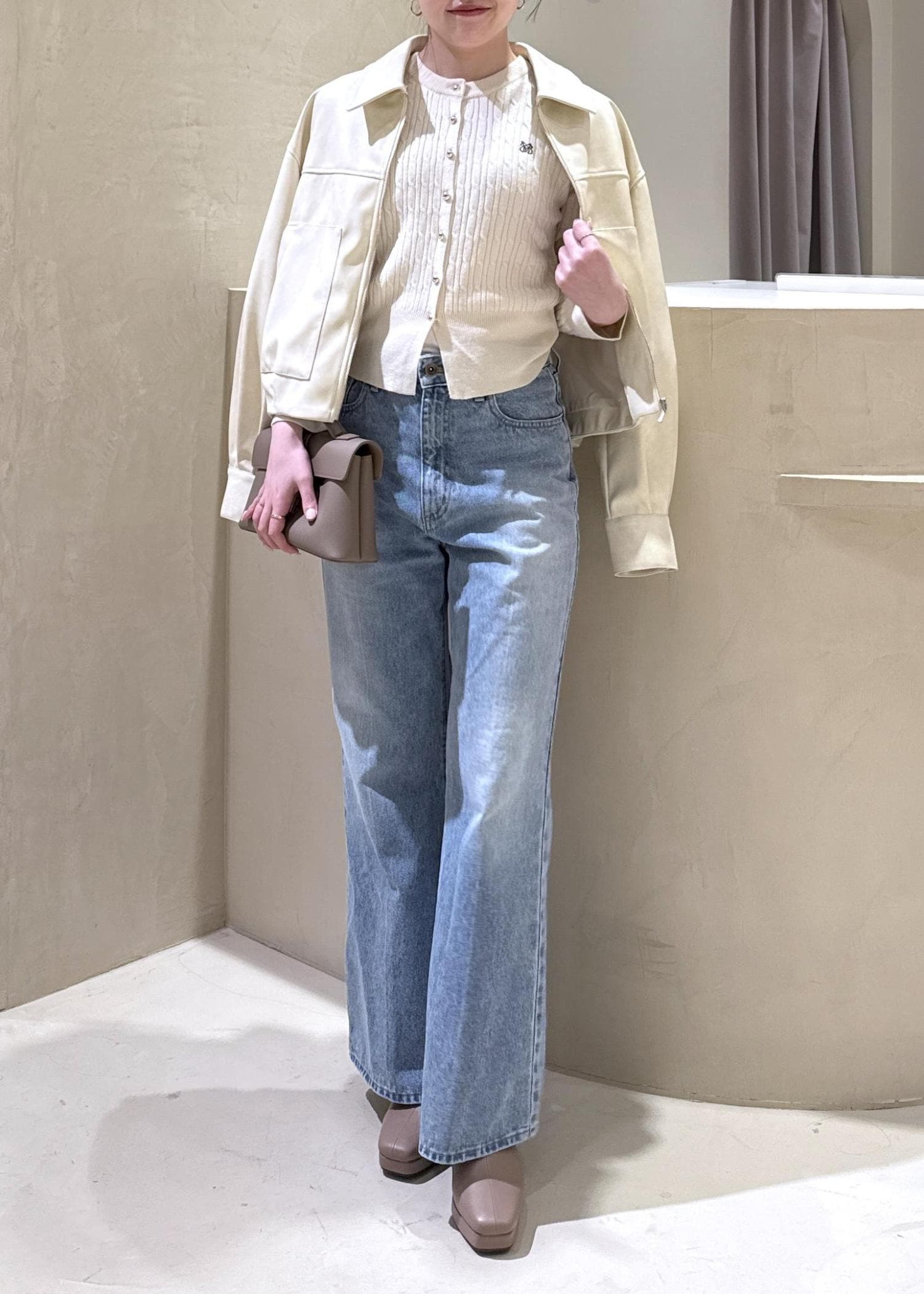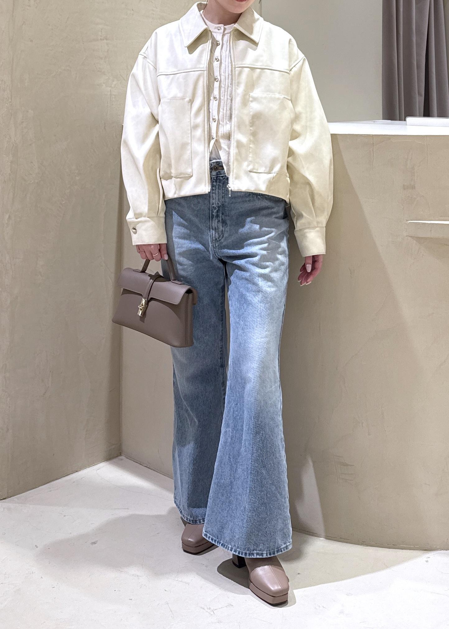 春らしいクリームカラーのブルゾンをメインに、美シルエットのフレアデニムを合わせて、小物はベージュで女性らしい印象に♡春のお出かけきれいめカジュアルスタイル!