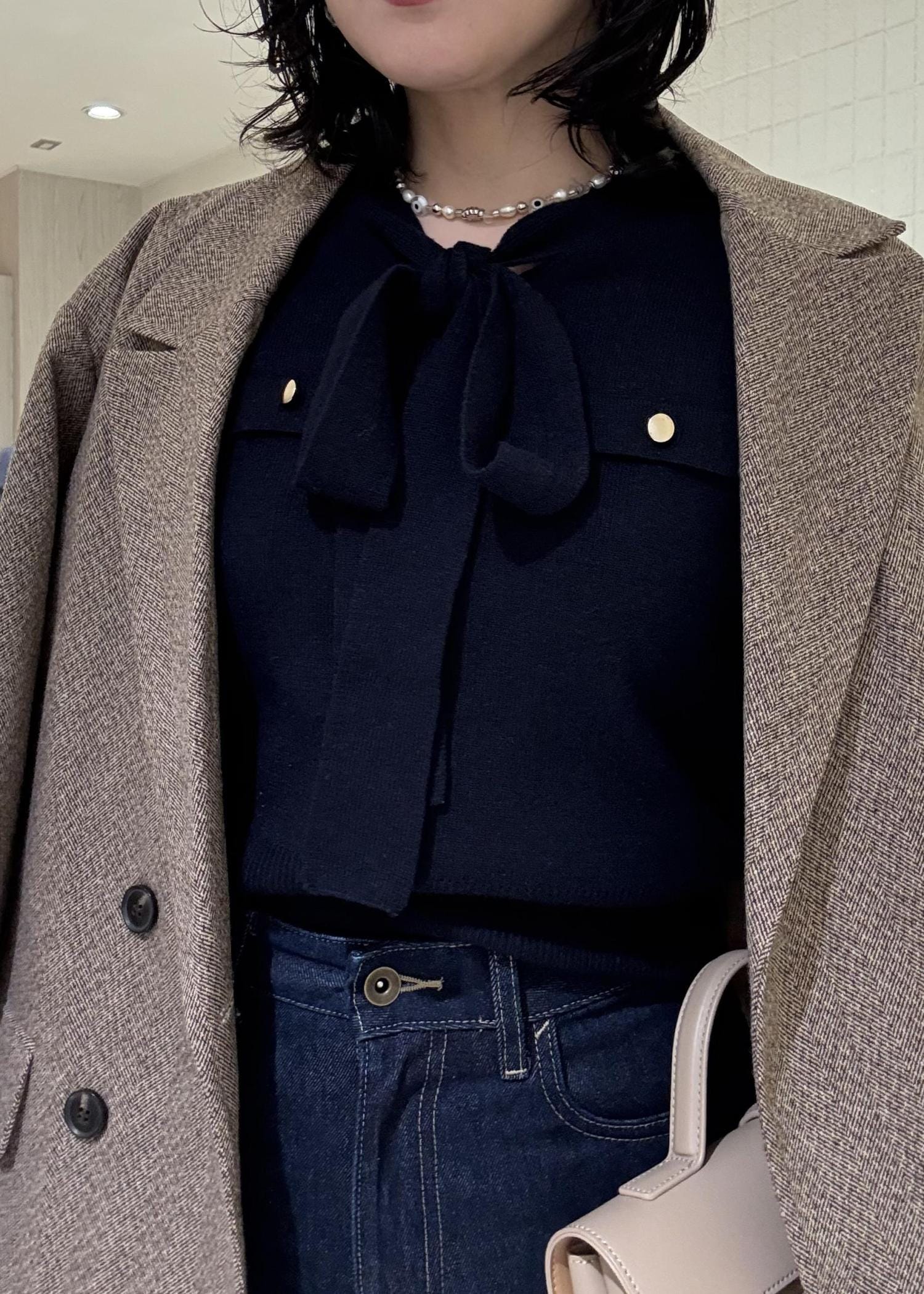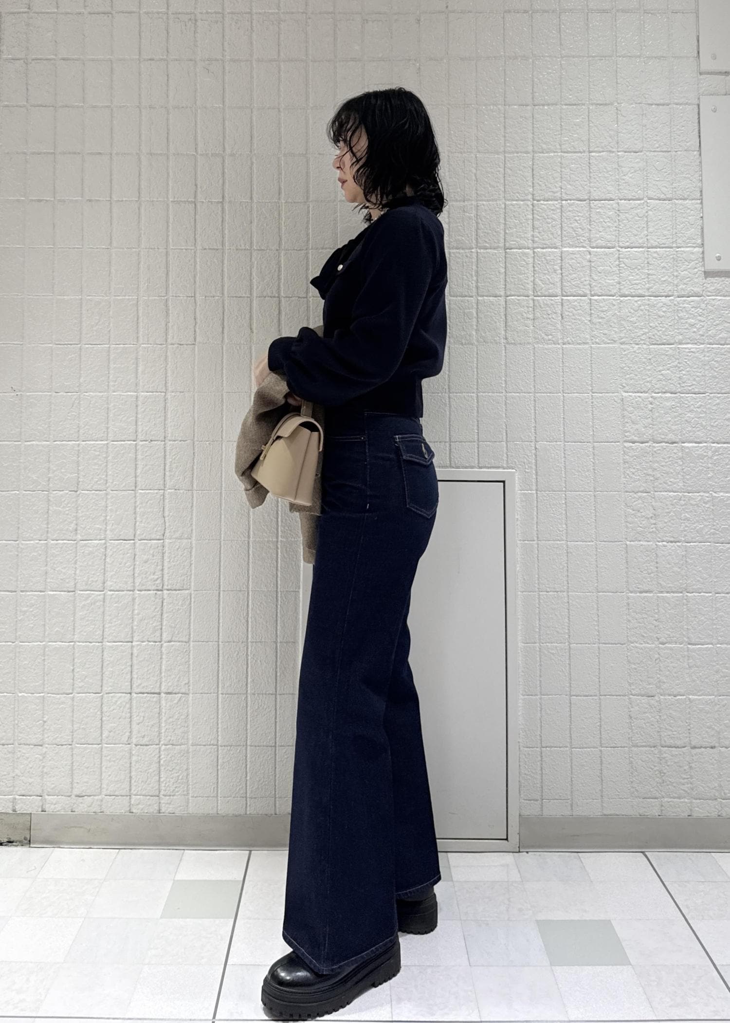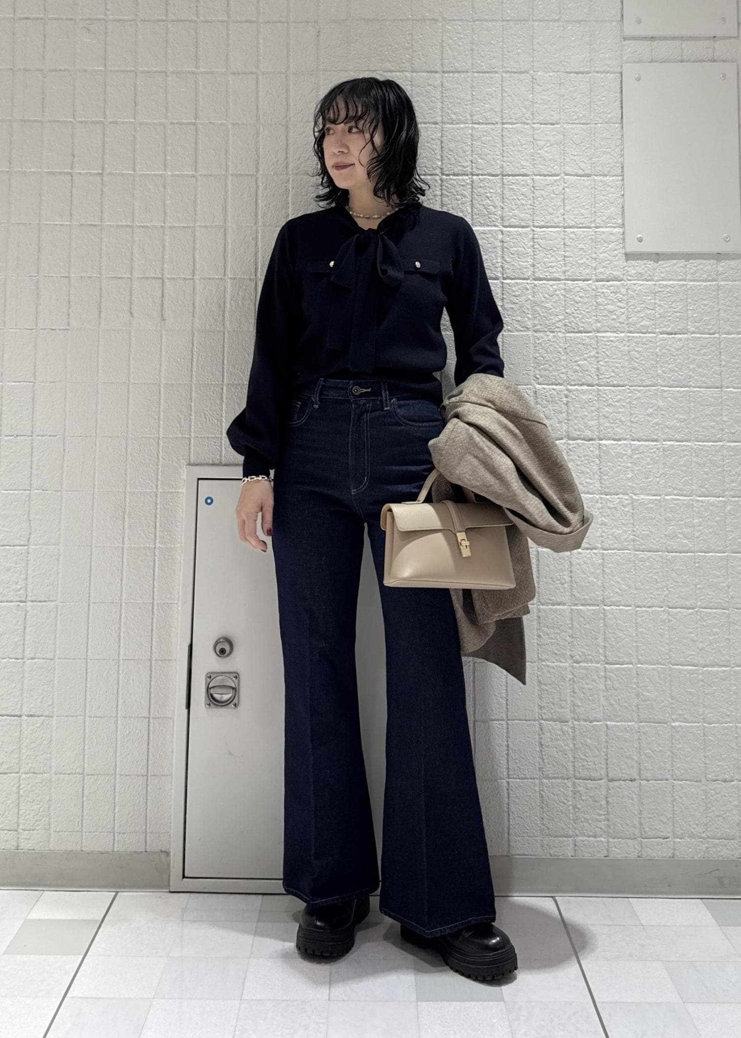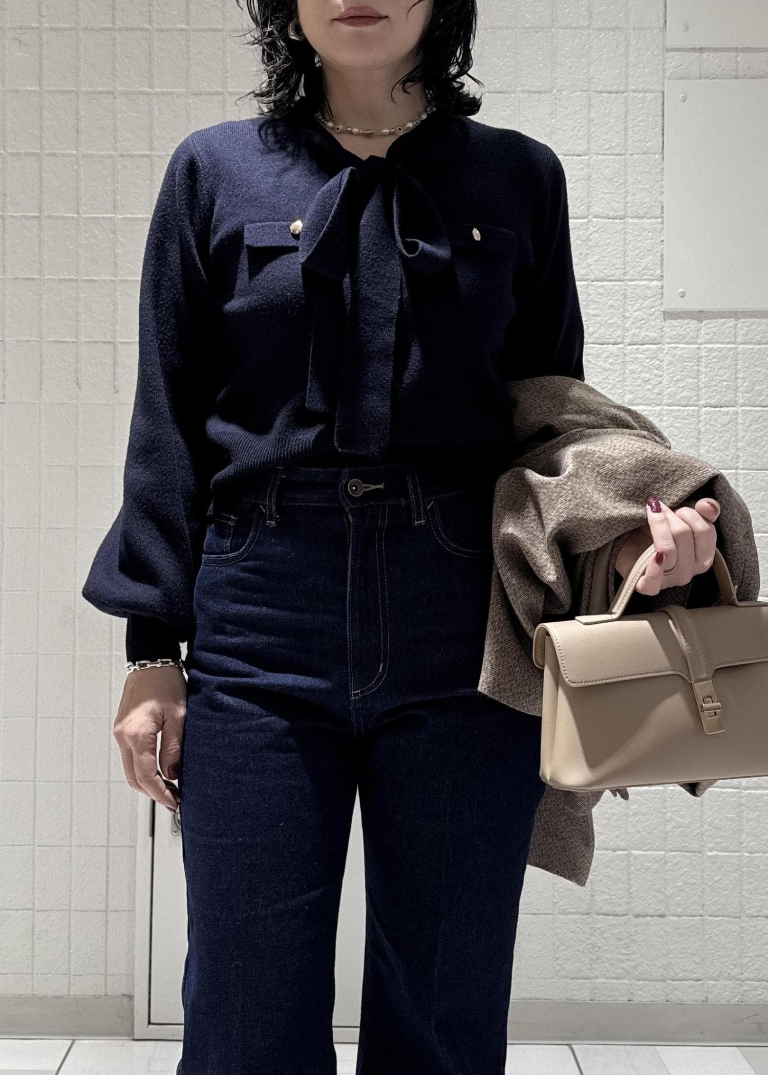 ノンウォッシュデニムはカッコよくスタイリングしたいと思いあえてブラックのニットを合わせてみました◎ジャケットやアウターで色を変えてあげると春らしくなります♪