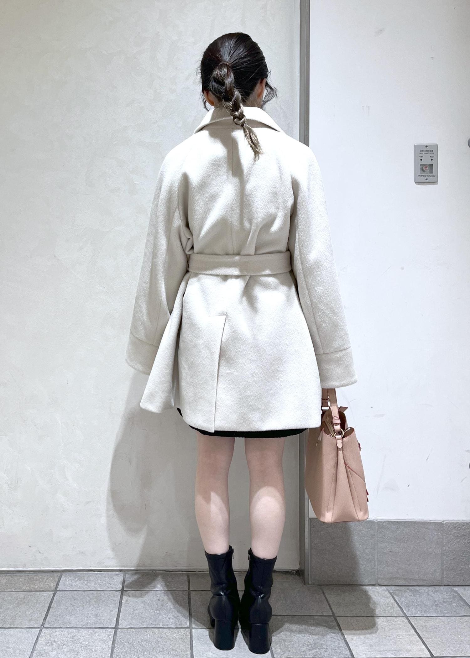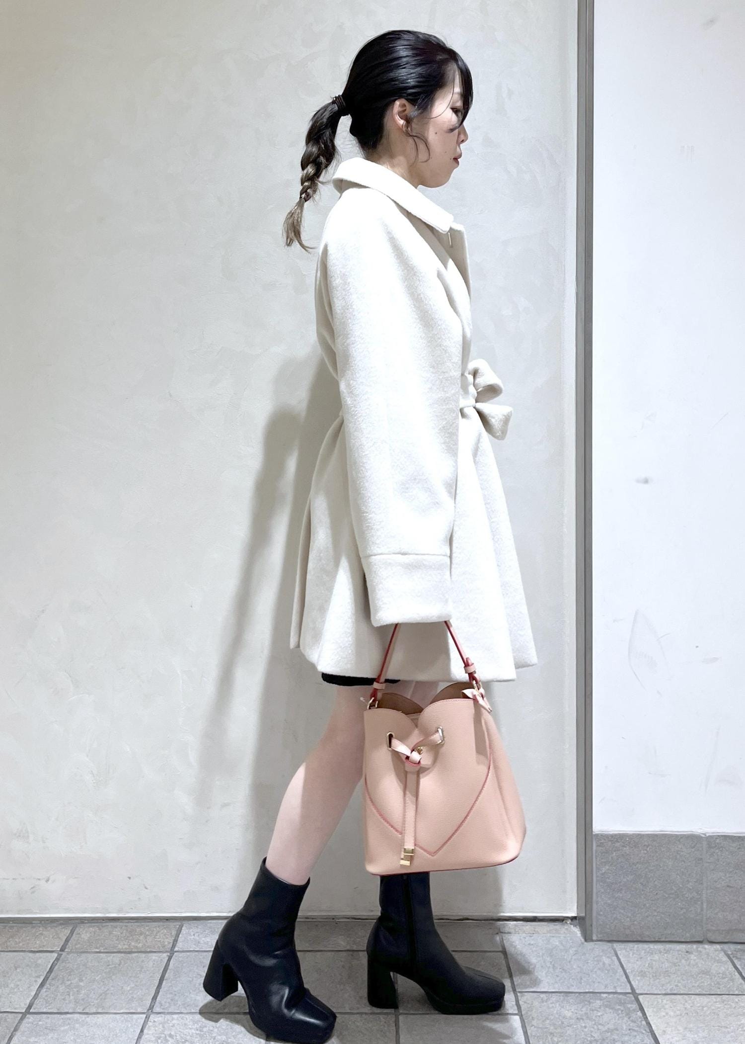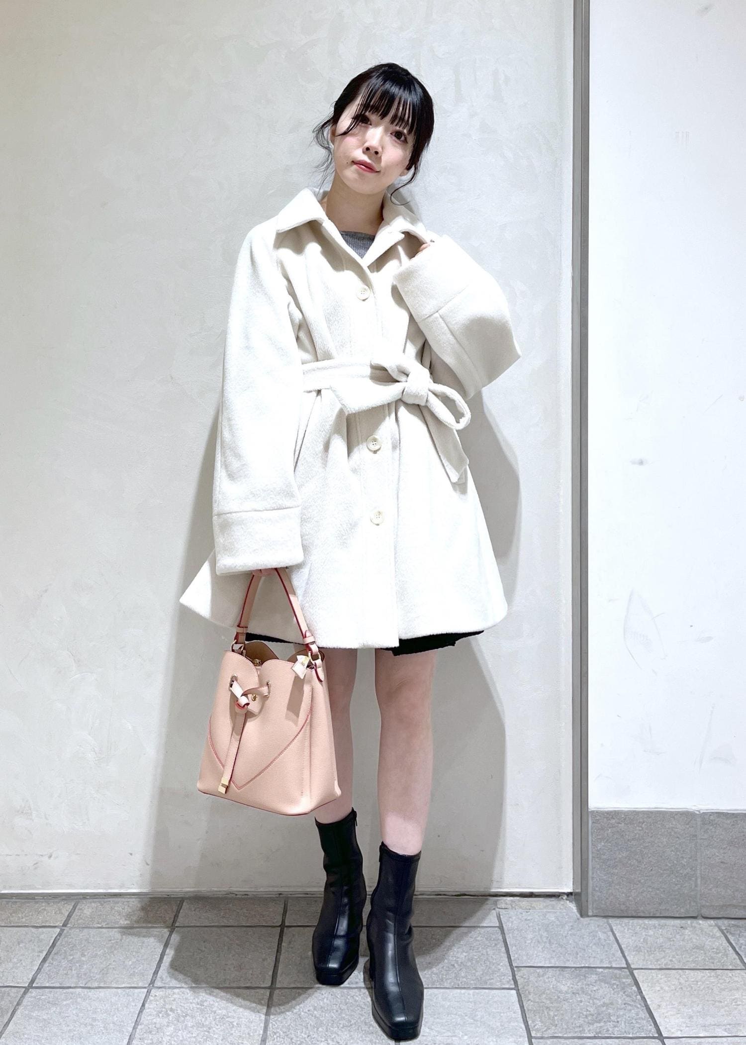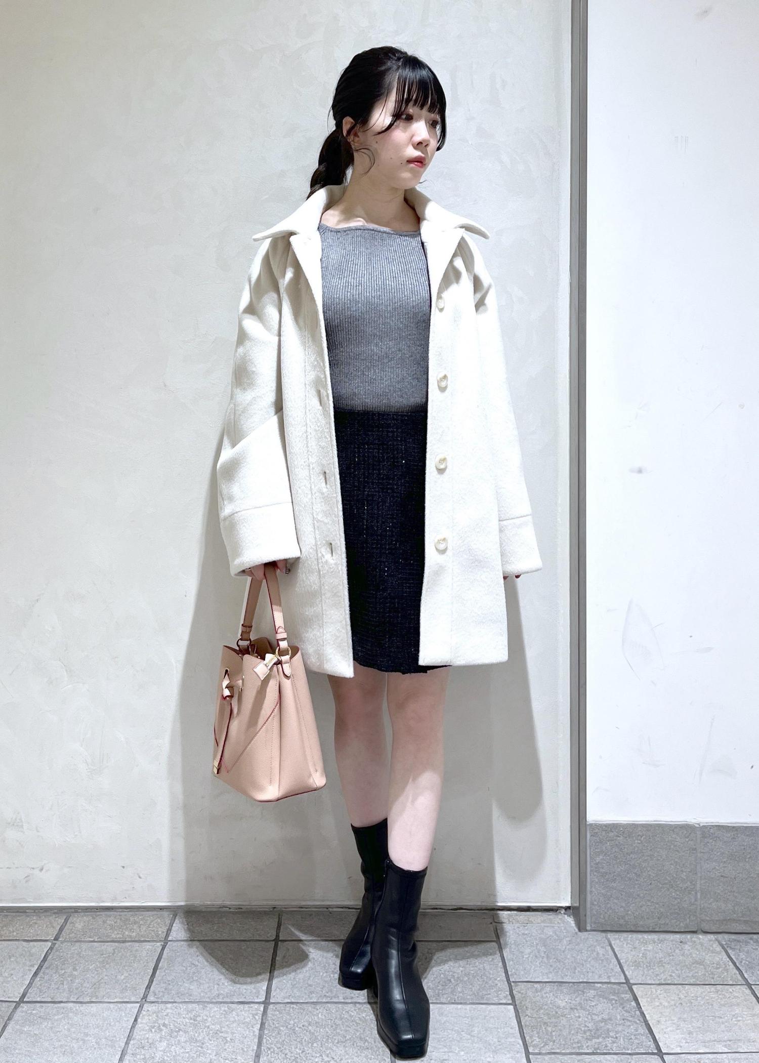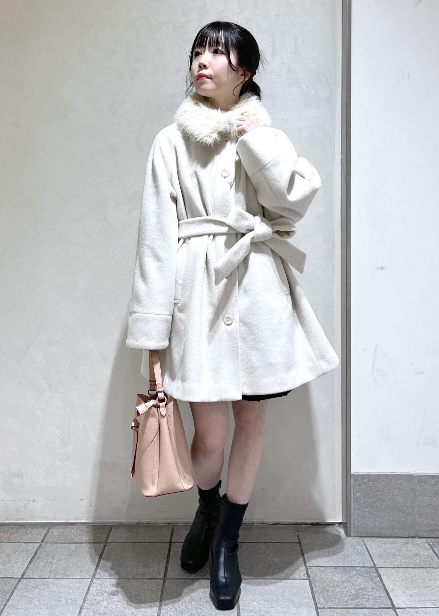 襟のファーがかわいい綺麗なシルエットのミディアムコートをミニ丈と合わせてデートコーデ組んでみました!
