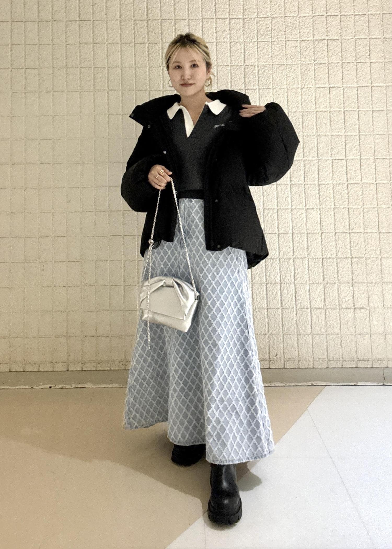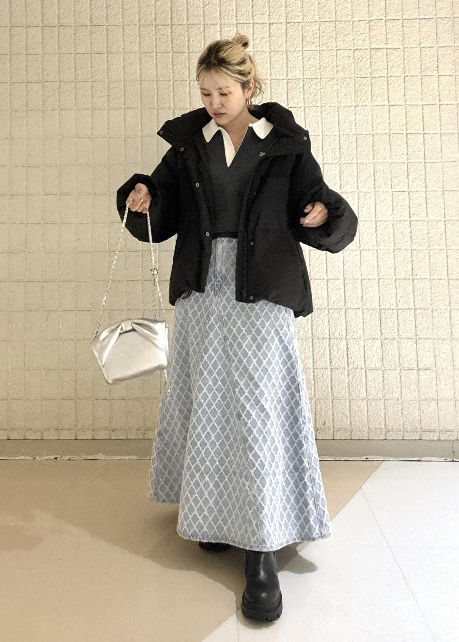 カバンは小ぶりのシルバーにする事ででブラックとライトブルーを馴染ませる役割になっています。