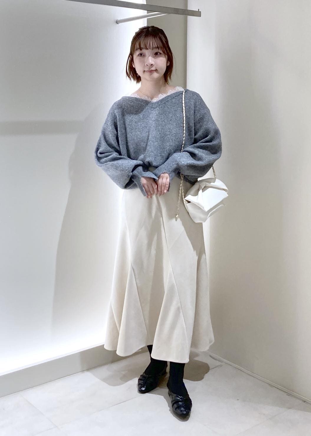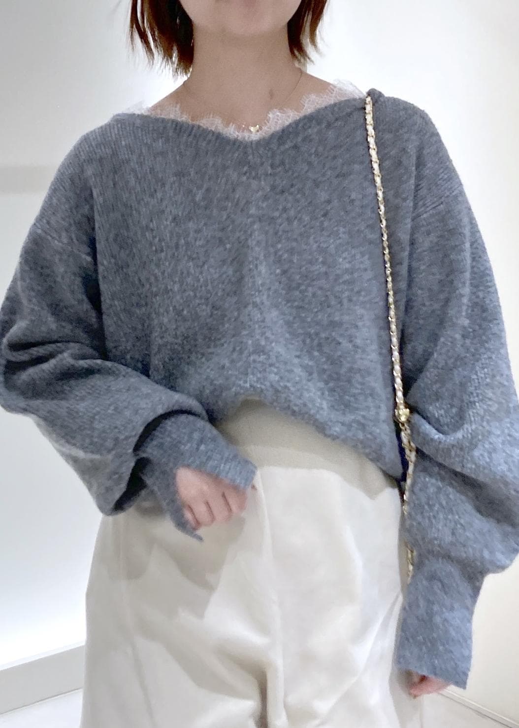 Vネックで首元がしっかり空いていますが、厚めのニット生地にレースが付いているので貧相に見えずにスッキリ感を出して着ることができます! -