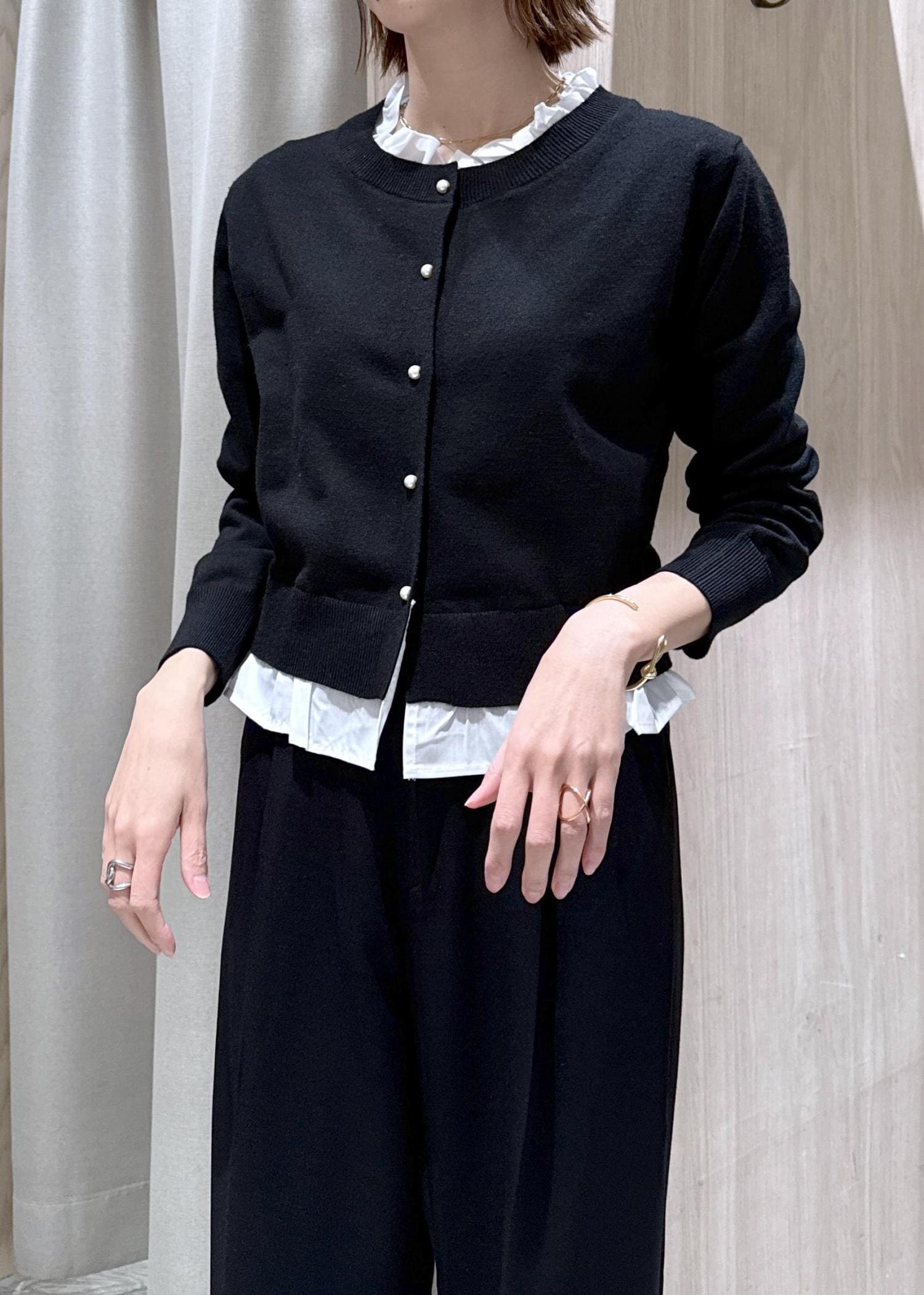 VIS【美得】フリル襟ドッキングニットカーディガントップスブラック / F¥5,929レビュー身長166センチで腰下のコンパクトな長さでした。