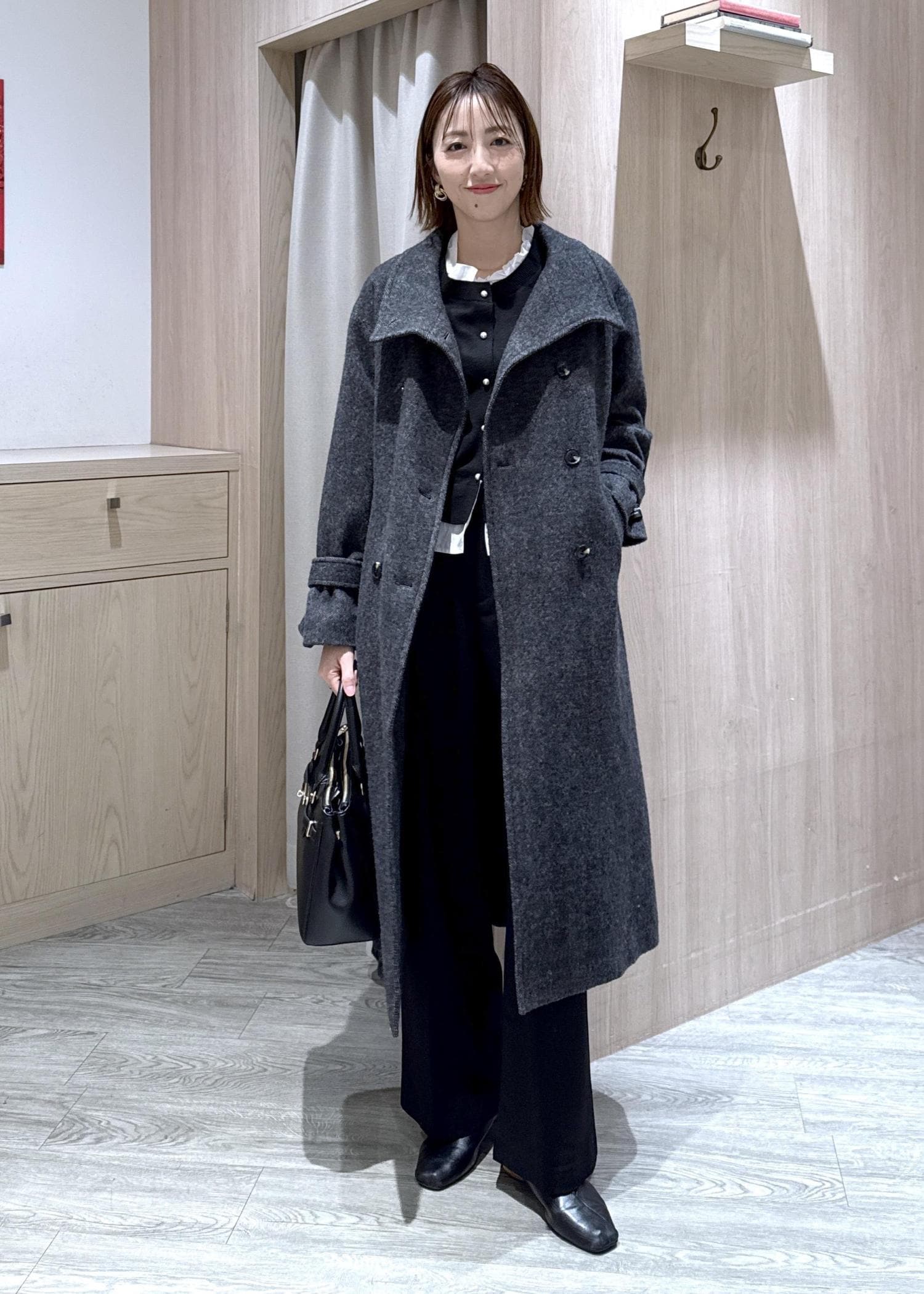 VIS尾州シャギースタンドカラーロングコート/静電気防止・WEB限定PS・TMサイズチャコール / M¥15,323レビュー身長166センチでMサイズ着用、ふくらはぎの長さでした。