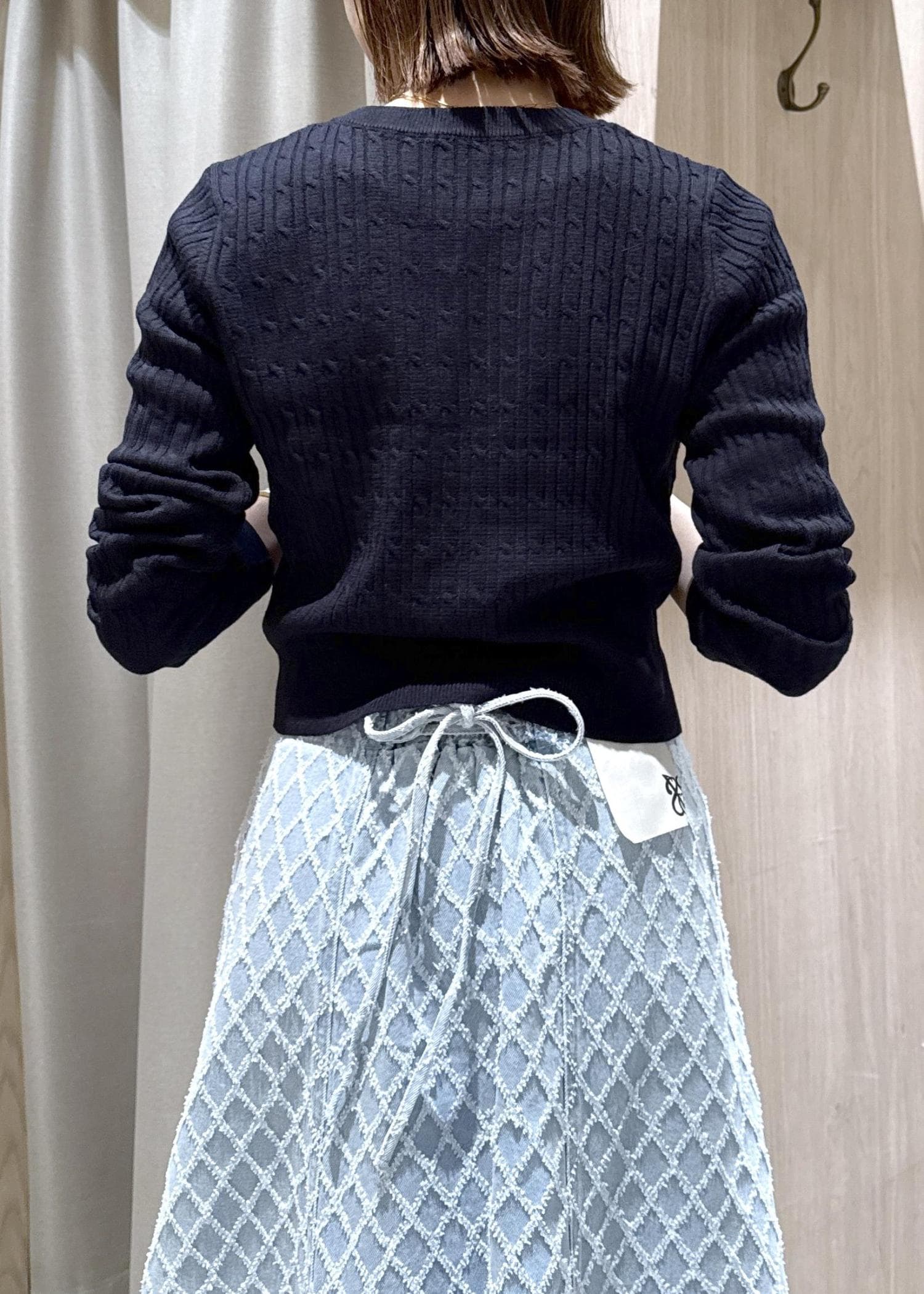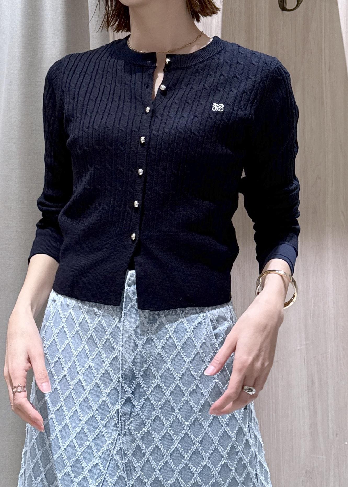 ハイゲージのケーブル編みのカーディガンなのでオフィスカジュアルにもピッタリ!