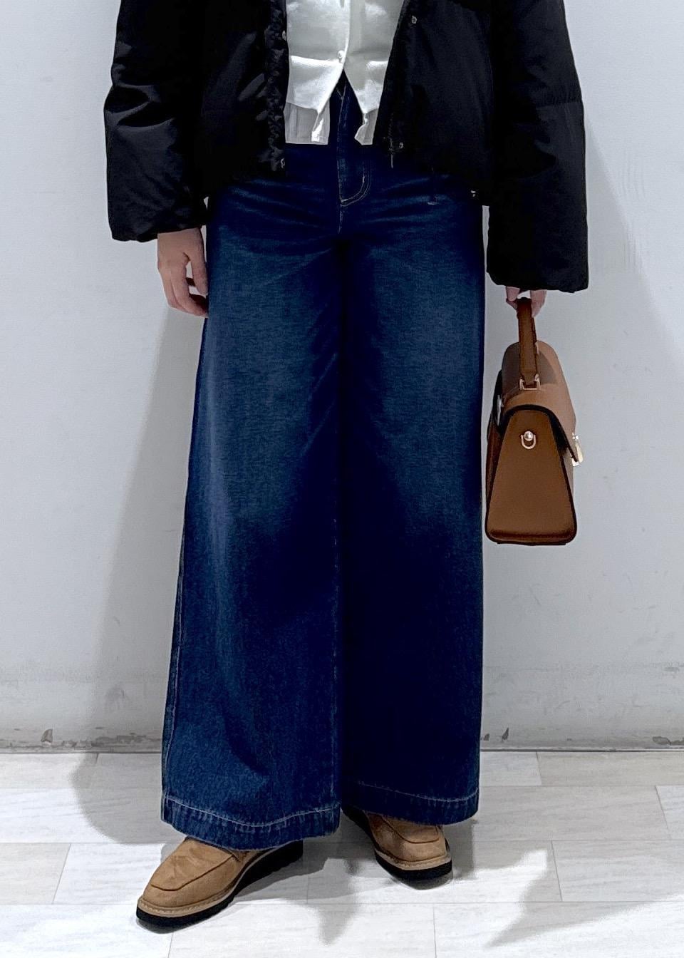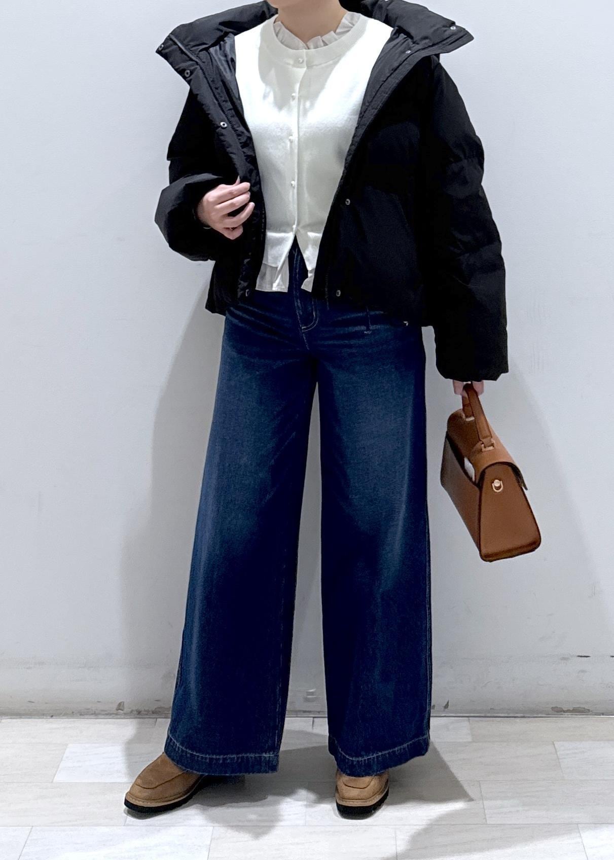 今回は1枚で重ね着しているかのように見えるフリルドッキングニットのトップスに、ワイドデニムパンツを着てカジュアルなスタイリングにしてみました。綺麗めカジュアルに、通勤でも使えるようシンプルだけどパールボタンで女性らしく◎